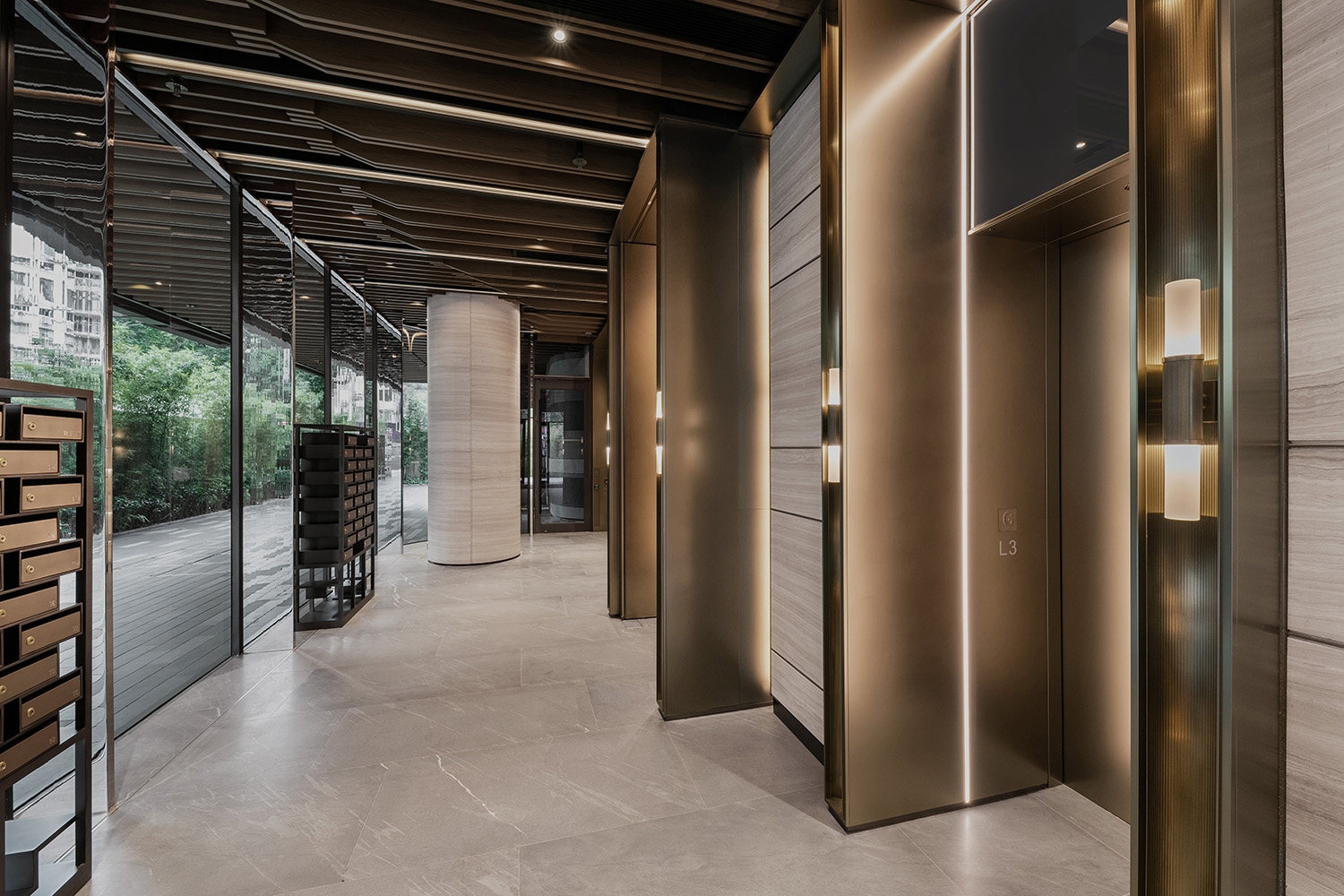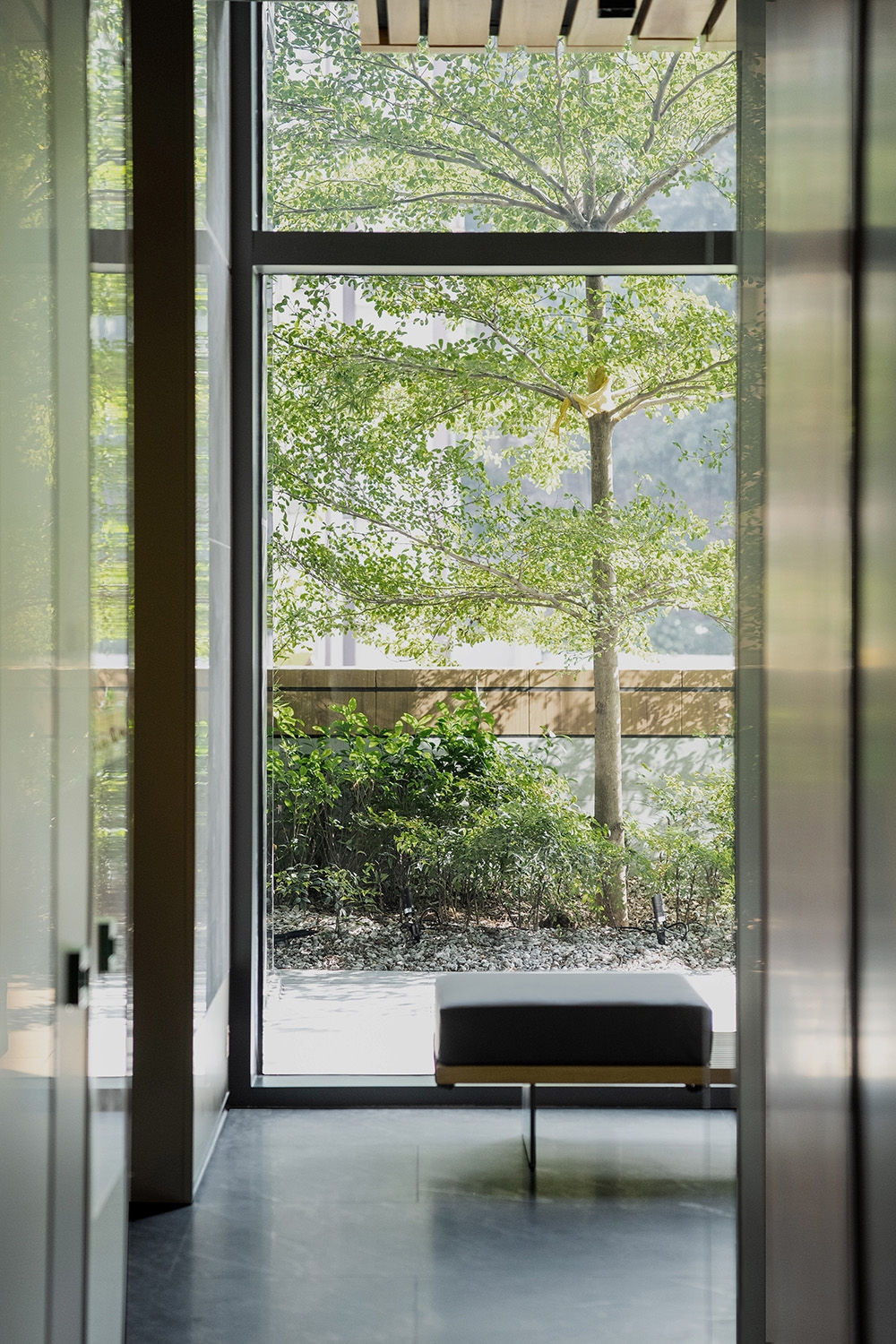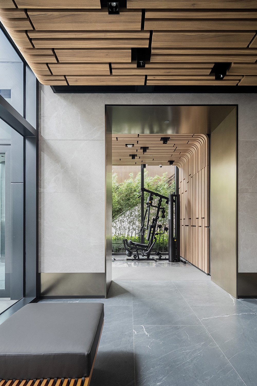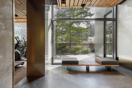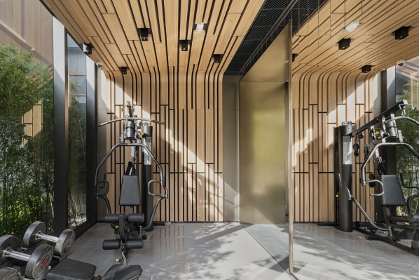 The lobby's biophilic elements set a serene tone, while thoughtfully designed spaces encourage movement and social interaction. An expansive gym promotes an active lifestyle, while the cozy lounge area and function room overlooking the lush courtyards provide versatile spaces for residents to gather and unwind. Mirrored ceilings, glass finishes, and the building's evolving landscape create a sense of lightness and connection to nature throughout.