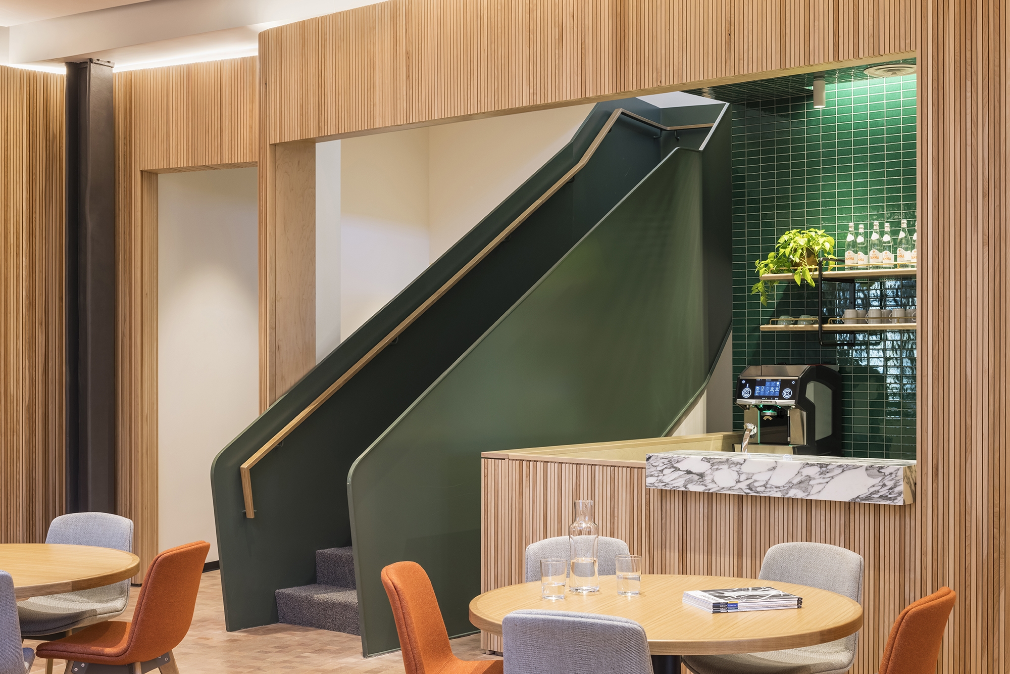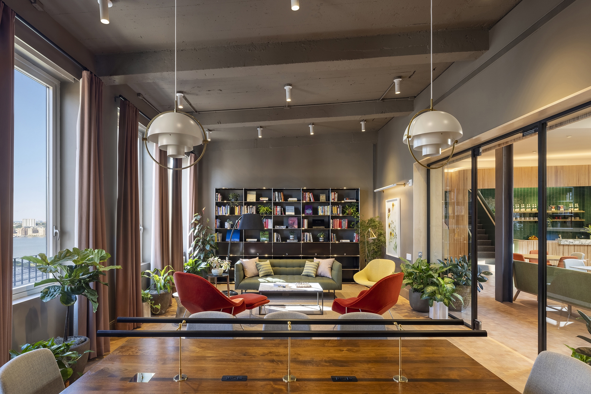 The renovation of a 17,000-SF penthouse office provides a new shared workplace that houses multiple distinct companies sharing common amenities. Designed to encourage people back to the office and to share ideas with other peers, it features a central “piazza” that opens onto generous shared and individual spaces such as conference rooms, library, lounge areas, a coffee bar, and incubator rooms.