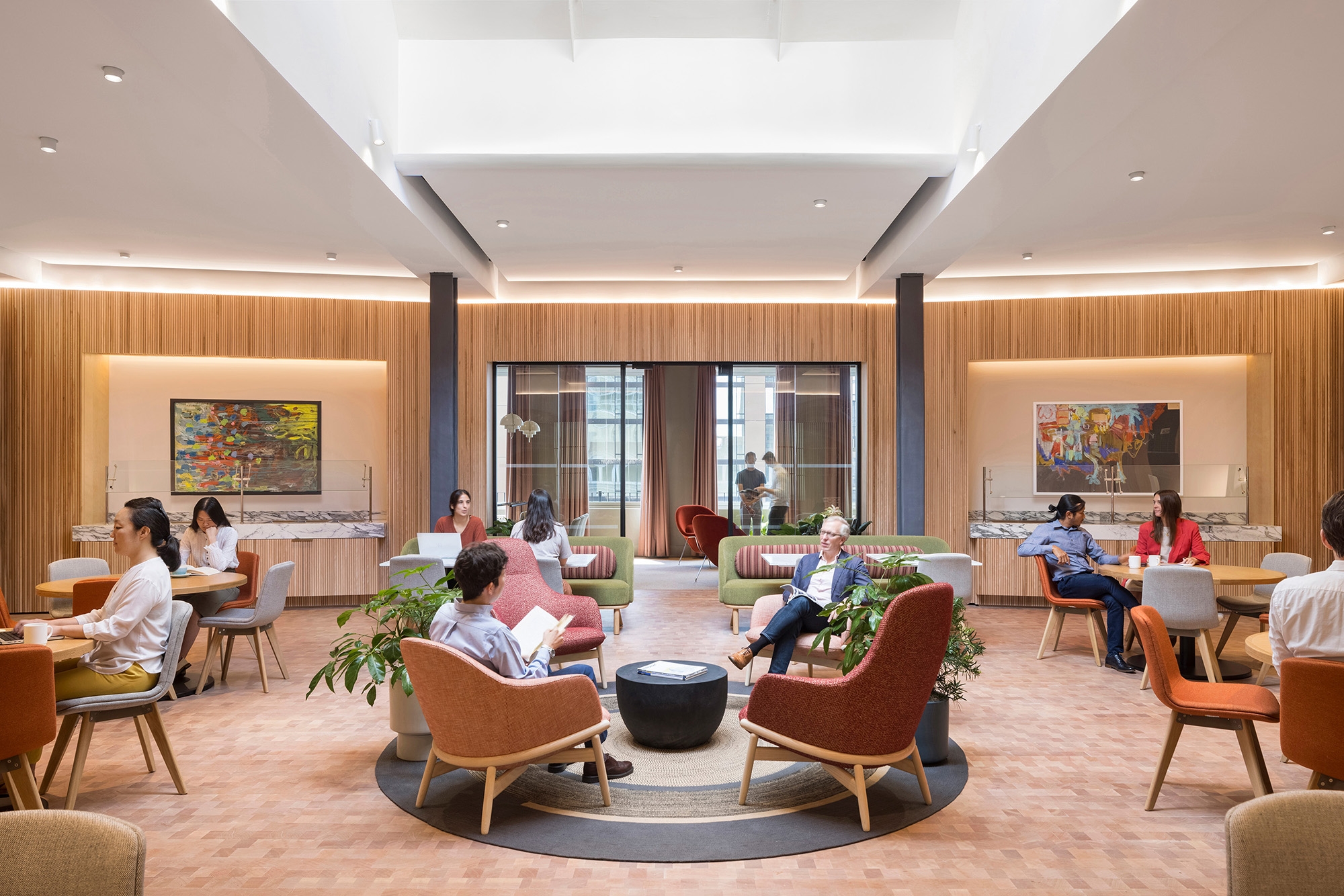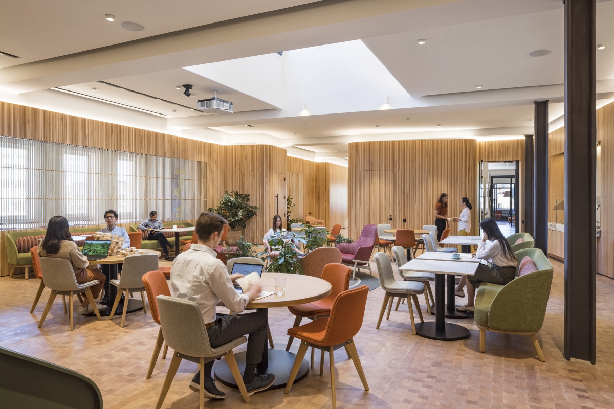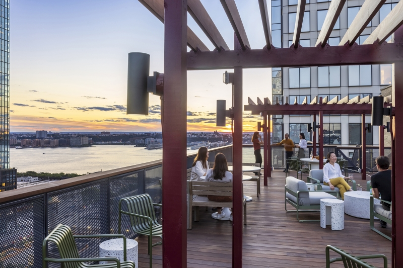 A library space and lounge feature rich, textured furnishings and materials that bring warmth, comfort, and personality to the space. Intimately sized focus rooms at the library, each activated by unique wallpaper, allow for uninterrupted quiet work and study. A shaded rooftop for working and socializing is accessible from the central piazza.