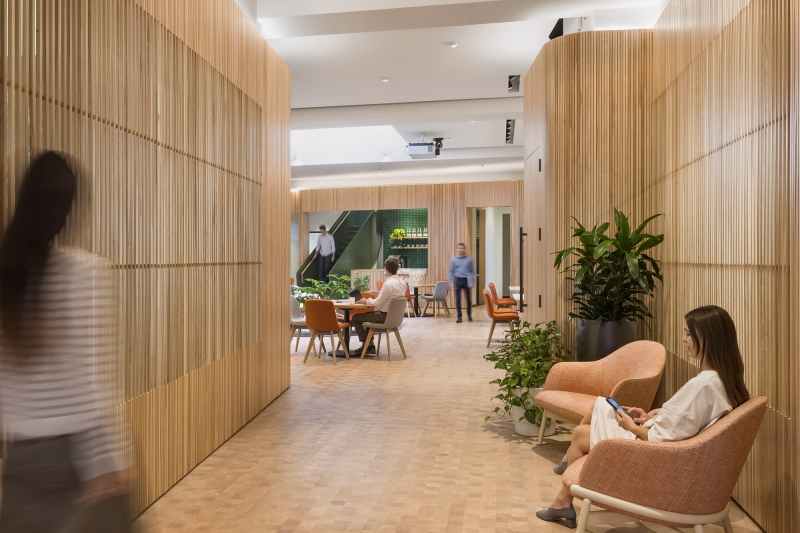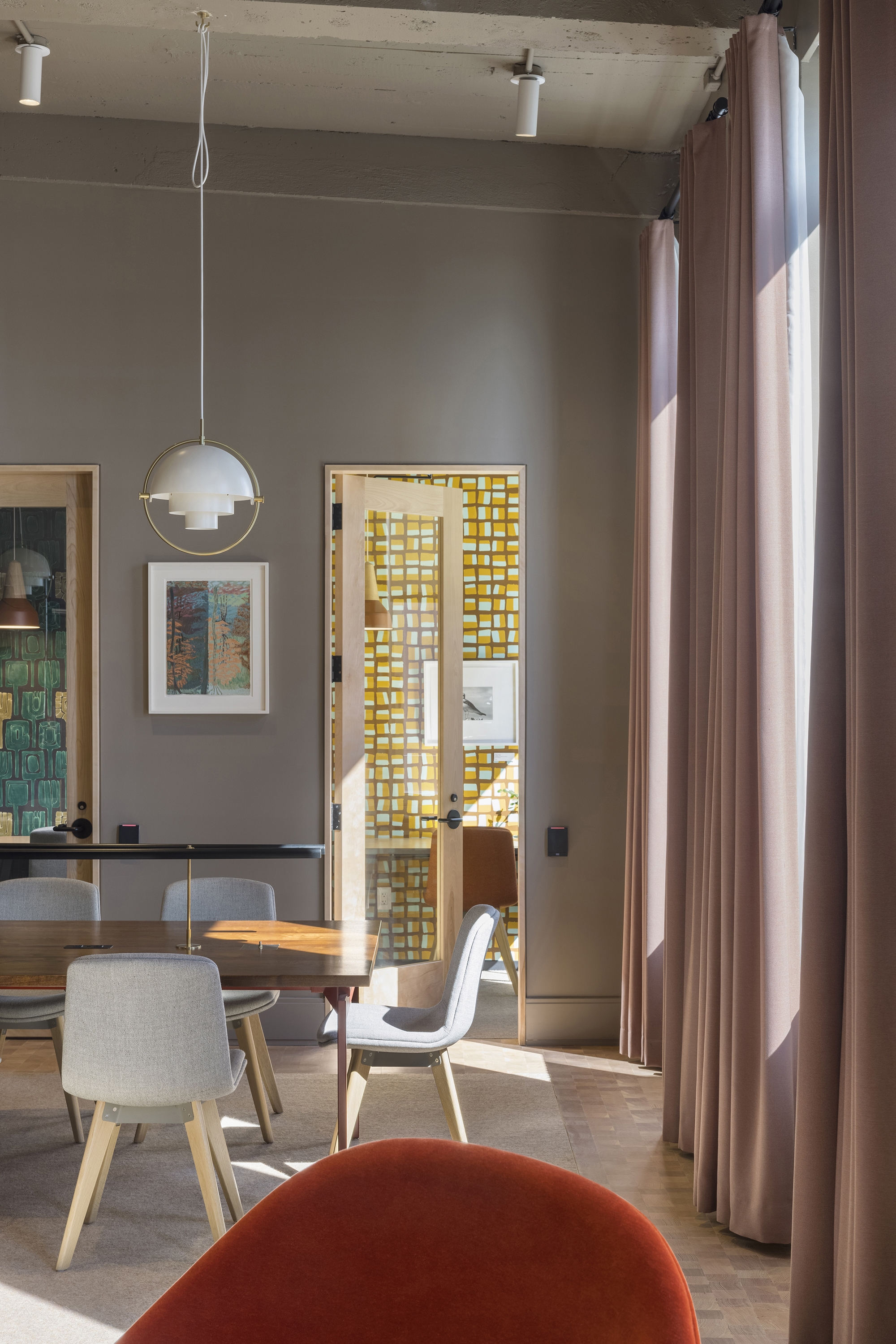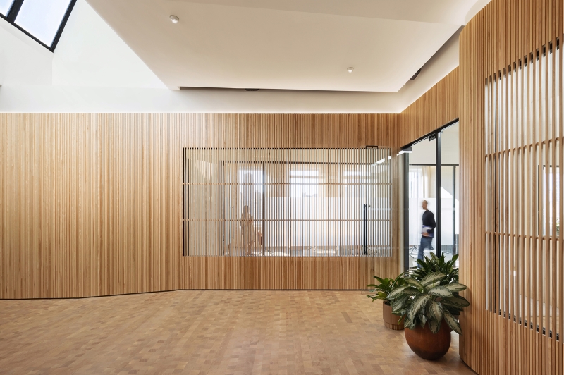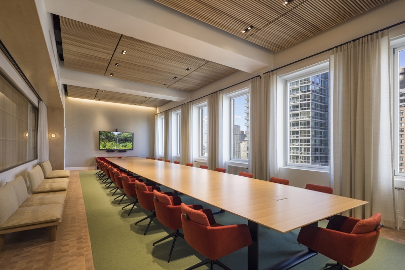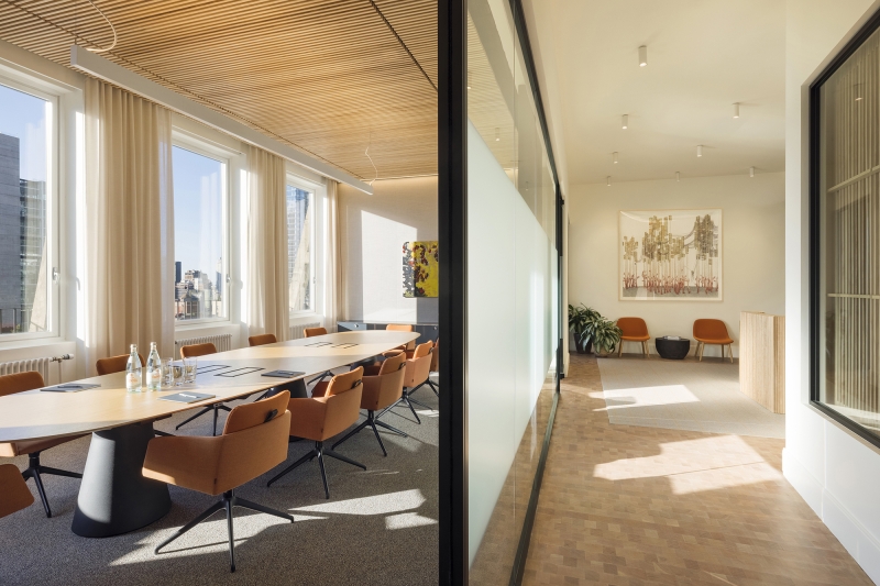 Natural light from four exposures and large skylights floods into the spaces. Multiple layers of glass walls and partitions allow for the light to enter deep into the interior. Wood louvered walls unify the disparate firms occupying the spaces and tie the workplace together. They act as both filter and screen, balancing transparency with privacy while adding warmth and acoustical properties.