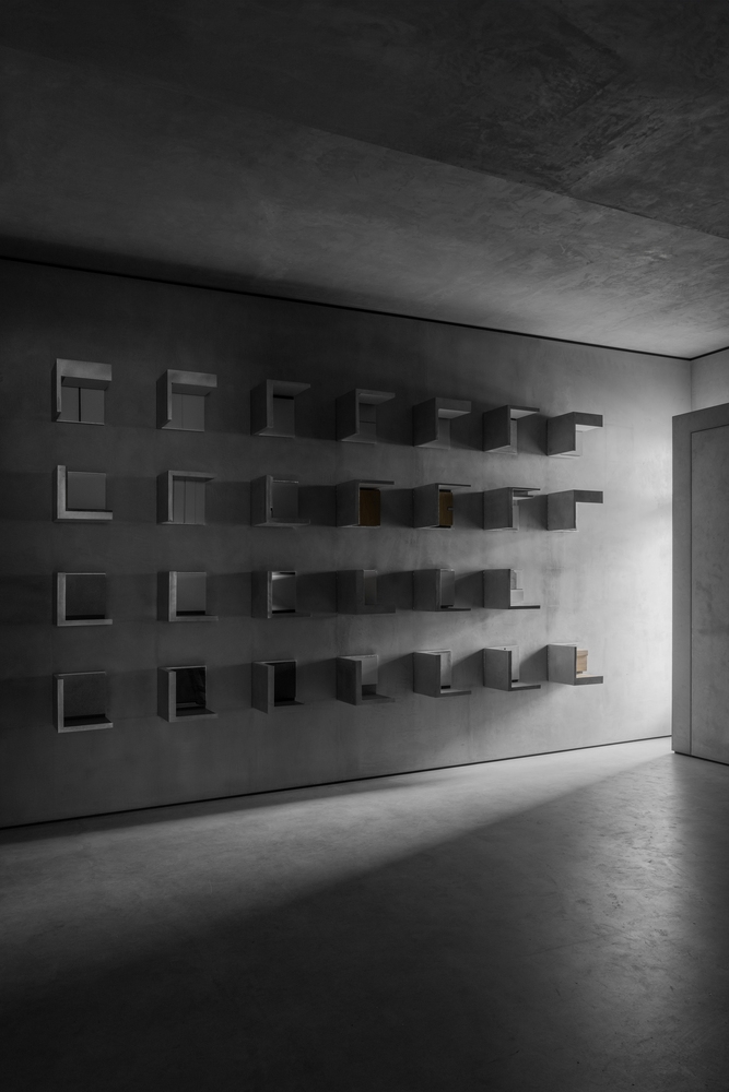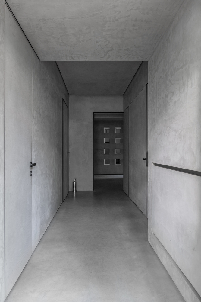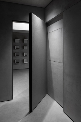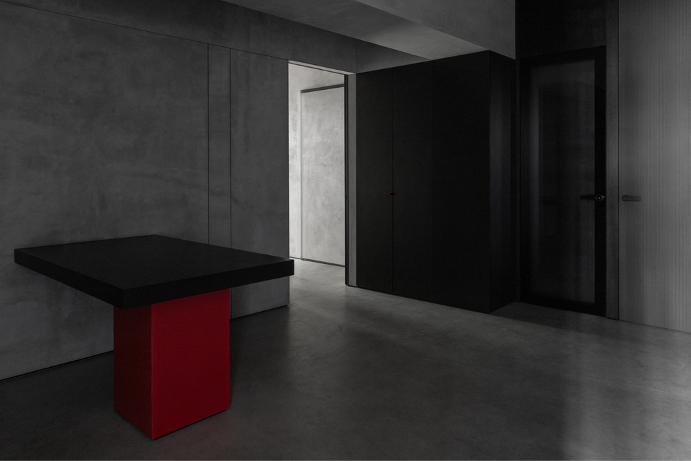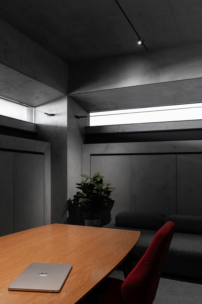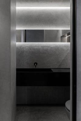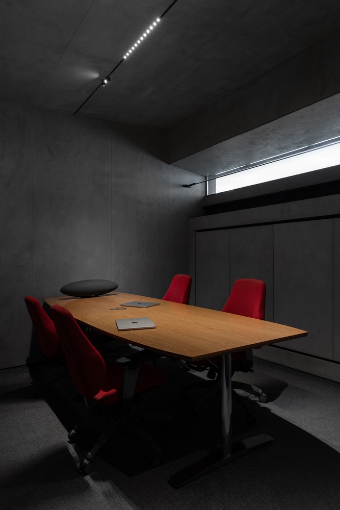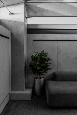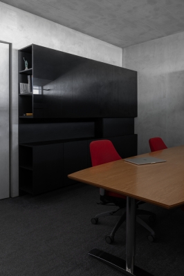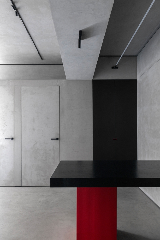 The showroom office is located in a manufacturing building from the 70s. At the entrance it was necessary to place an office place, showroom, WC and corridor. The interior is made in a neutral background, accents are placed on demonstration production products such as a shadow gap profile, flush-mounted doors, linear lighting elements, etc. The task was to create a practical, comfortable space for working and demonstrating the product. The main finishing material is microcement - it was used on walls, ceilings and on the floor. This technique made it possible to recreate the architectural monochrome plane, and also supported the idea of minimalism and monumentality of the building itself. Architectural volumes were highlighted by the shadow gap profile. To give emotion to this interior added red color to the furniture elements.