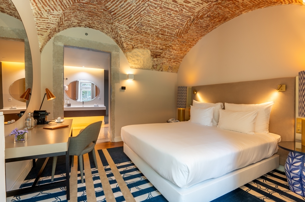 The design concept carefully incorporates the existing panels of azulejos, which feature themes such as Portuguese maritime expansion, religious iconography, and various decorative motifs, including geometric and vegetal elements. These tiles are not only preserved but celebrated throughout the hotel, with patterns being reproduced in carpets and tapestries to enhance the thematic continuity.