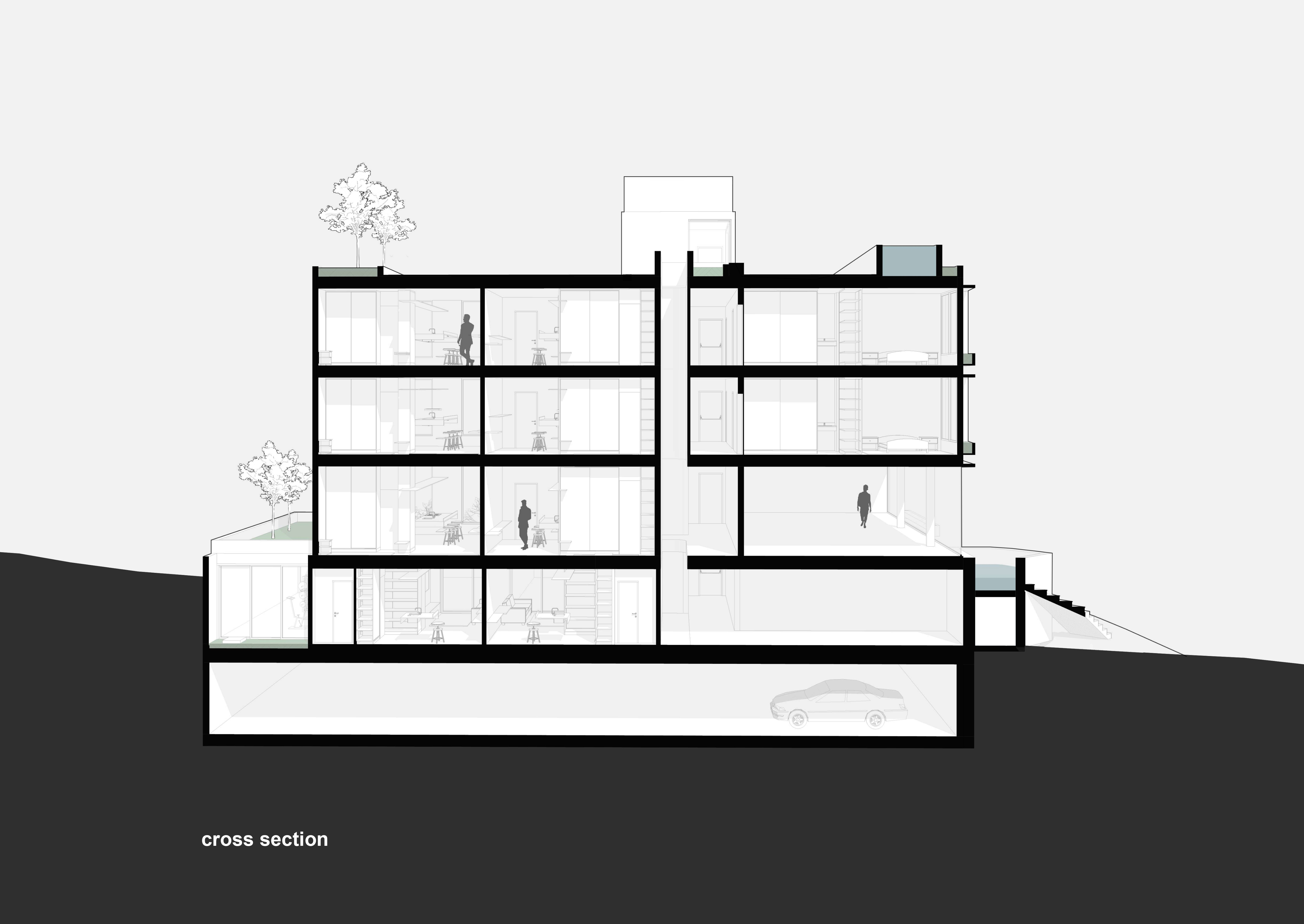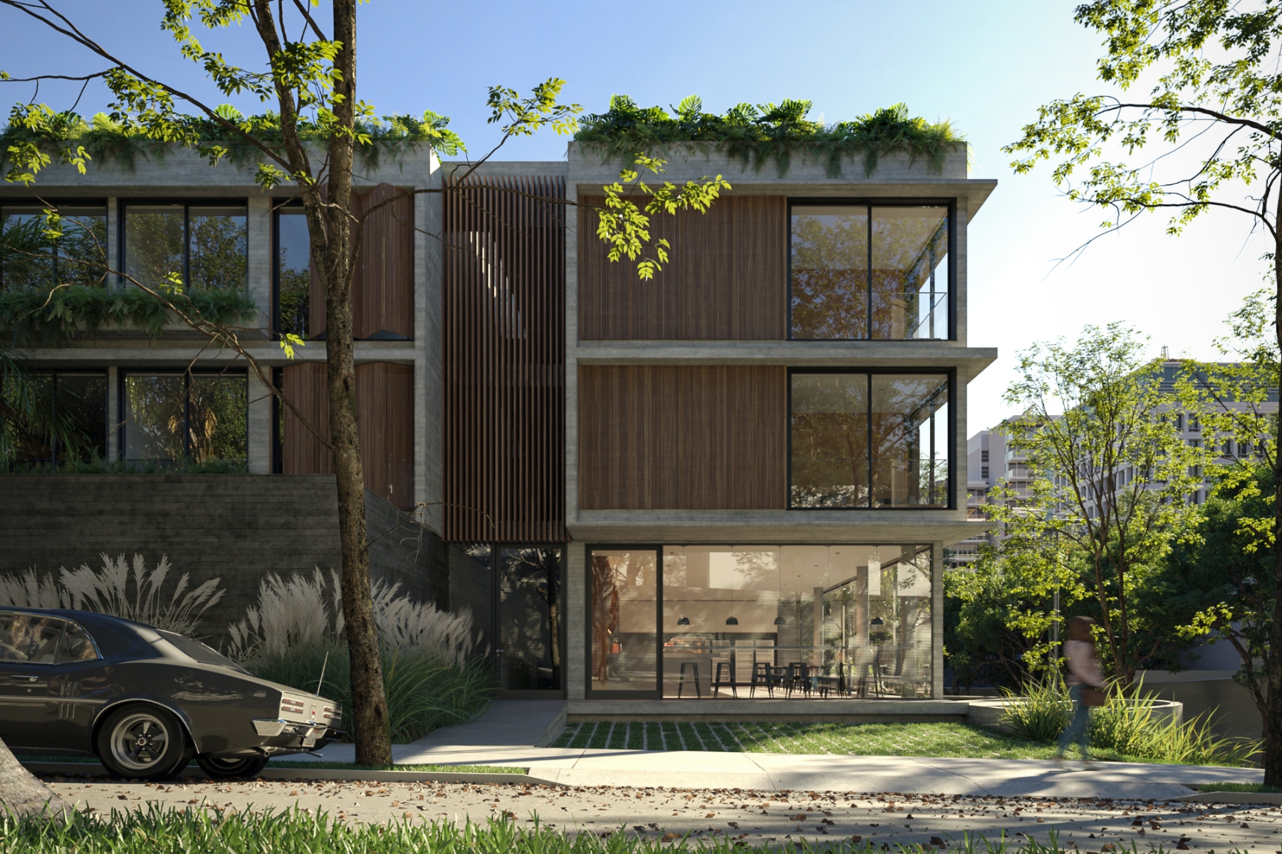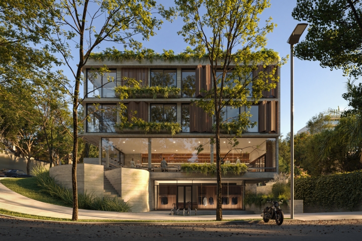 The project is also concerned with the issue of sustainability, with a structure on the roof with solar panels and rainwater collection throughout the lot.