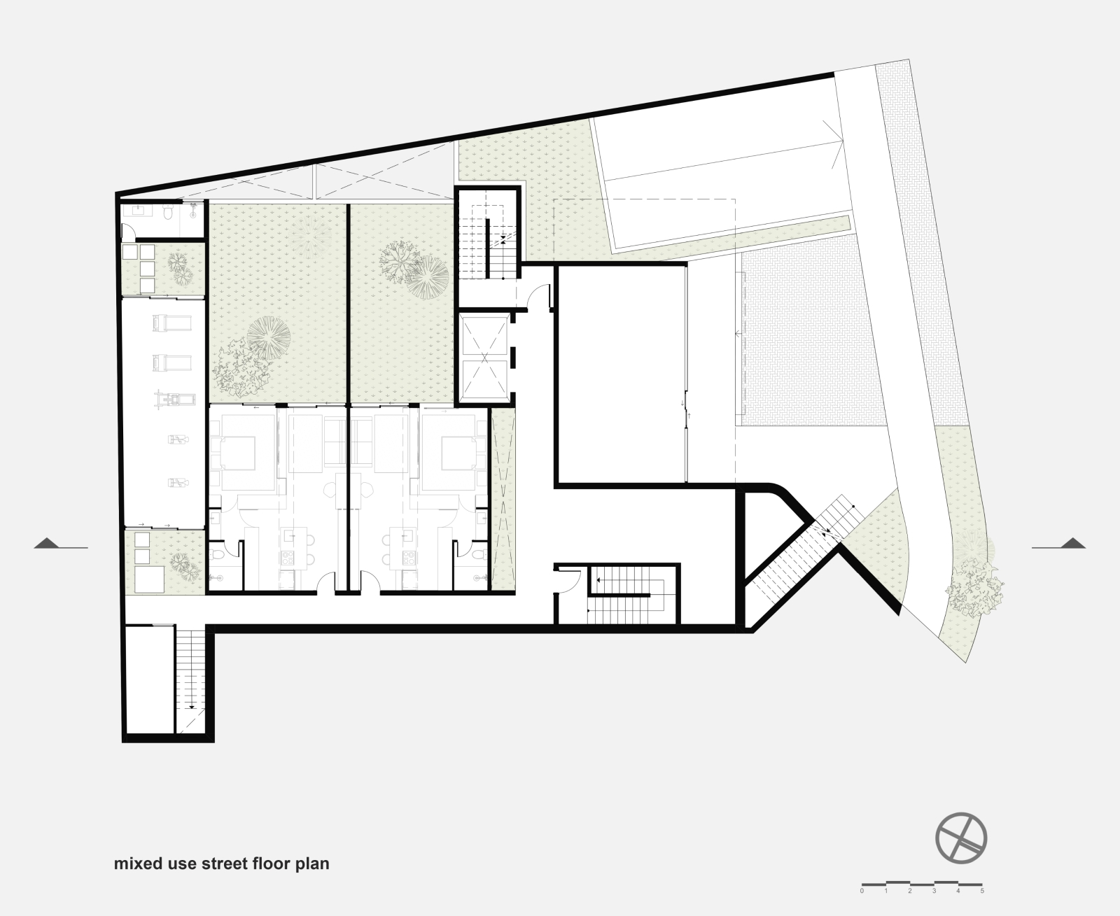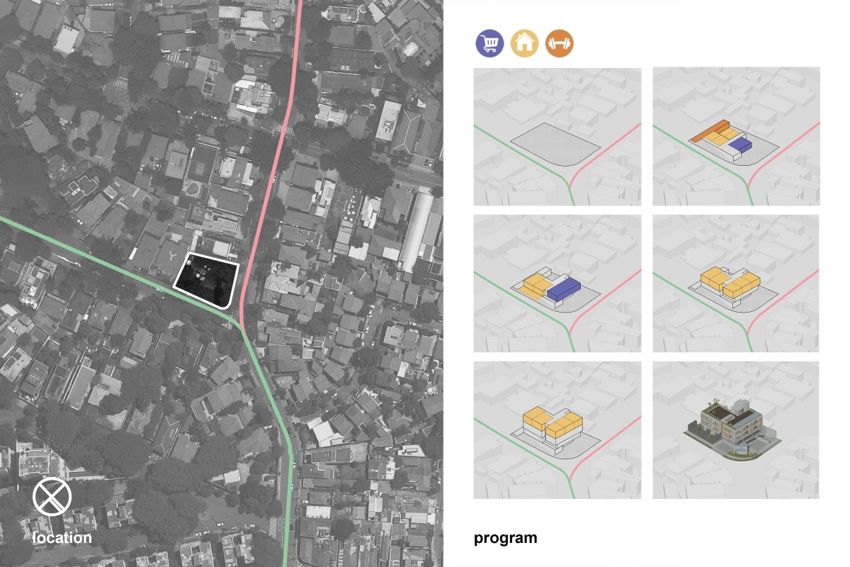 The corner plot is located on the boundary between two distinct zones, the different characteristics of the two streets are what established the distribution of the building's use.