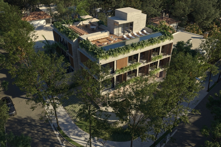 The building has different units, with garden apartments, corner modules and corner apartments. They were all designed to have a pleasant and functional space. On the top floor we have a common area with a swimming pool and living areas that have a view of the neighborhood's skyline, which has a lot of greenery between the buildings and houses.