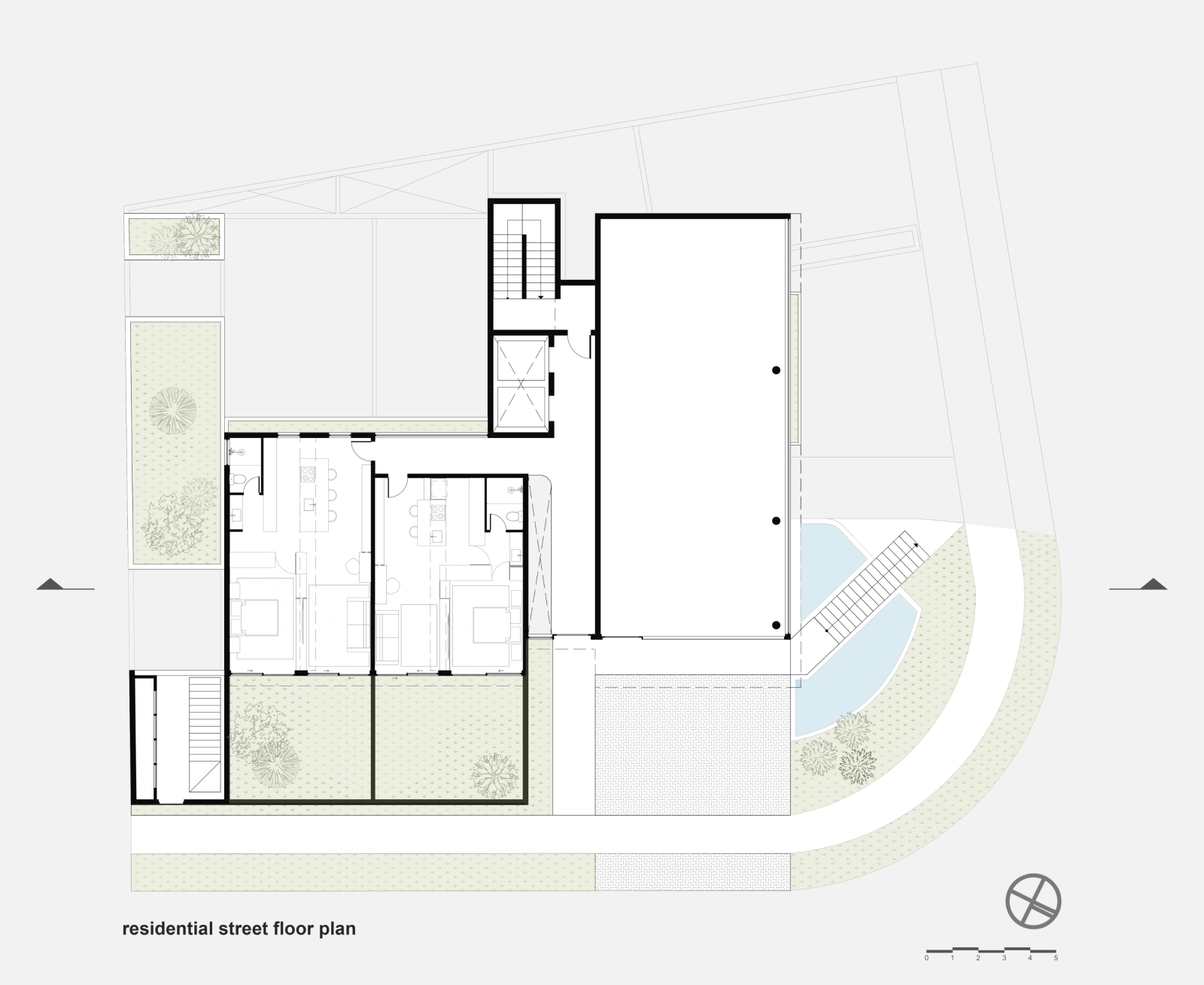 The two commercial units are facing the street that is mixed use and where we have a greater flow of people, while the entrance of the housing units is on the much calmer street located in the residential area.