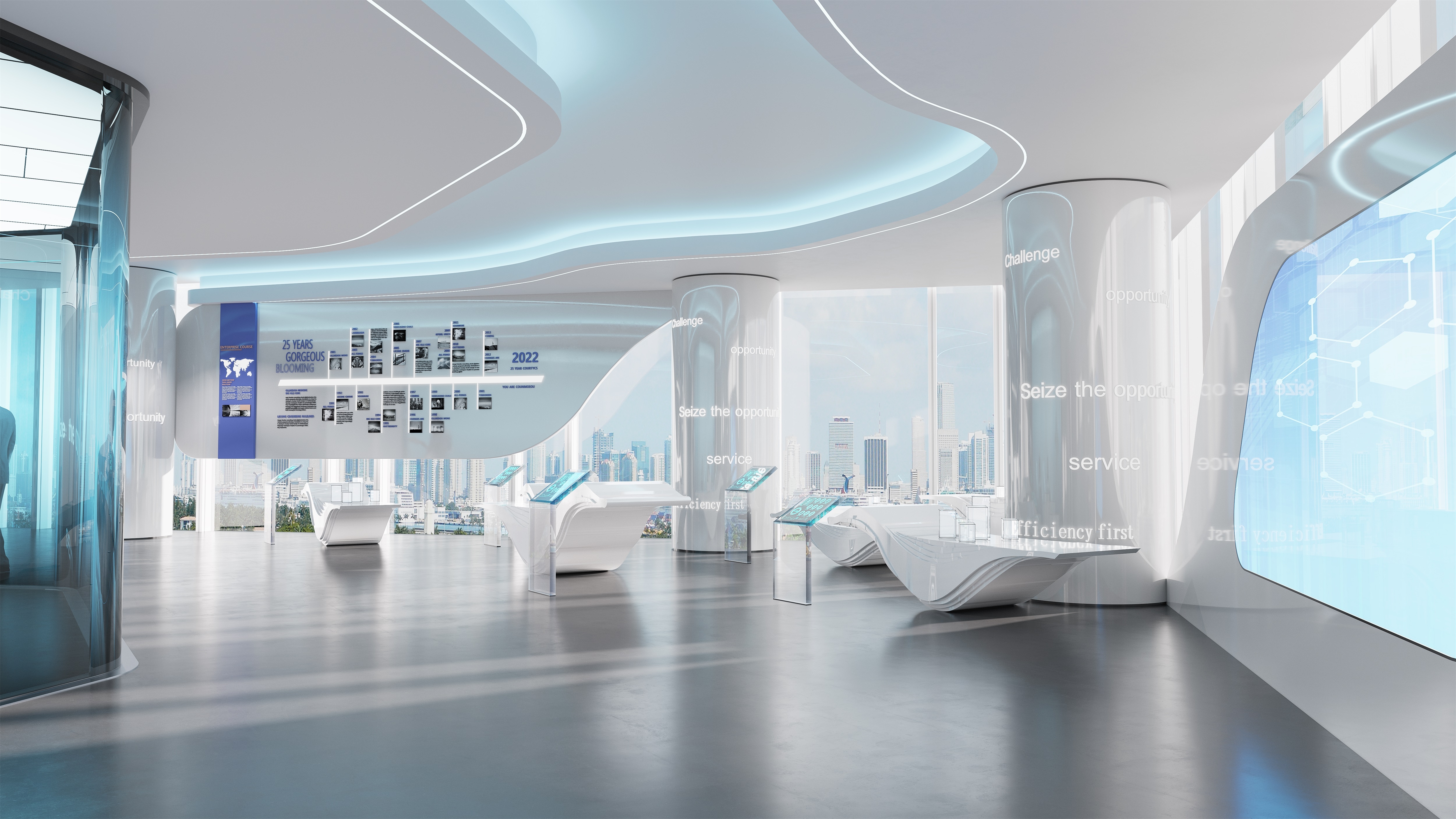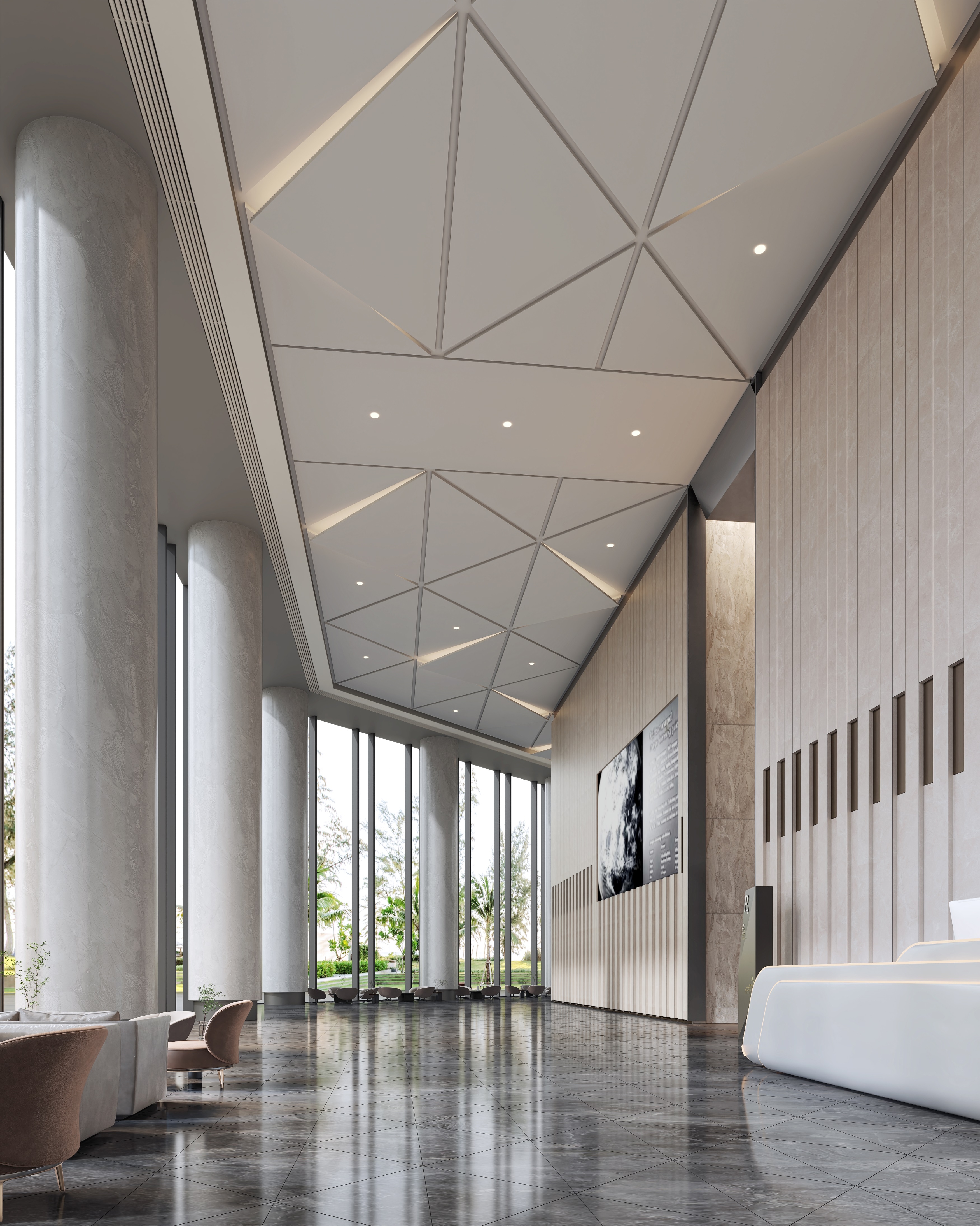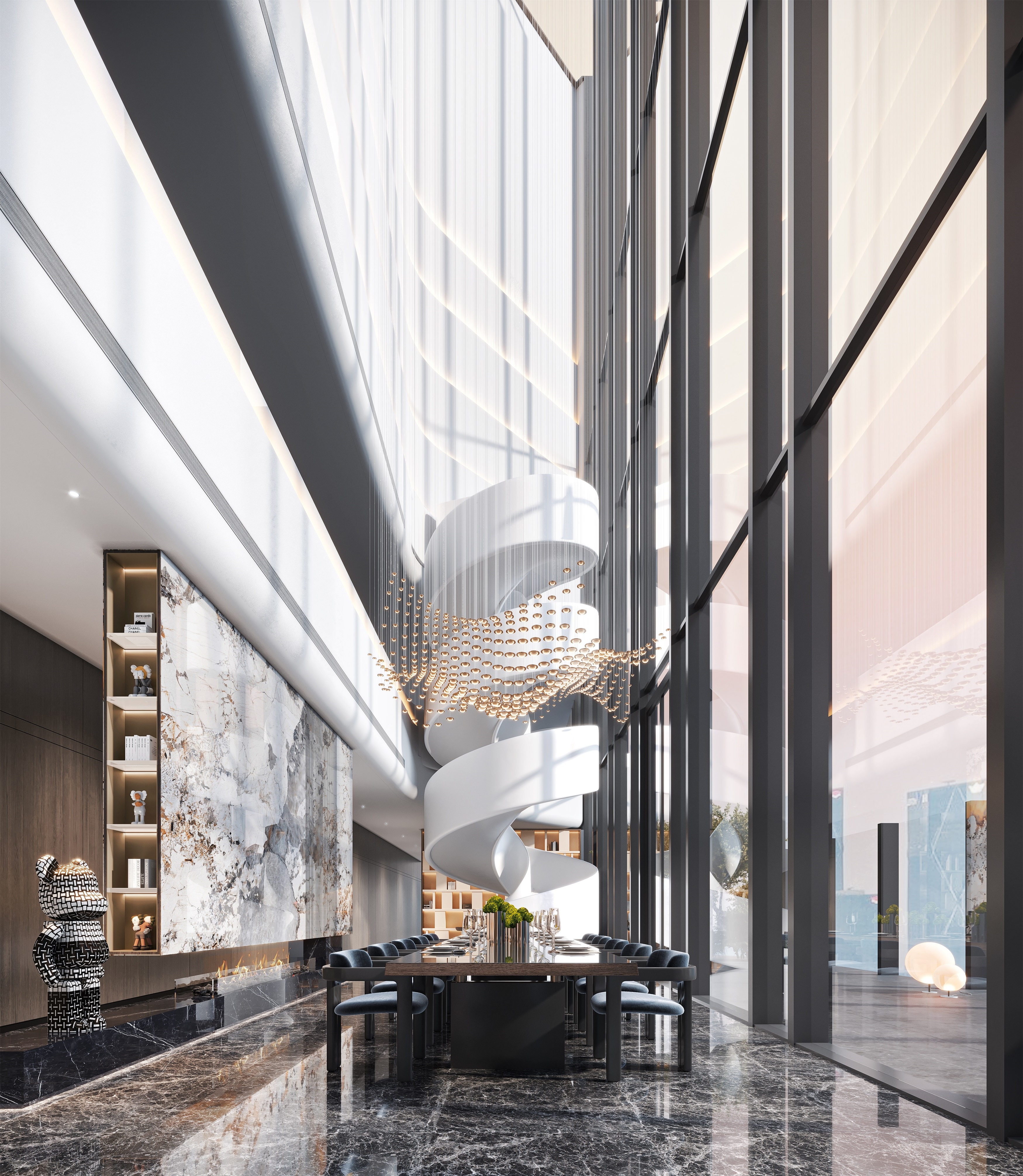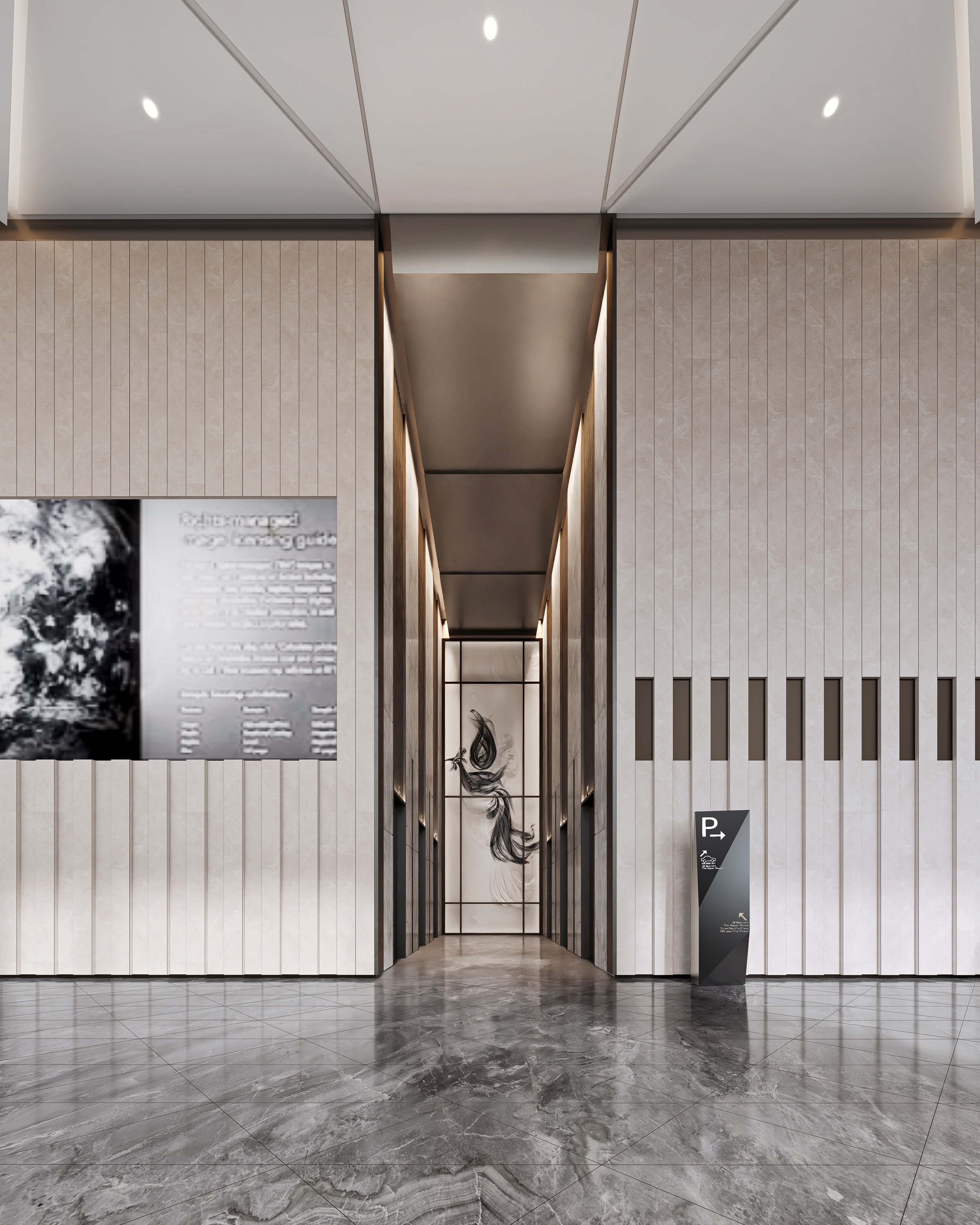 The interior design of the Xin Feng Ming Headquarters Building, situated on the shores of Phoenix Lake in Tongxiang, China, unveils the essence of the corporate culture. There are two essential elements related to the design: one is the dynamic linear elements derived from the main operation, specifically textiles; the other is the iconic symbol of the company, specifically phoenix. These elements have been woven into the overall interior design framework. The vibrant and fluid linear elements are extensively use across various indoor spaces, and extend from the geometric shapes of the external architecture and surrounding landscapes. parallel 45° lines are used to segment indoor spaces, enhancing spatial hierarchy and visual appeal. The local display area features a phoenix feather form, where a phoenix-themed art installation is crafted to communicates the core values and aspiration. The guiding principle for the office area is to cultivate an environment that harmonizes work and life and accommodatesa variety of work styles.