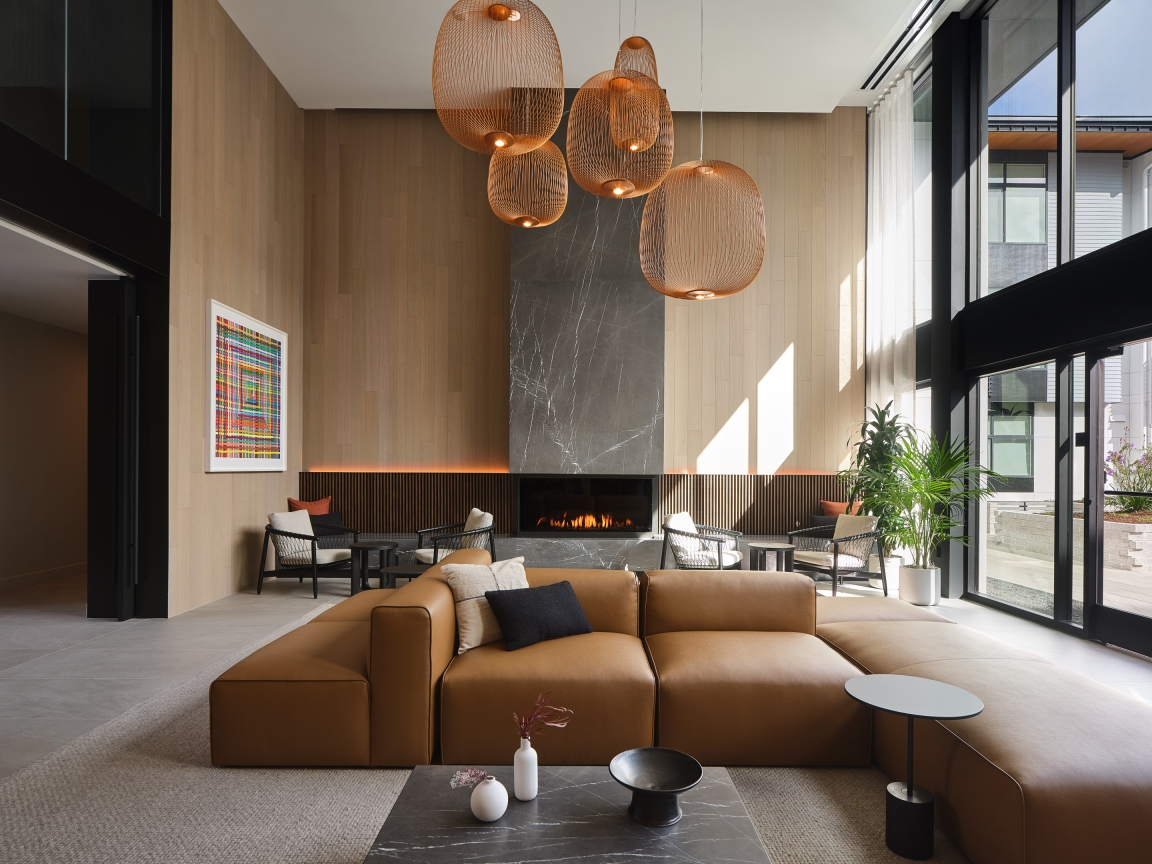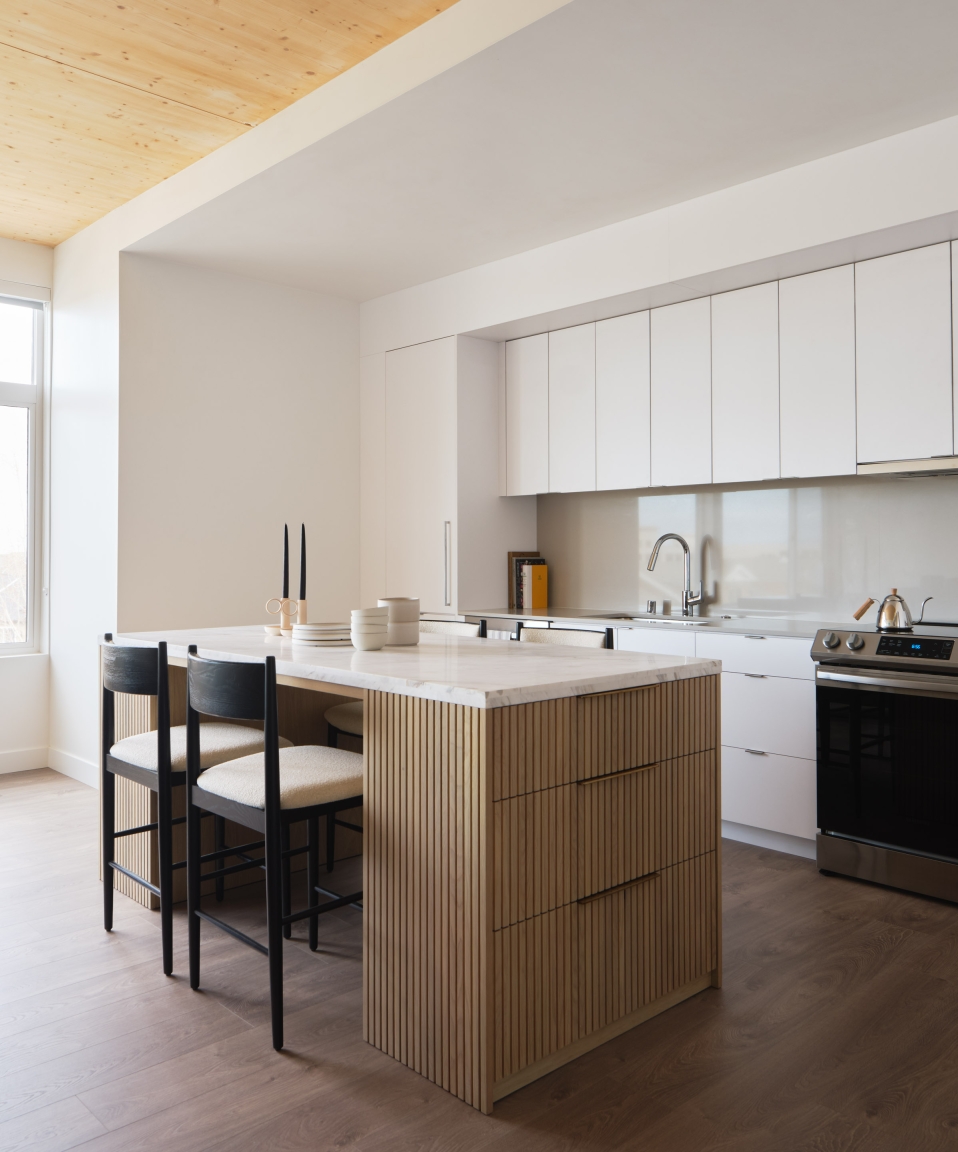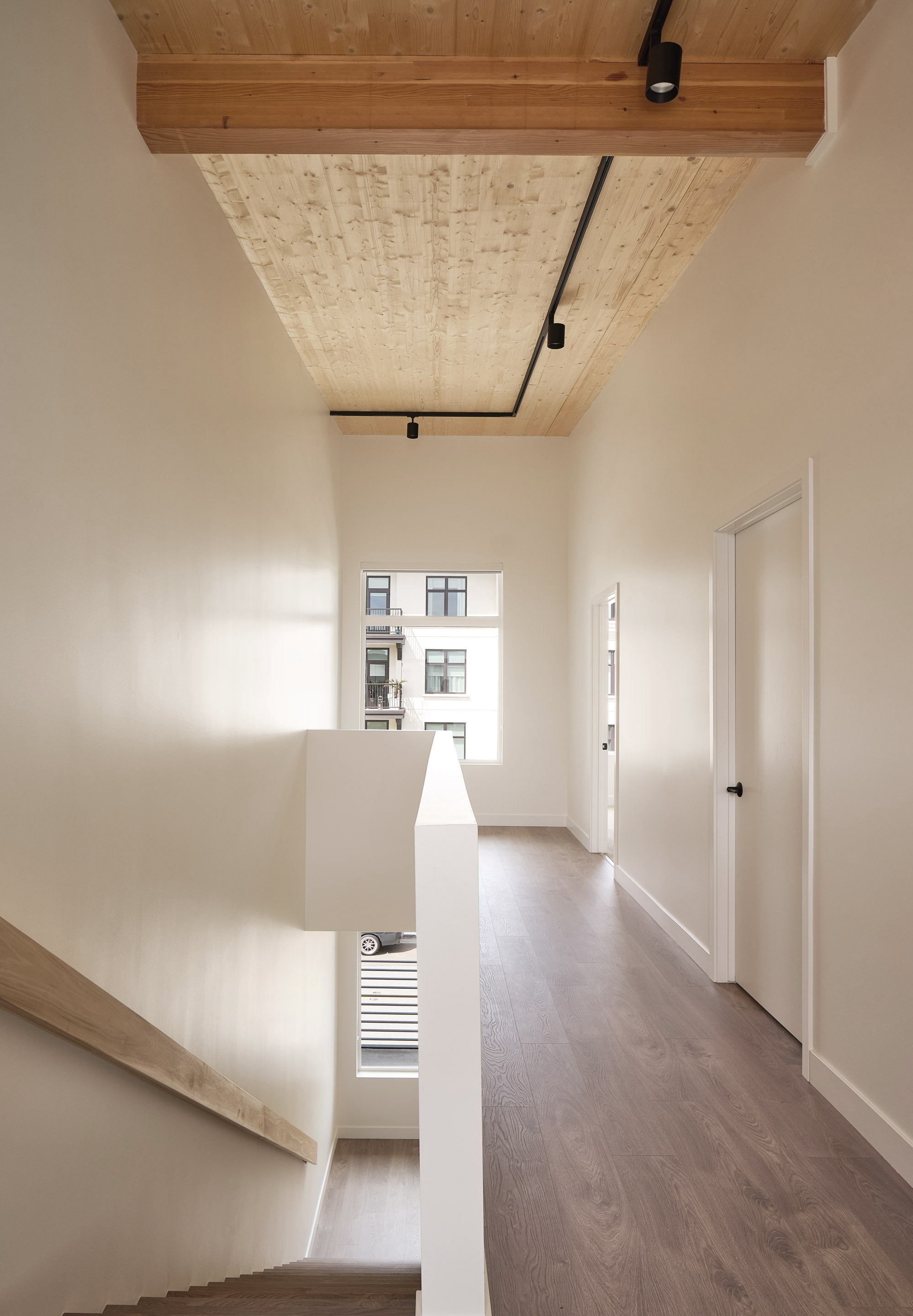 The building utilizes a cross-laminated timber structure that, in addition to an efficient construction process, allowed us to expose the wood ceiling surfaces, adding another layer of warmth and character to the units.
