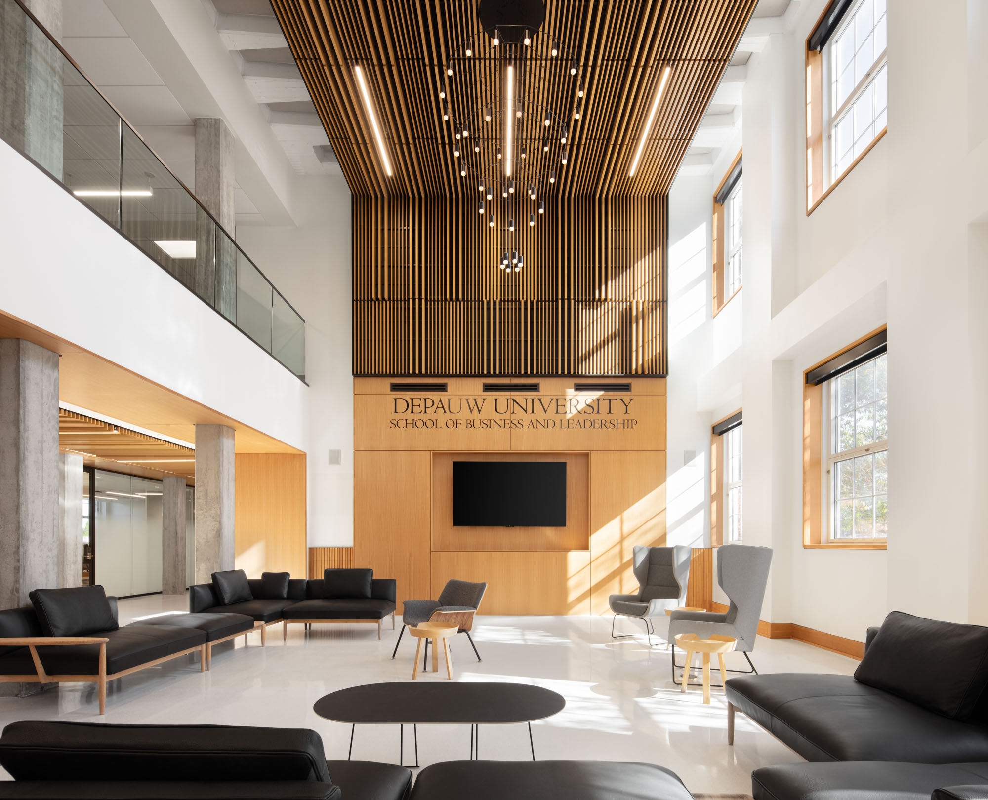 For the School of Business and Leadership at DePauw University, we adapted an existing philosophy building into a new, literally much more open, airy, and vibrant business school.