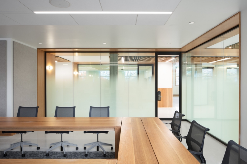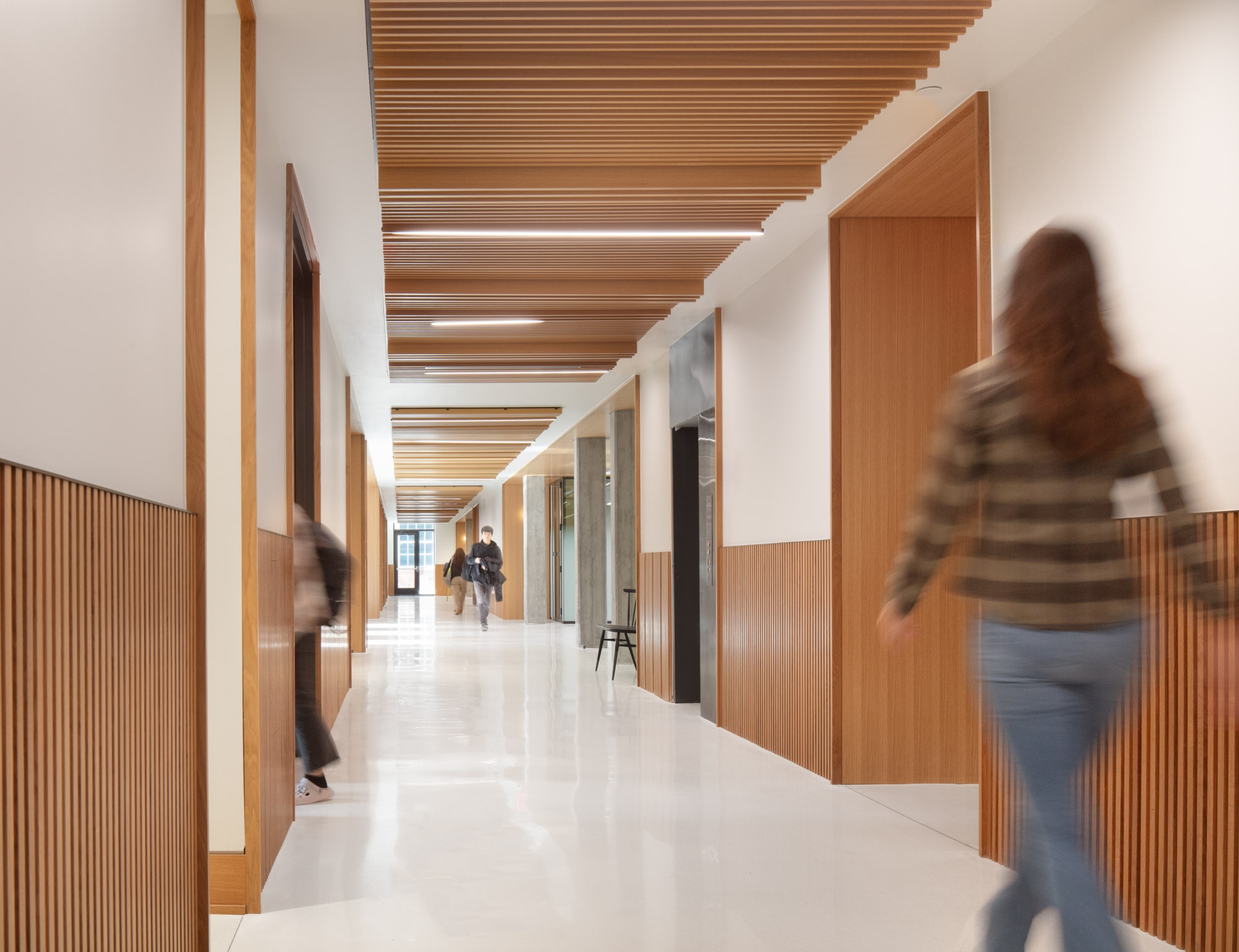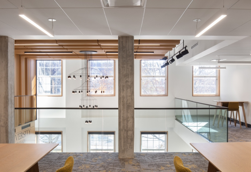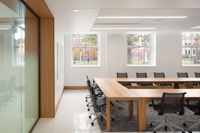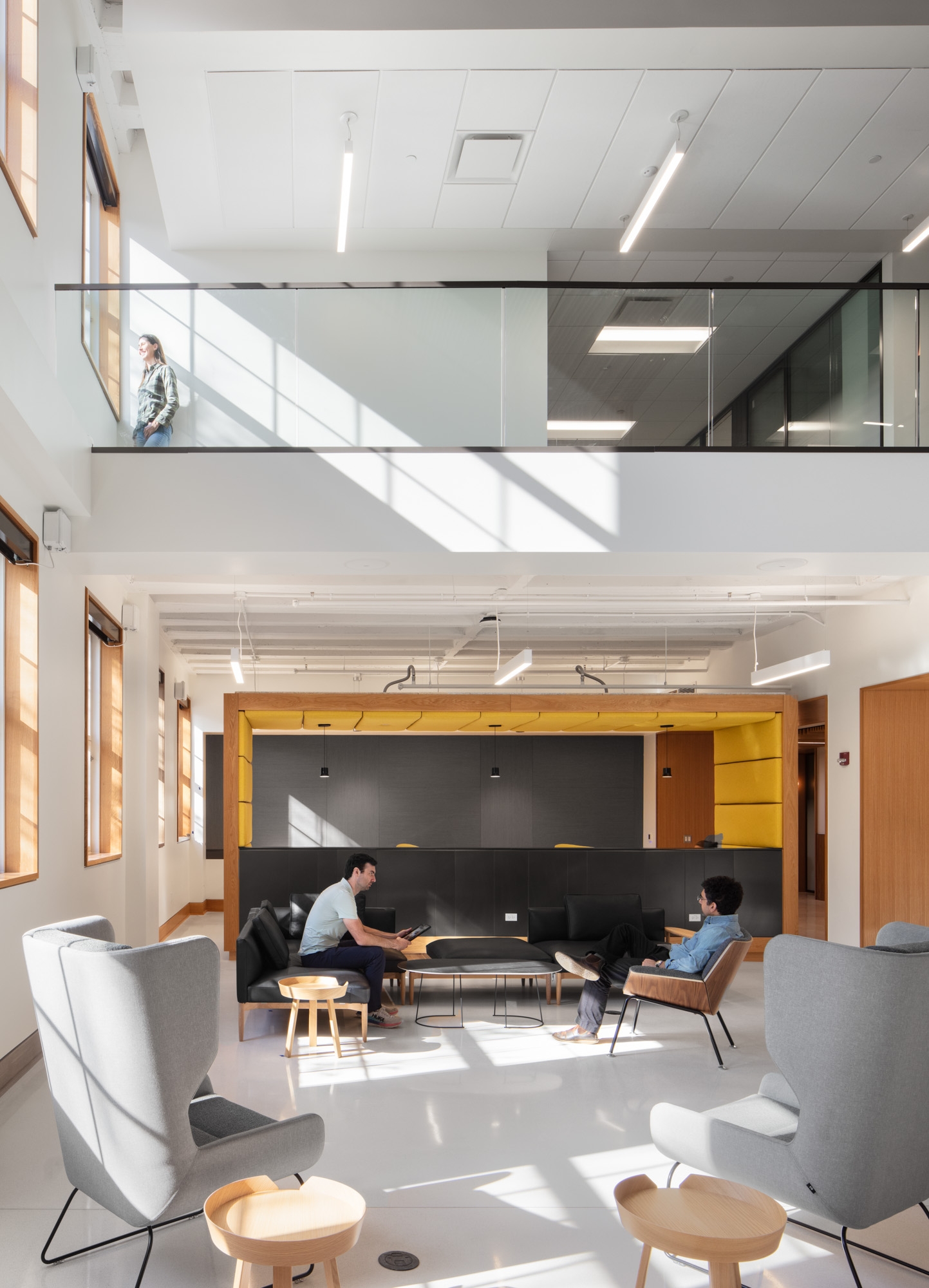 We sliced through the existing two-story structure to create a light-filled, double-height atrium that can be used for meetings, presentations with alumni, and faculty gatherings. That spirit of full transformation continues throughout the building, where dark rooms have been replaced by wood-paneled, light-filled classrooms and spaces for various interactions. We scooped out the entire interior, which included four layers of existing floor, and put in a new one. On the interiors, we were inspired by the midwestern tradition of craft and using wood in evocative ways, which led to our engaging a small local furniture company to produce the furnishings.