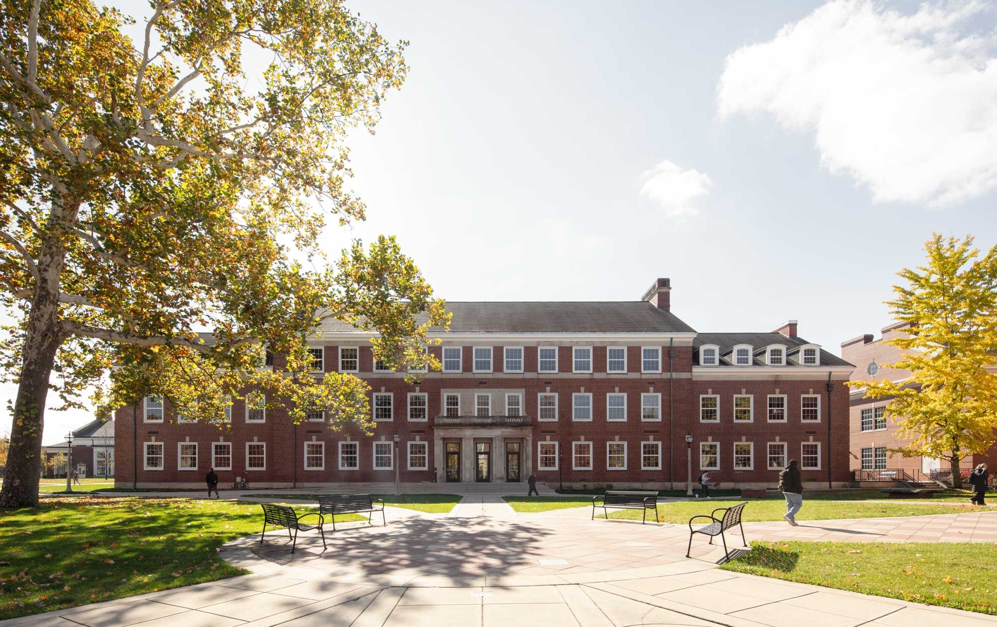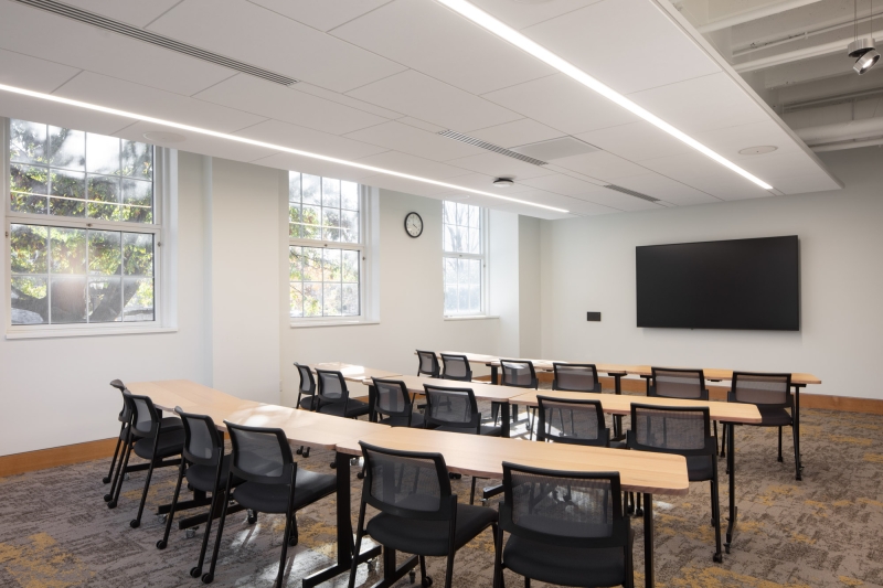 The existing structure was a dark, enclosed warren of low-ceilinged hallways and classrooms falling into severe disrepair. Initially built in the 1950’s, the exterior conforms to a classic collegiate style, which we have lovingly preserved and restored; the interiors, however, were a disaster, and their use—housing a philosophy department—needed upgrading.