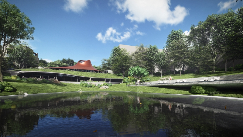 The community center planning project is located on a modest hill, where the designer has integrated the building site with the natural terrain, promoting eco-friendly and sustainable development. An underground walkway preserves the original landform, while strategically positioned openings facilitate a seamless connection between interior and exterior spaces for superior ventilation and lighting. The deliberate use of a reddish-bronze color with flowing lines enhances the overall aesthetics of the environment, fostering a harmonious connection between the building and the surrounding landscape.