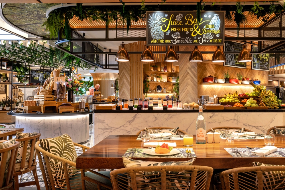 With 11 culinary stations, (including an outdoor oven), that all nestle under the interior canopies formed from curved louvred timber and back lit barrisol ceilings that have custom printed artwork depicting the leafy patterns from under the Tembusu tree.