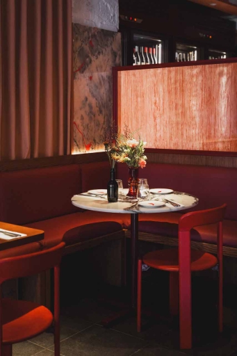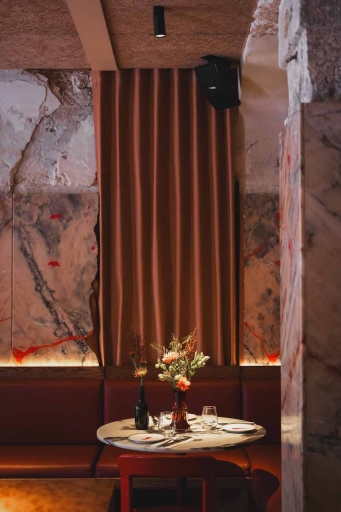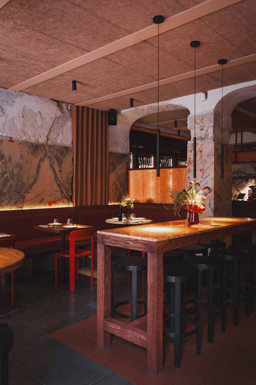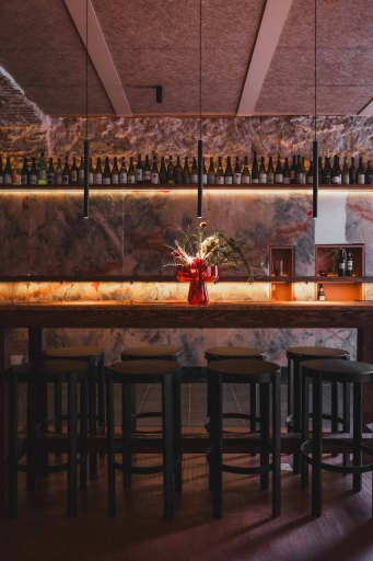 Parra, a bar-bricolage in Santos, showcases a unique and tasteful interior design that pays homage to the history of the neighborhood and the place. Originally a "tasca" and then a "talho," Parra preserves charismatic materials like pink marble slabs and vintage azulejo tiles, blending old and new seamlessly. The threefold layout echoes its lineage, with the main area featuring mixed-tiered seating against a backdrop of Rosa Portugal pink marble wall restored in similar to kintsugi technique. The design accentuates wine as the protagonist, with an array of wine fridges and cabinet displaying rare regional bottles. Soft lighting throughout maintains an intimate ambiance, while the bar offers dual entrances including a 'window' table that blurs the line between interior and exterior.