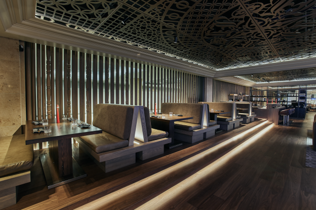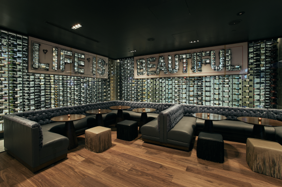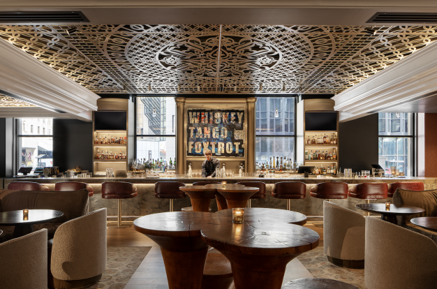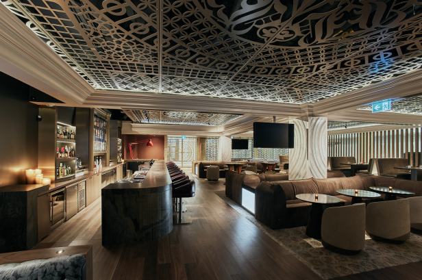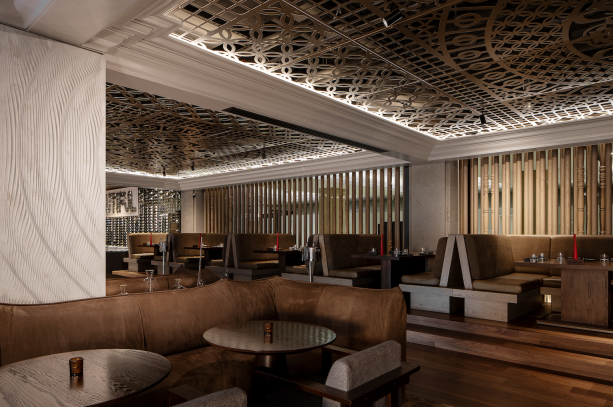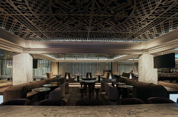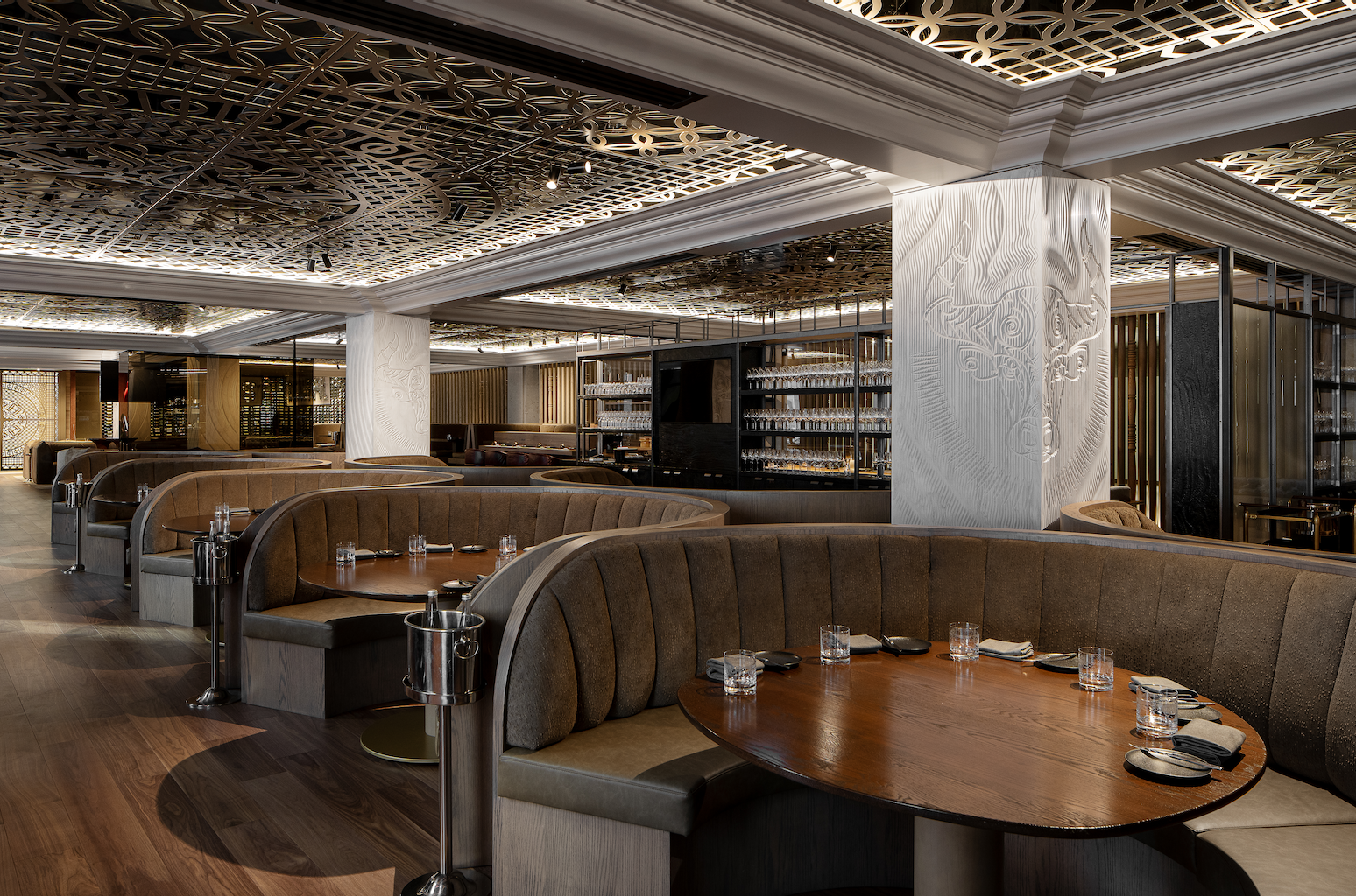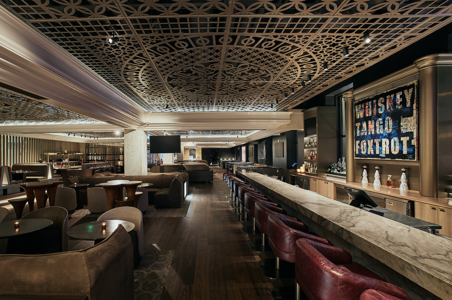 To address lower ceilings and exposed mechanics, CNC laser-cut panels and crown moulding reveal the mechanics above like intricate timepiece workings. Sculptural pillars, clad in laser-cut stone with Indigenous-inspired bovine motifs, anchor the space visually. Soft, ambient lighting highlights artworks by contemporary street artists like Mr. Brainwash, Peter Tunney, Mr. Pink Brush, Peter Triantos, and Olivier Bertrand, infusing urban energy into the interior.