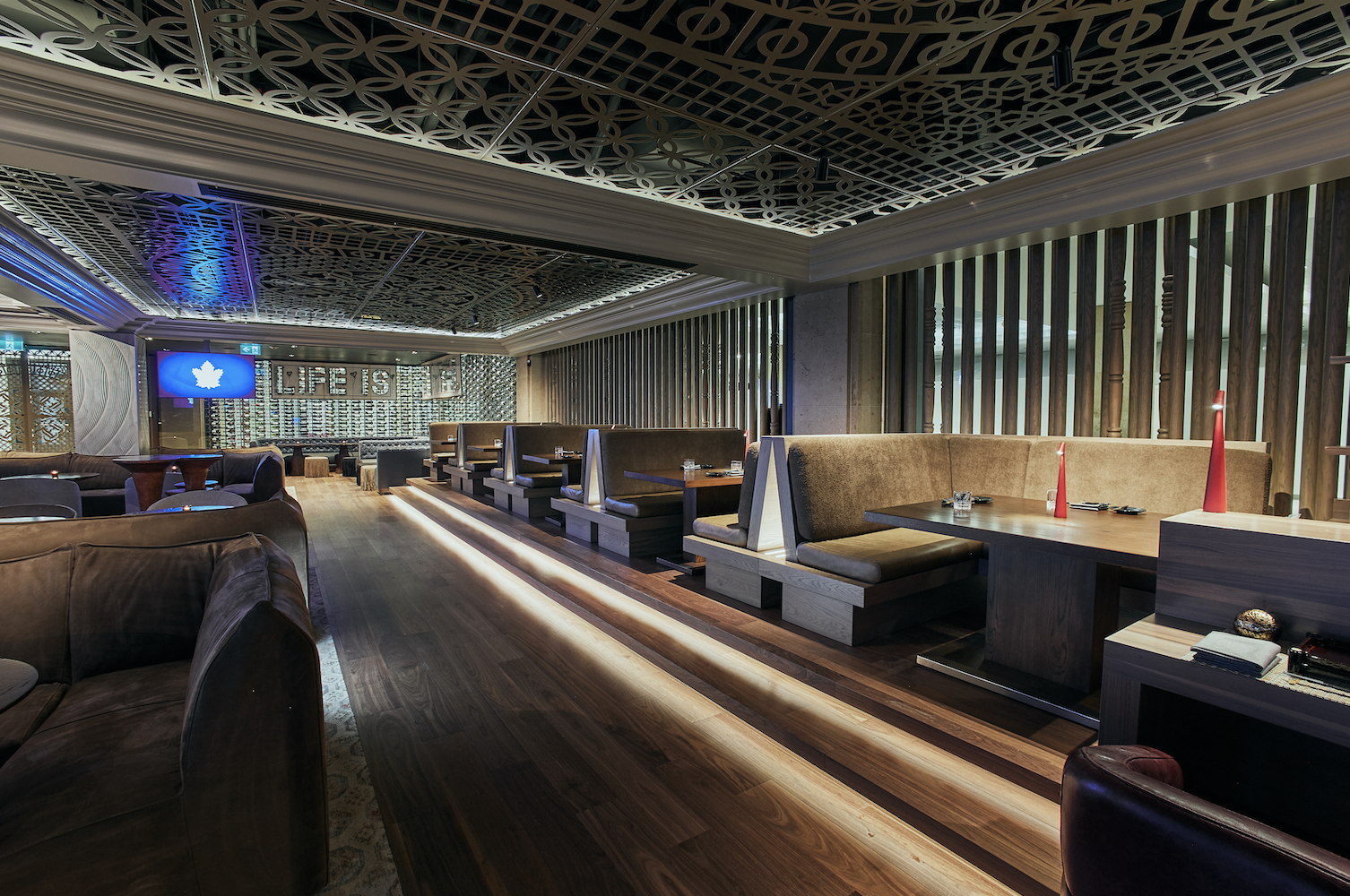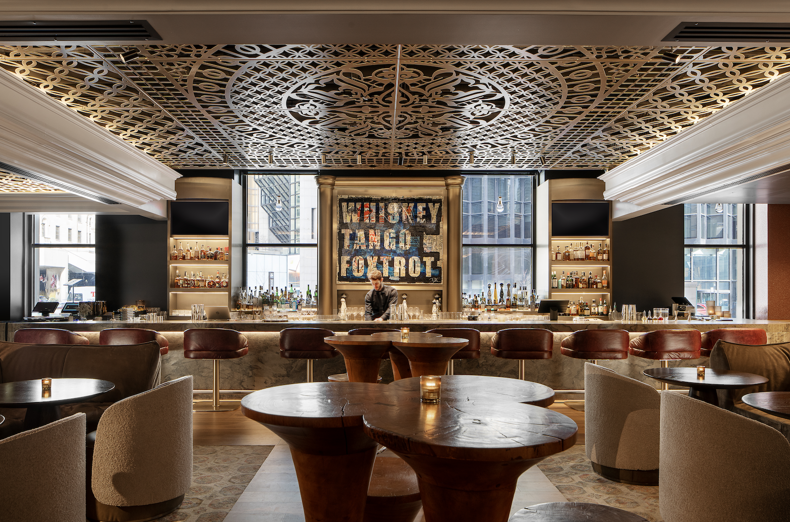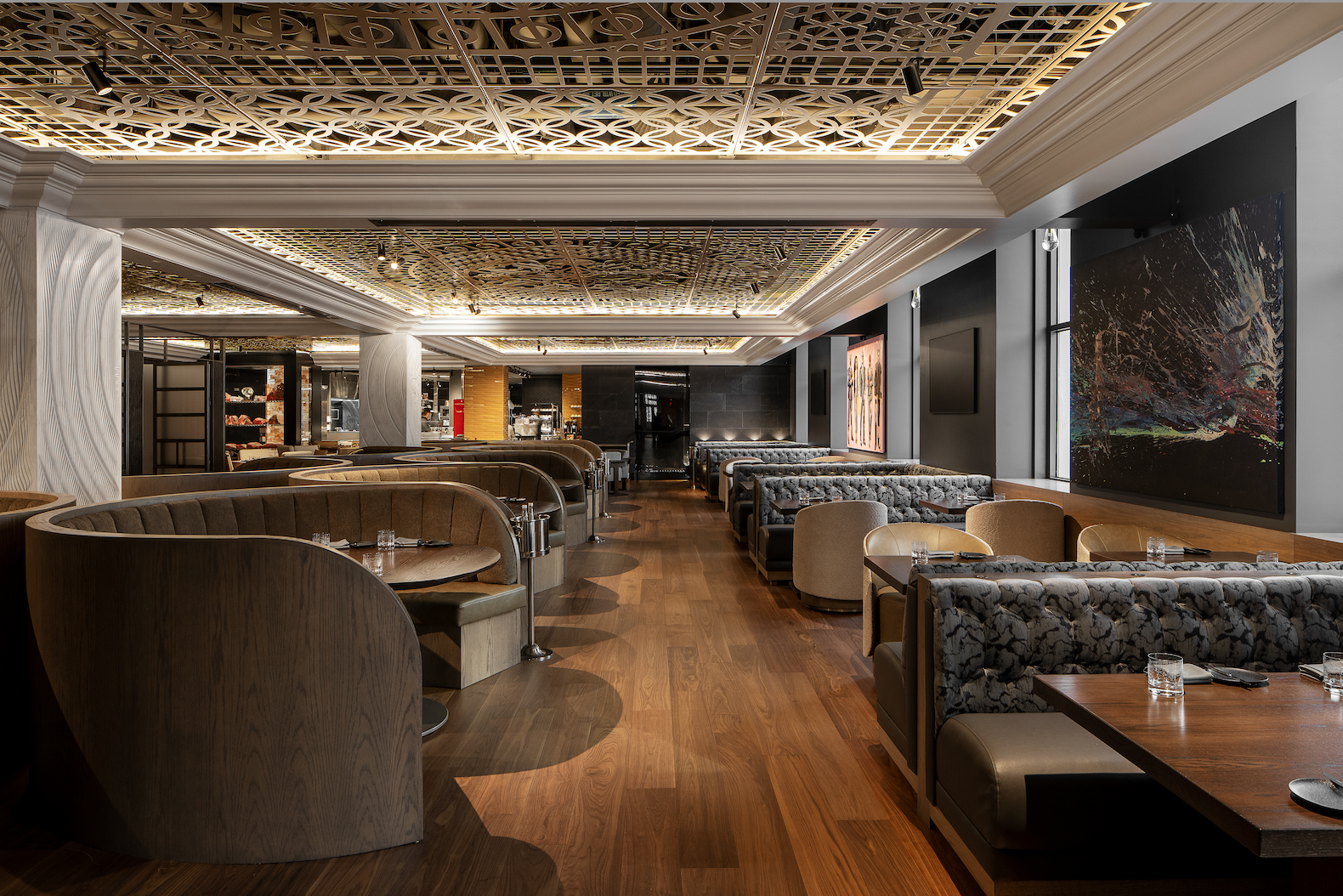 Nestled within Toronto’s iconic Union Station, this space blends sleek modernism with classic industrial elements, creating a fusion of art, materials, and design. Warm earthy tones, rich textures, and Canadian maple, walnut, and oak, paired with natural stone and sculptural details, evoke a vintage-modern aesthetic.