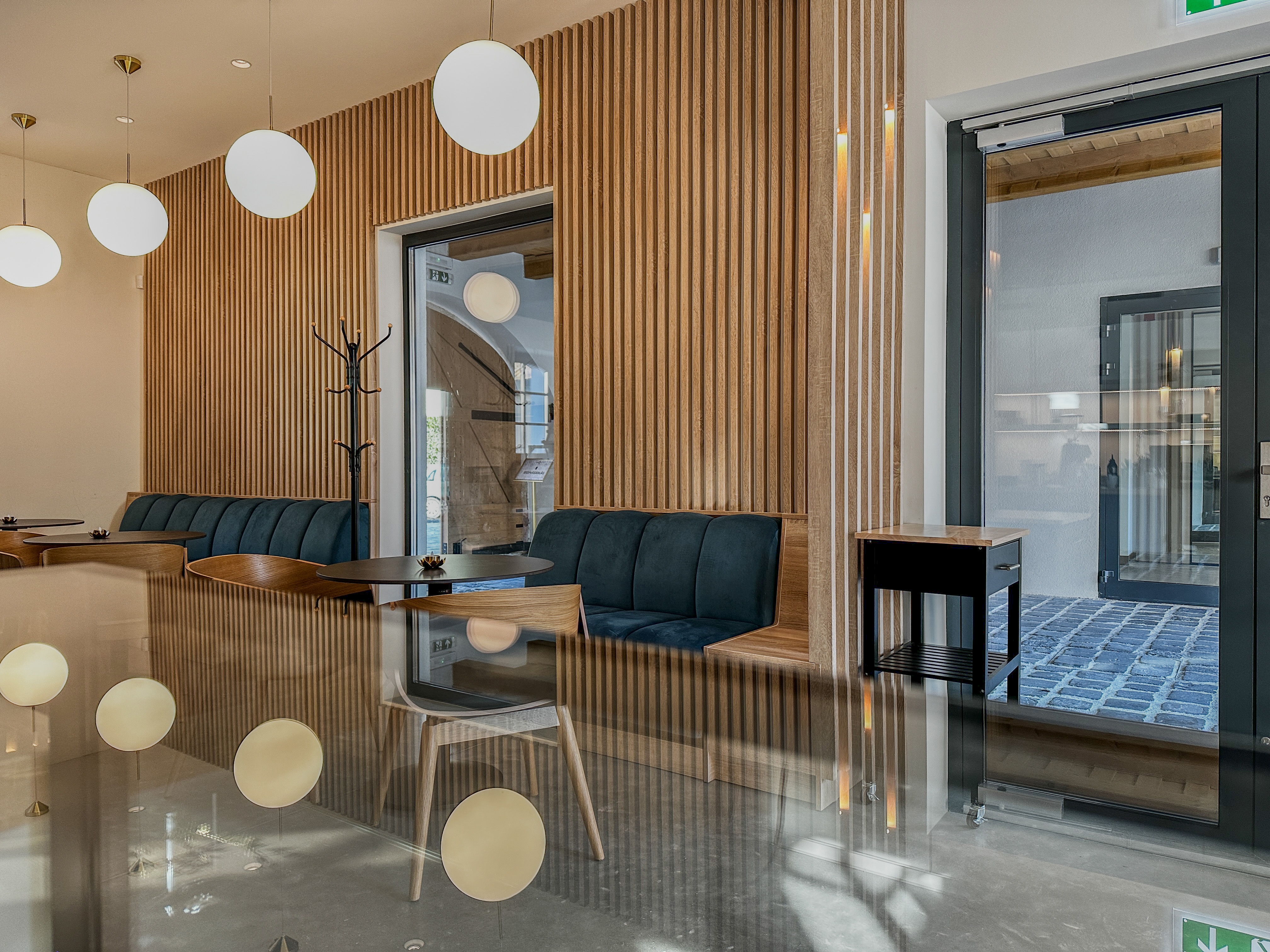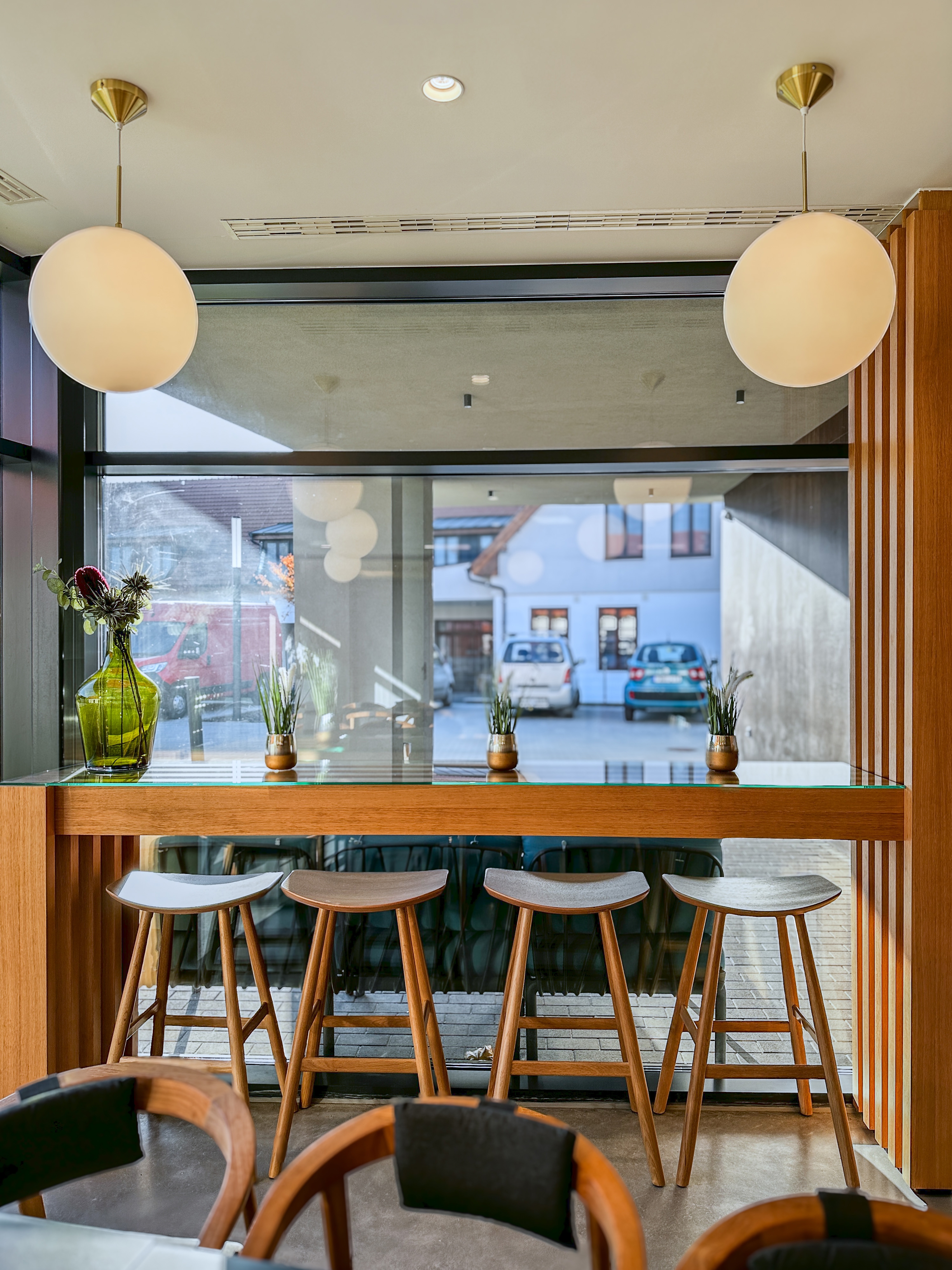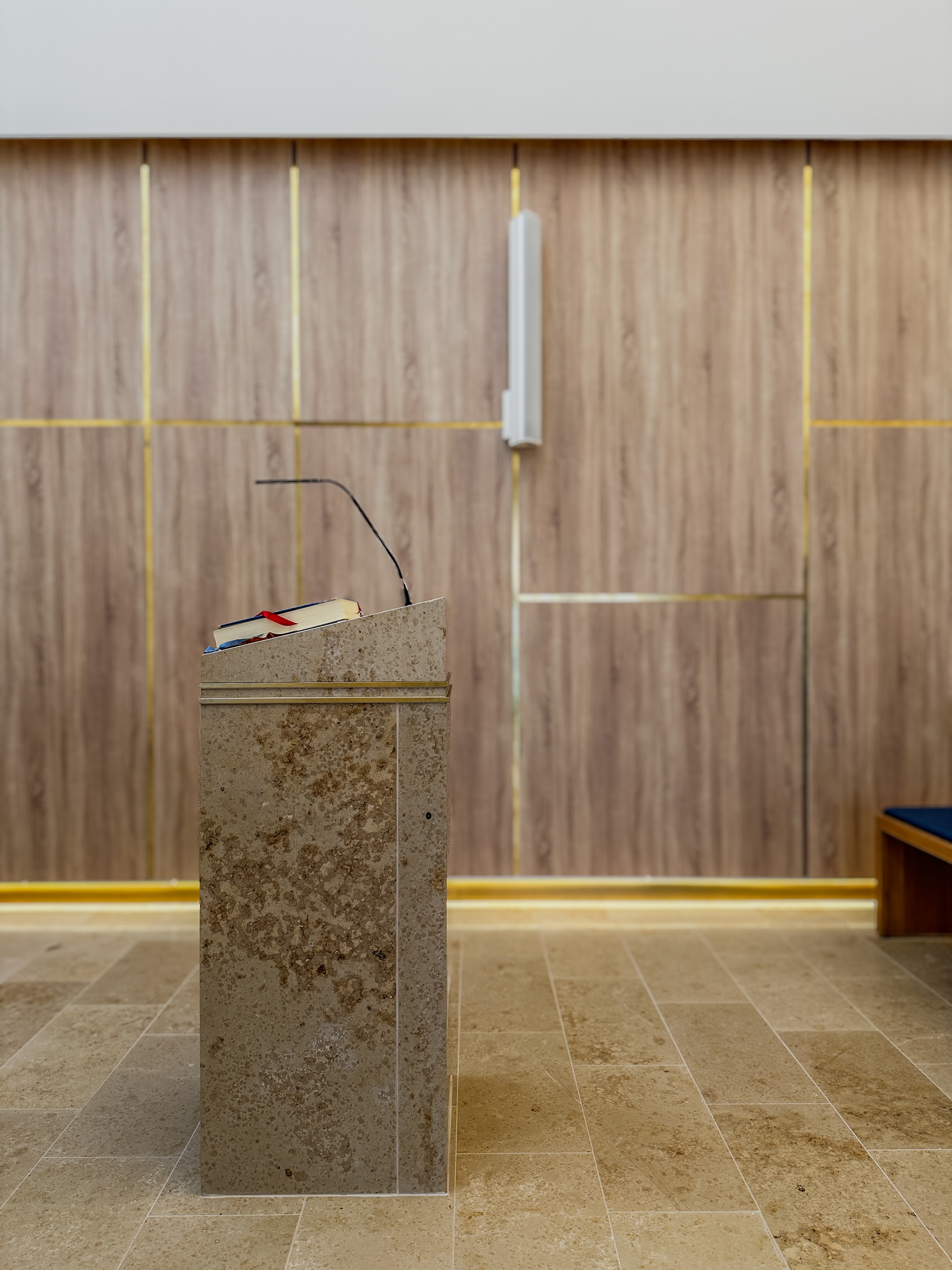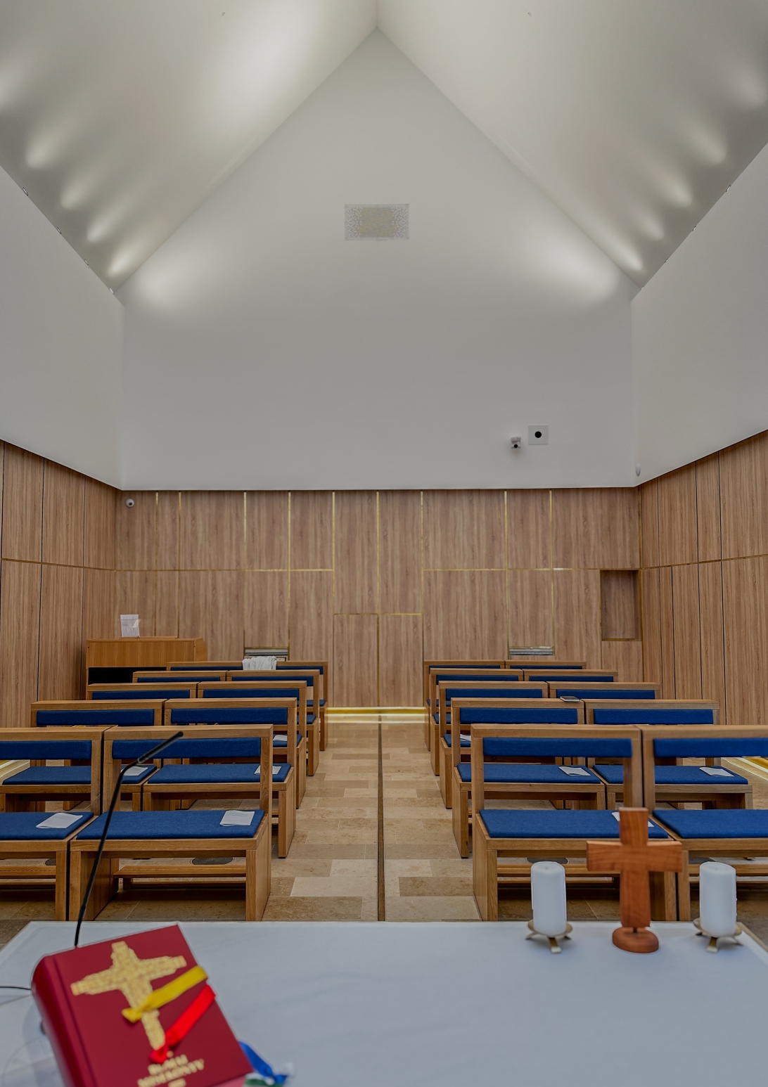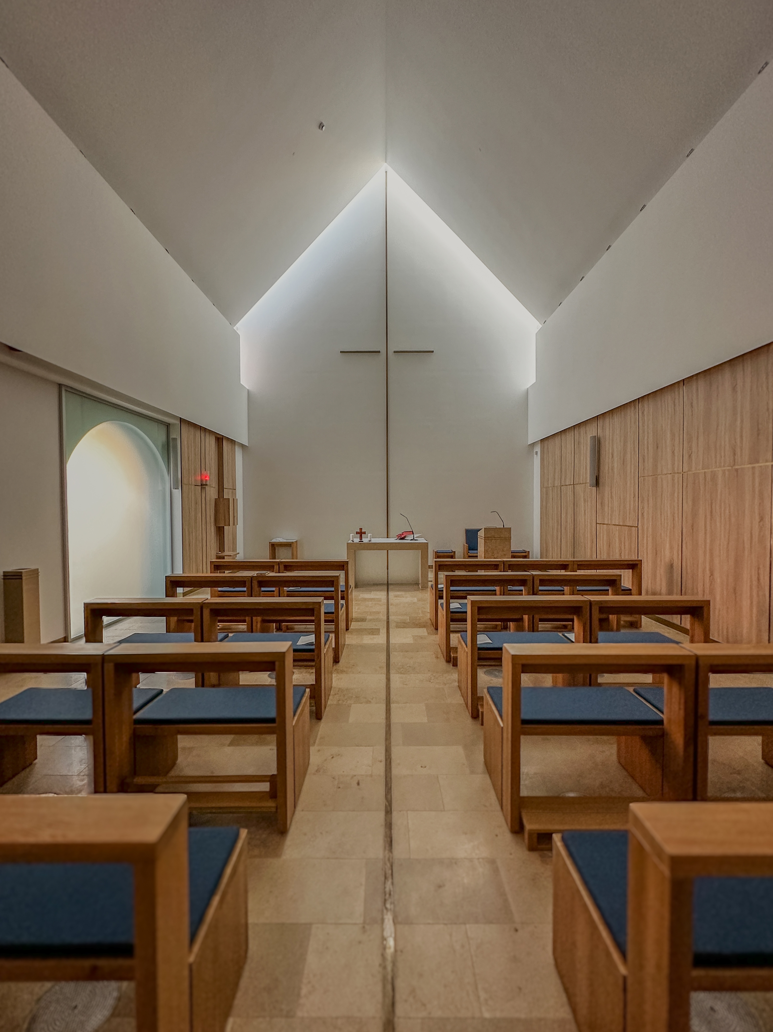 The interior is designed to evoke simplicity and serenity, particularly in the chapel, which features clean lines and a large opal glass window symbolizing the resurrection. The décor integrates modern functionality while maintaining a connection to the building’s historic roots, offering a harmonious space for reflection, prayer, and community gatherings?.