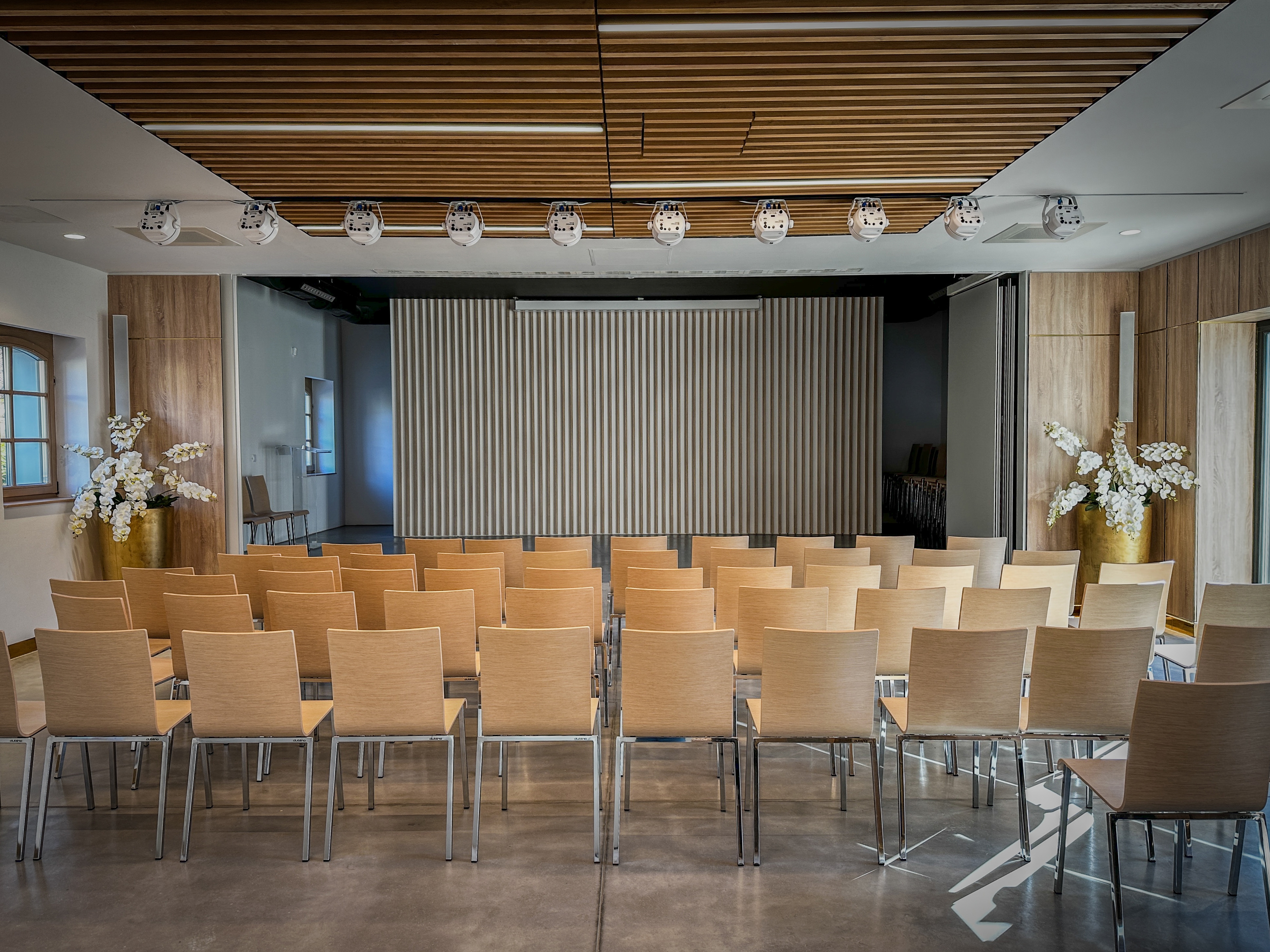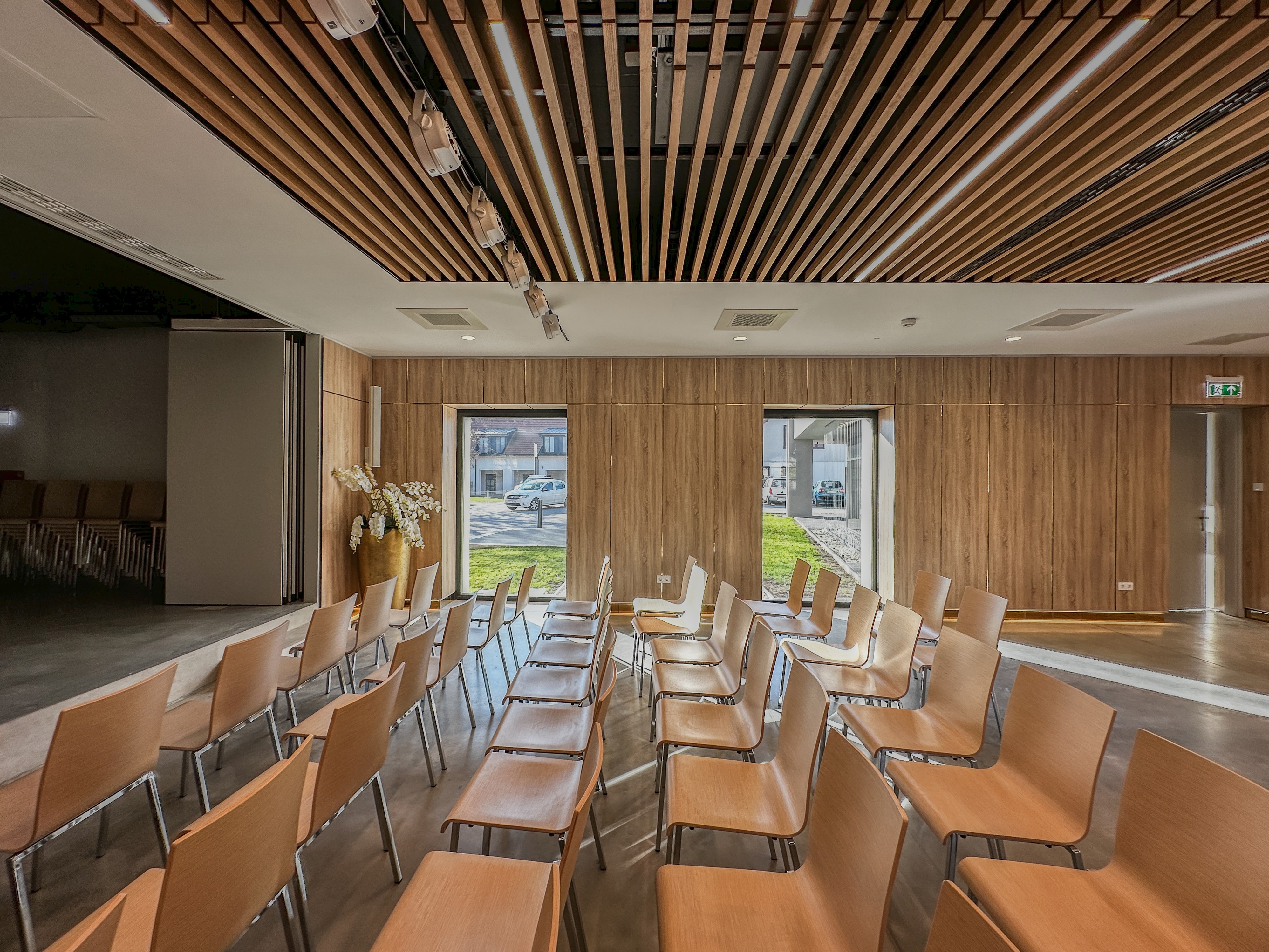 The PüspökVác Event Center in Vác is a stunning blend of historical and modern design, located in a former baroque-era economic building of the bishop’s estate. The building, originally used for storage and workshops, has been meticulously renovated to serve as a multi-purpose venue. Its most striking feature is the 150-person conference hall, which can be divided into smaller sections for flexibility. The hall is equipped with advanced audio-visual technology, making it ideal for both church and corporate events.