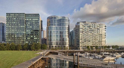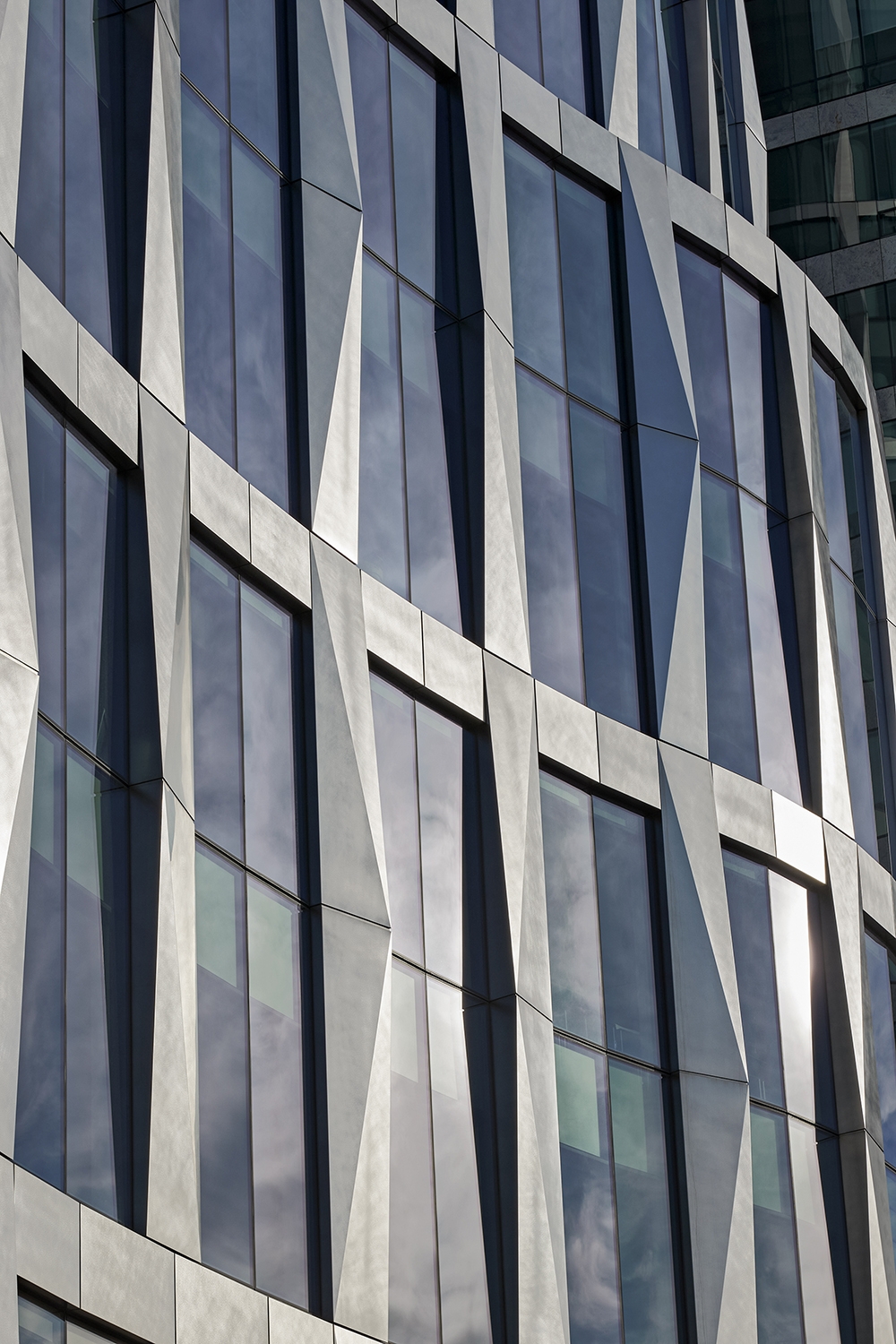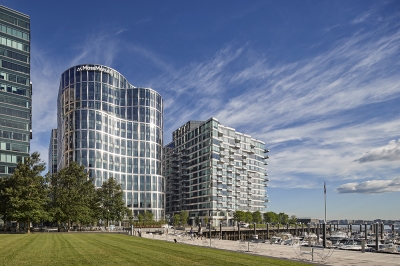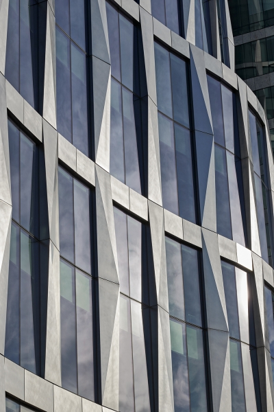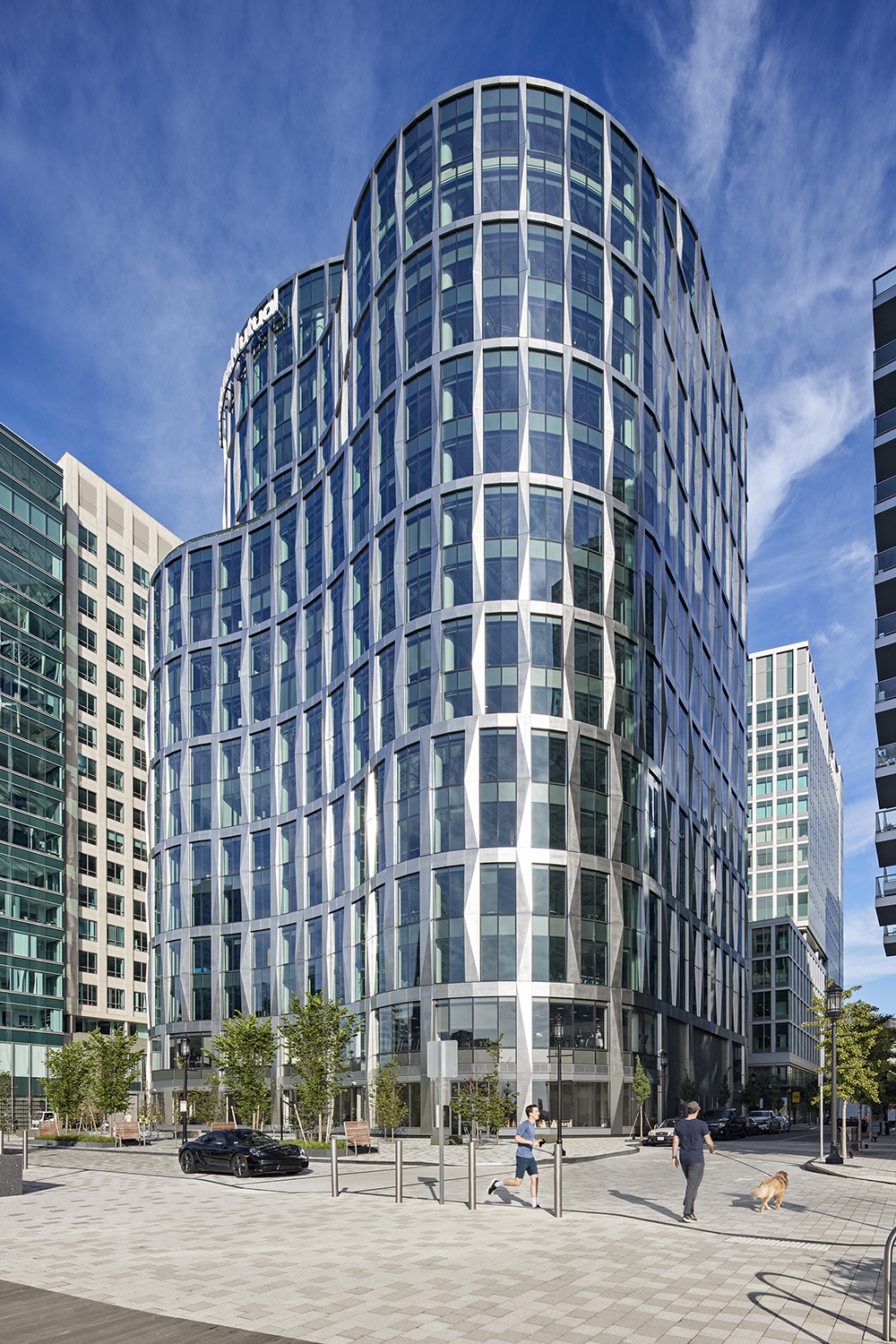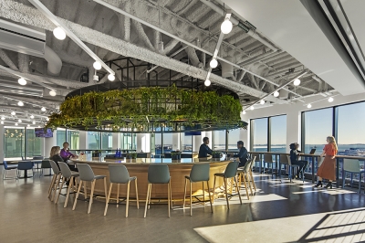With its curvilinear exterior and tiered set-backs, MassMutual’s 17-story, LEED-CSv4 Platinum-certified headquarters establishes a distinctive presence on Boston Harbor. Its curving façade incorporates folded polished stainless steel panels at contrasting angles that accentuate the building’s shape and reflect the shifting harbor waters and sky. Setbacks add movement to the building and create two employee terraces. The structure’s two-story piers are arranged with the widest grounding the building on lower levels and decreasing in width on the upper levels, asserting an increasing sense of lightness as the building rises.