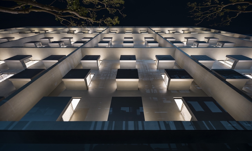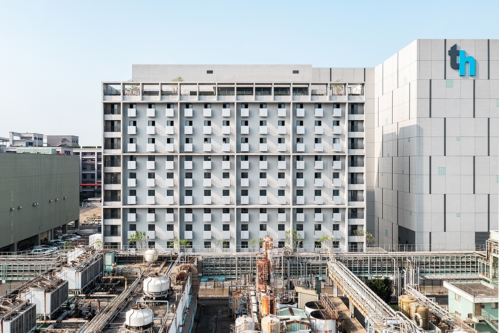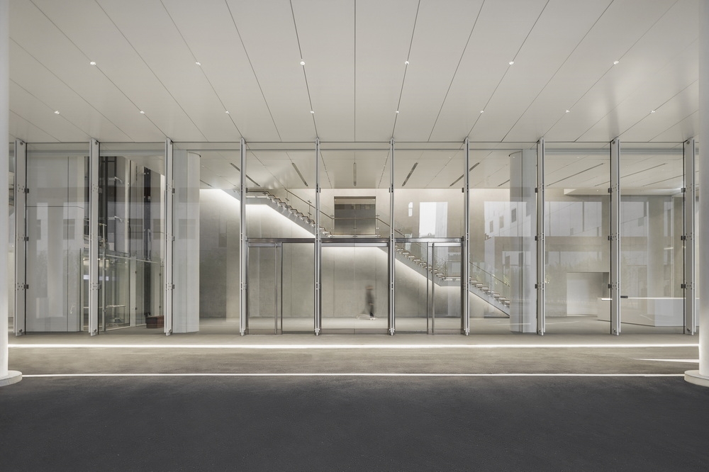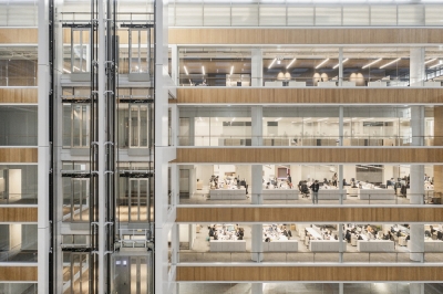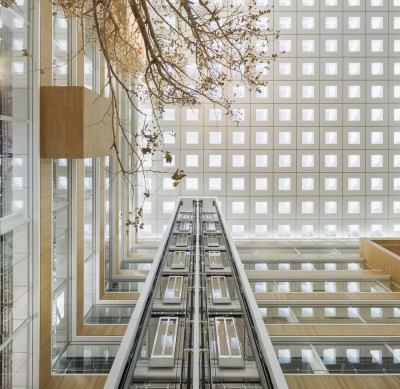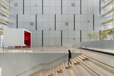 To avoid the chaotic scenery of the industrial site, the project is designed to be inward-facing, highlighting a 10-story atrium at the heart of the headquarters, and providing a pleasant courtyard for employees to relax, socialize, or attend corporate events. Natural light filters through the waffle slab above, and rows of trees at the lower level add a touch of soft greenery. Numerous solid boxes with large openings protrude out into the courtyard, creating informal meeting spaces. In the interior, main circulation and meeting spaces are configured around the atrium, visible behind glass walls. Horizontal timber bands run around the perimeter at each level. Transparent partitions allow visual connections between occupants on different floors, promoting an open and lively work environment.