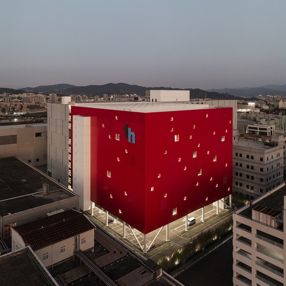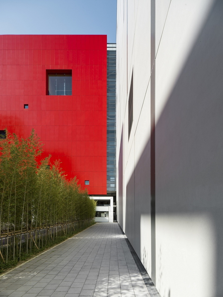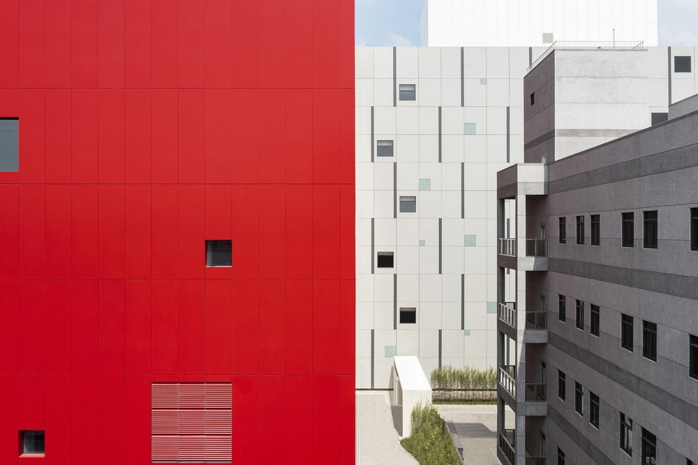 The site covers 16,700 square meters with a total floor area of 89,000 square meters, encompassing the headquarters building, the fabrication plant, and staff accommodation. The headquarters building is a red square box punctured by openings of varying sizes, while the fabrication plant at the rear is clad in precast modular concrete panels with aluminum panels and terracotta tiles.