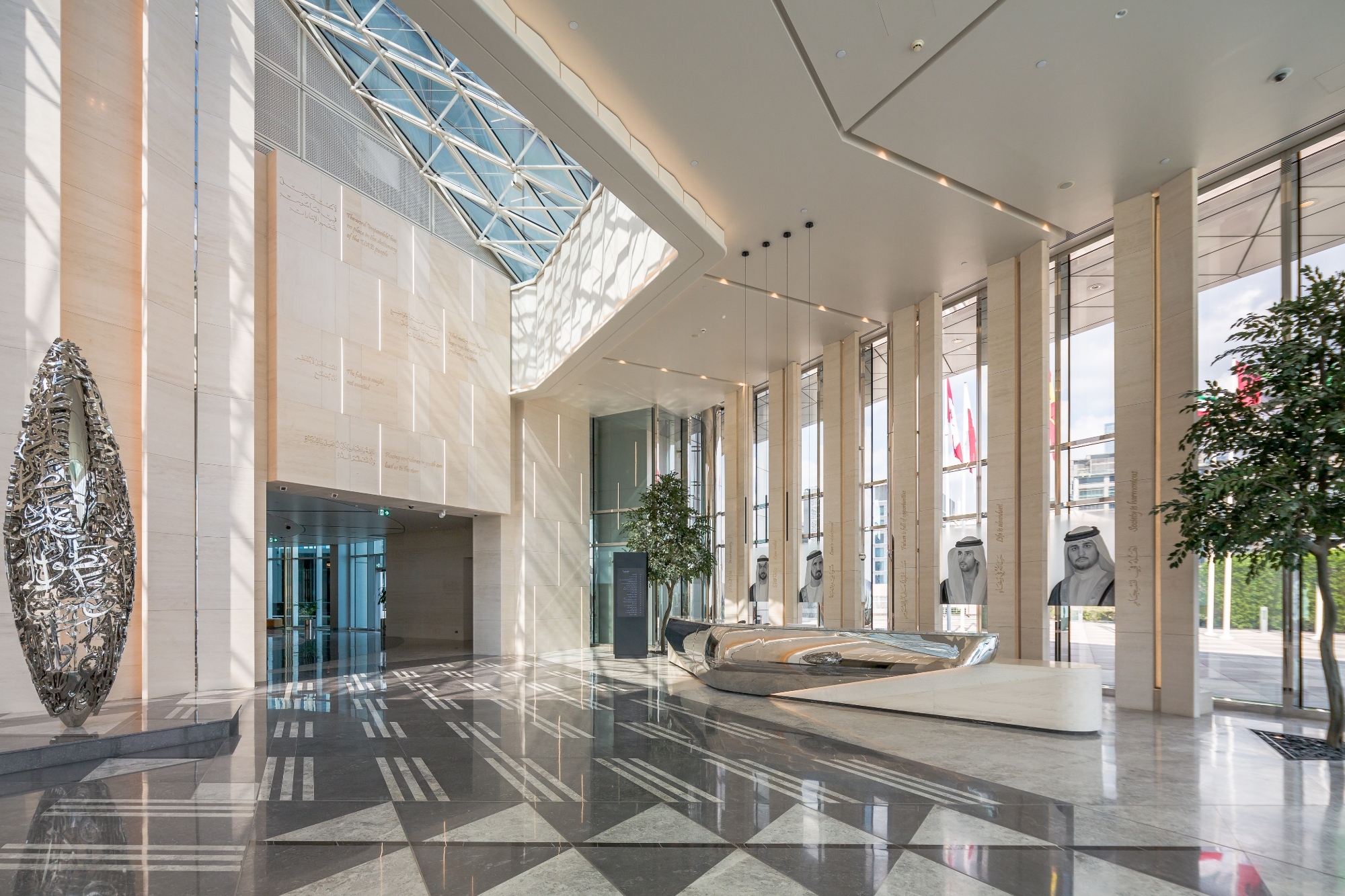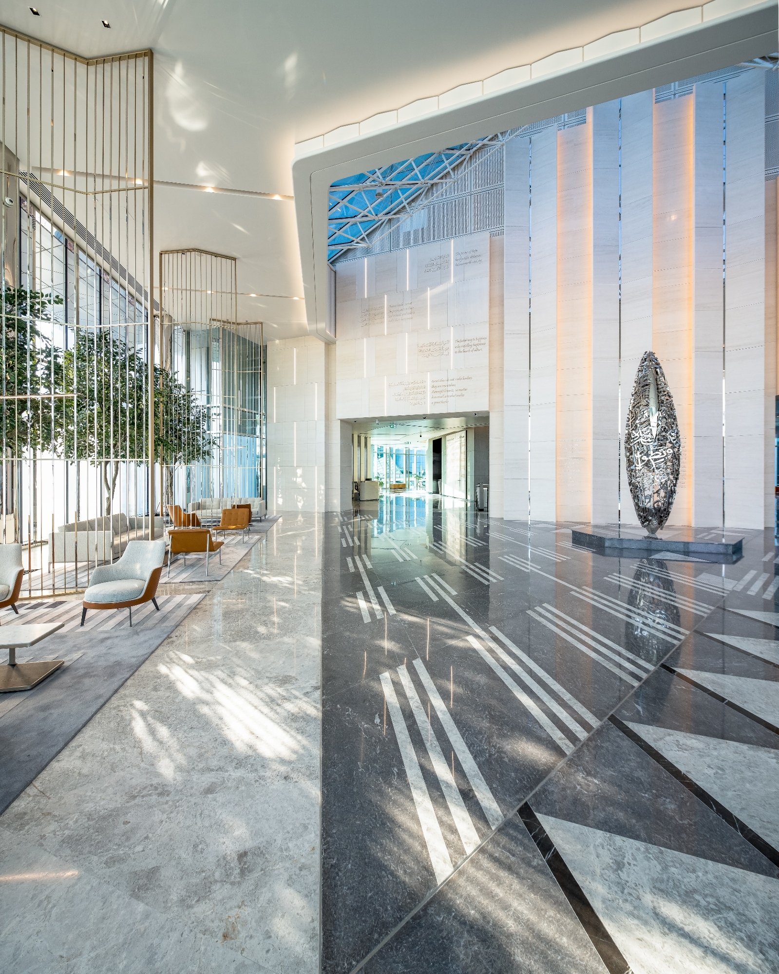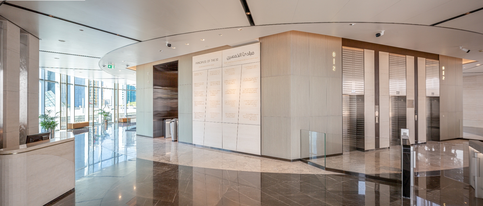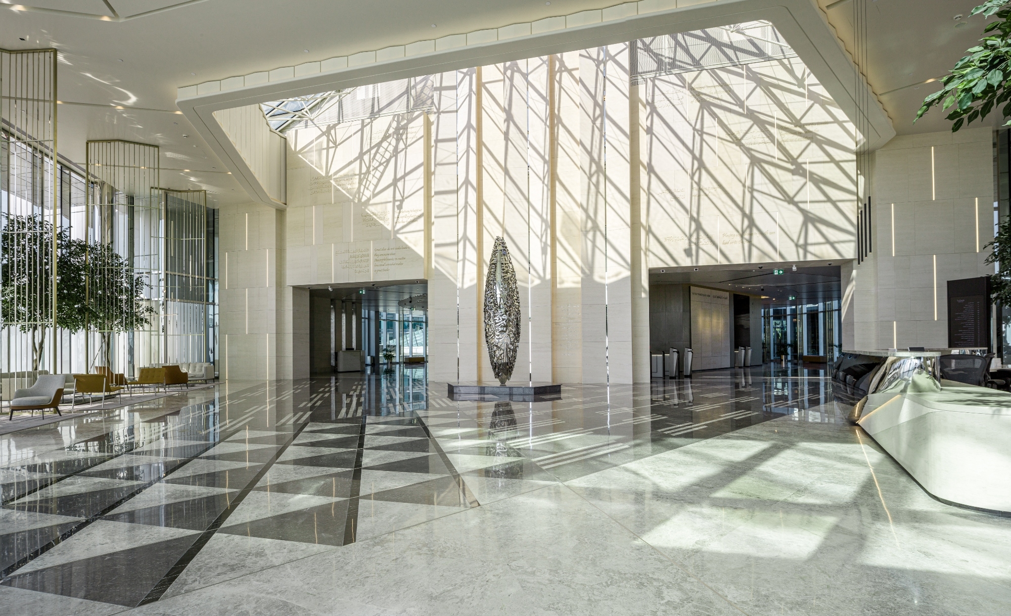 The design tells Dubai’s story, from desert life & pearl diving to oil discovery & visionary development, creating a visual journey that bridges time. Symbolism enriches the space, with falcon-inspired geometry reflecting ambition & unity, and a reception desk resembling a falcon’s wing, embodying progress & strength.