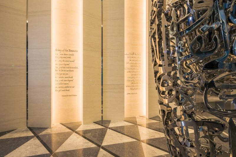 Celebrating the UAE's 50th anniversary, the design merges tradition & innovation, with engraved stones & light panels symbolizing resilience & future promise. Portraits of UAE rulers highlight visionary leadership, while elements like the Mars Mission "Hope Probe" & sculptures of flight symbolize technological advancement.