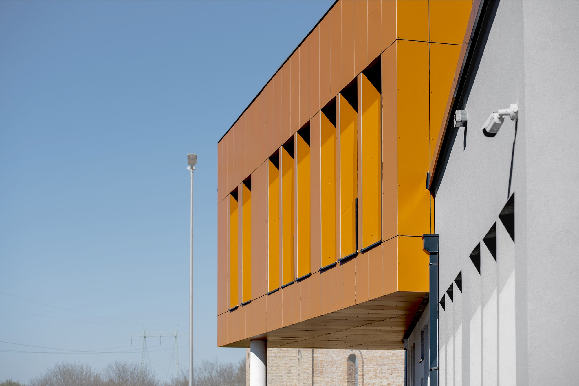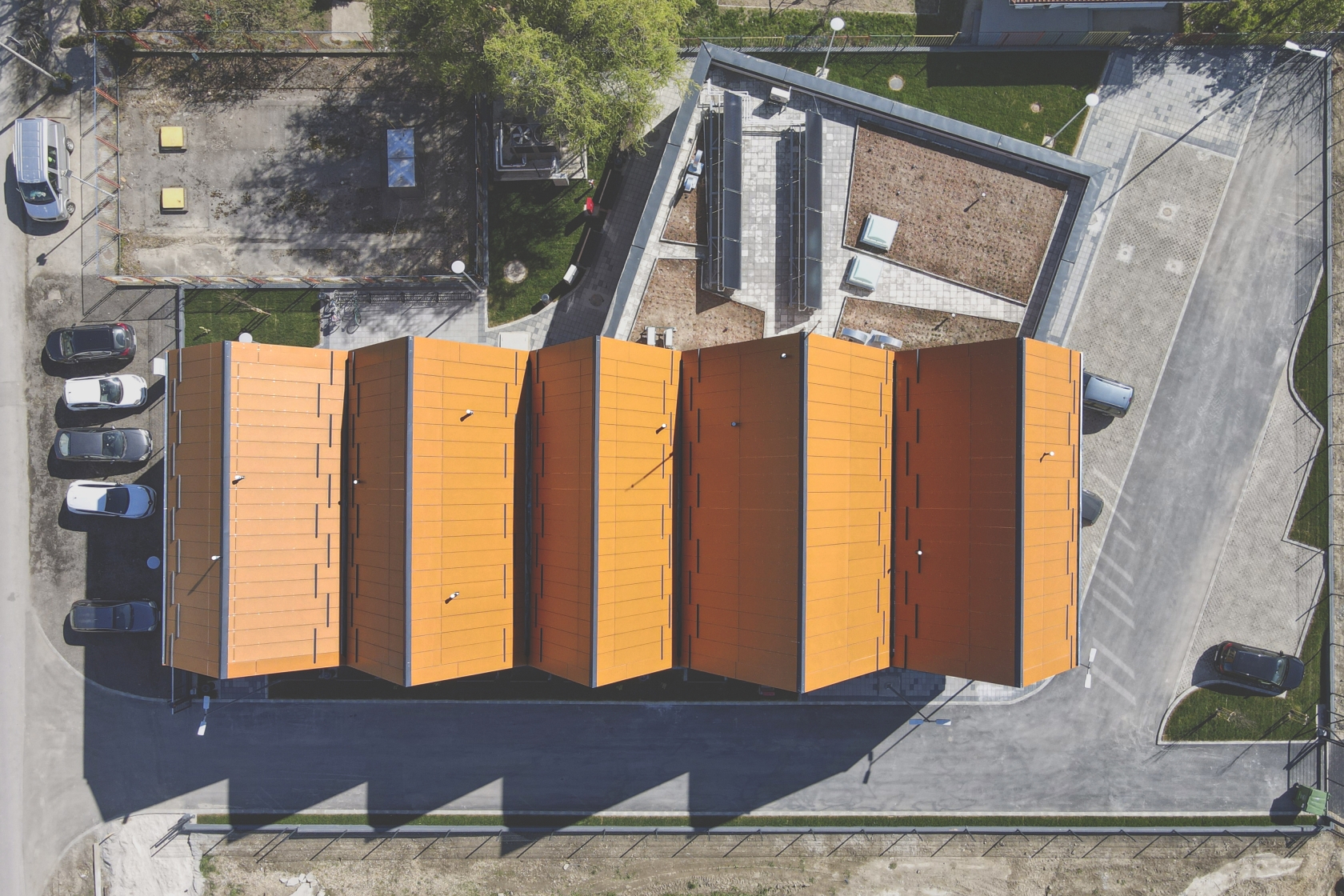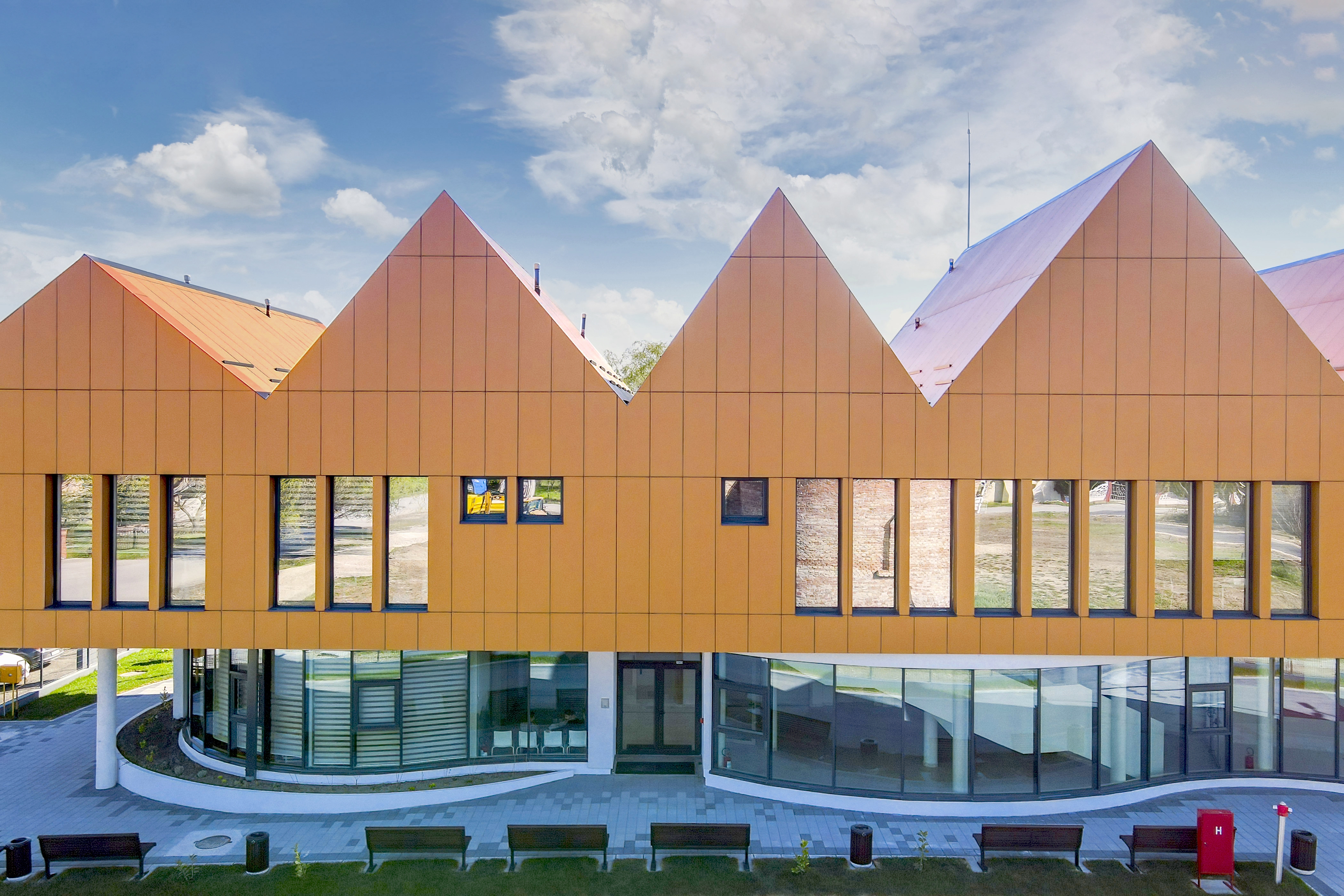 We aimed for the building to provoke curiosity while highlighting its important role in the local community. It features two contrasting shapes: a curved, transparent ground floor and a rectangular, folded first floor, each differing in shape and material. The lightweight materials of the ground floor enhance its levitation effect, retracted from the first floor for emphasis. The enclosed first floor has a roof that visually extends its shape, inspired by the area's terracotta gabled roofs, symbolically integrating the building into the contemporary landscape.
