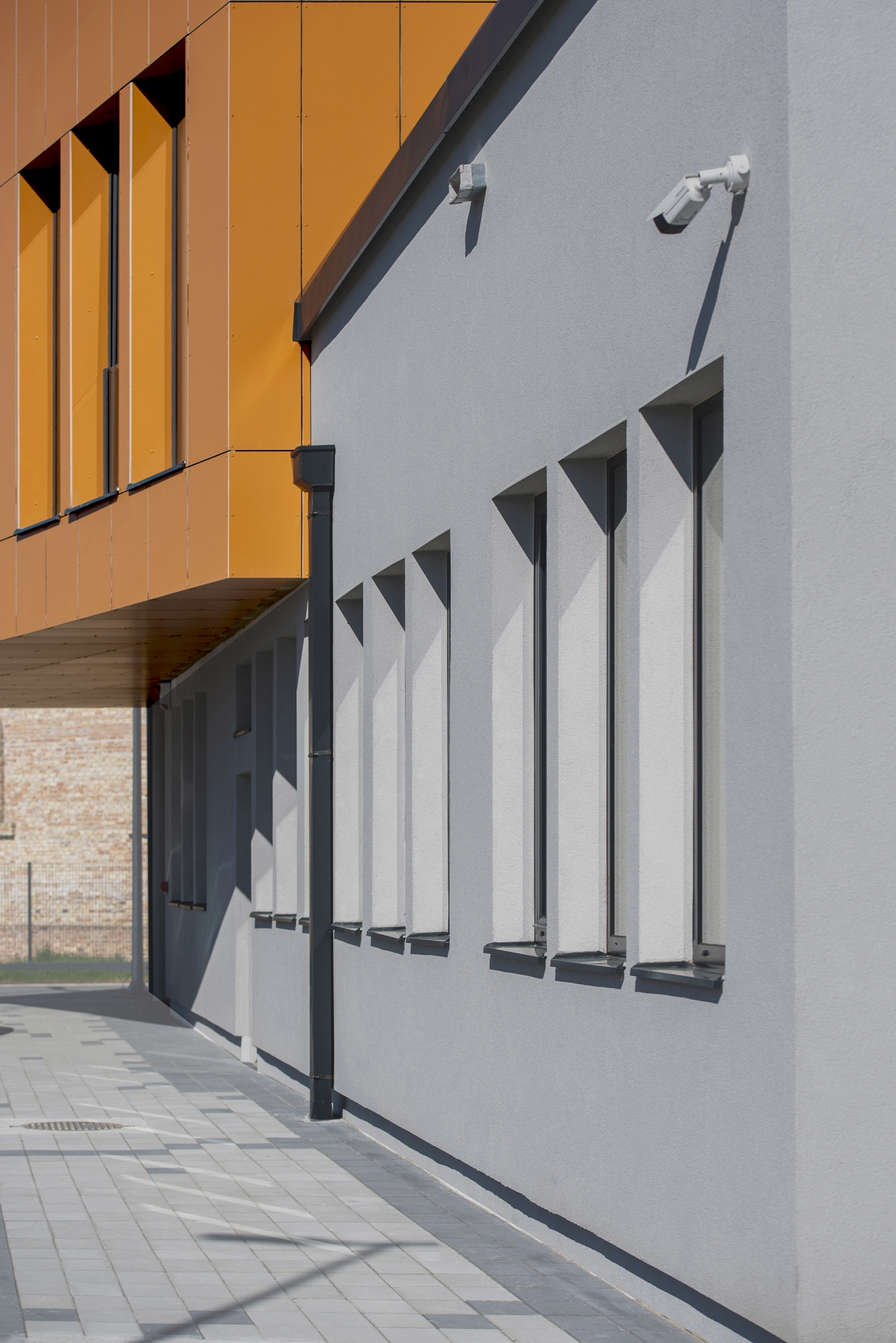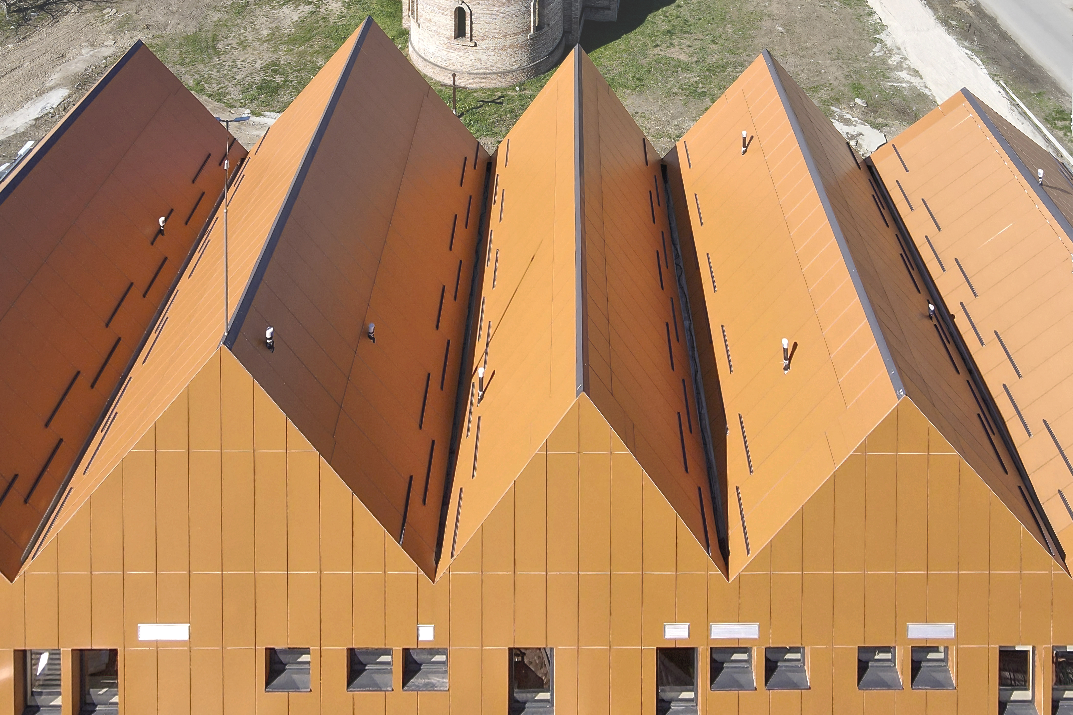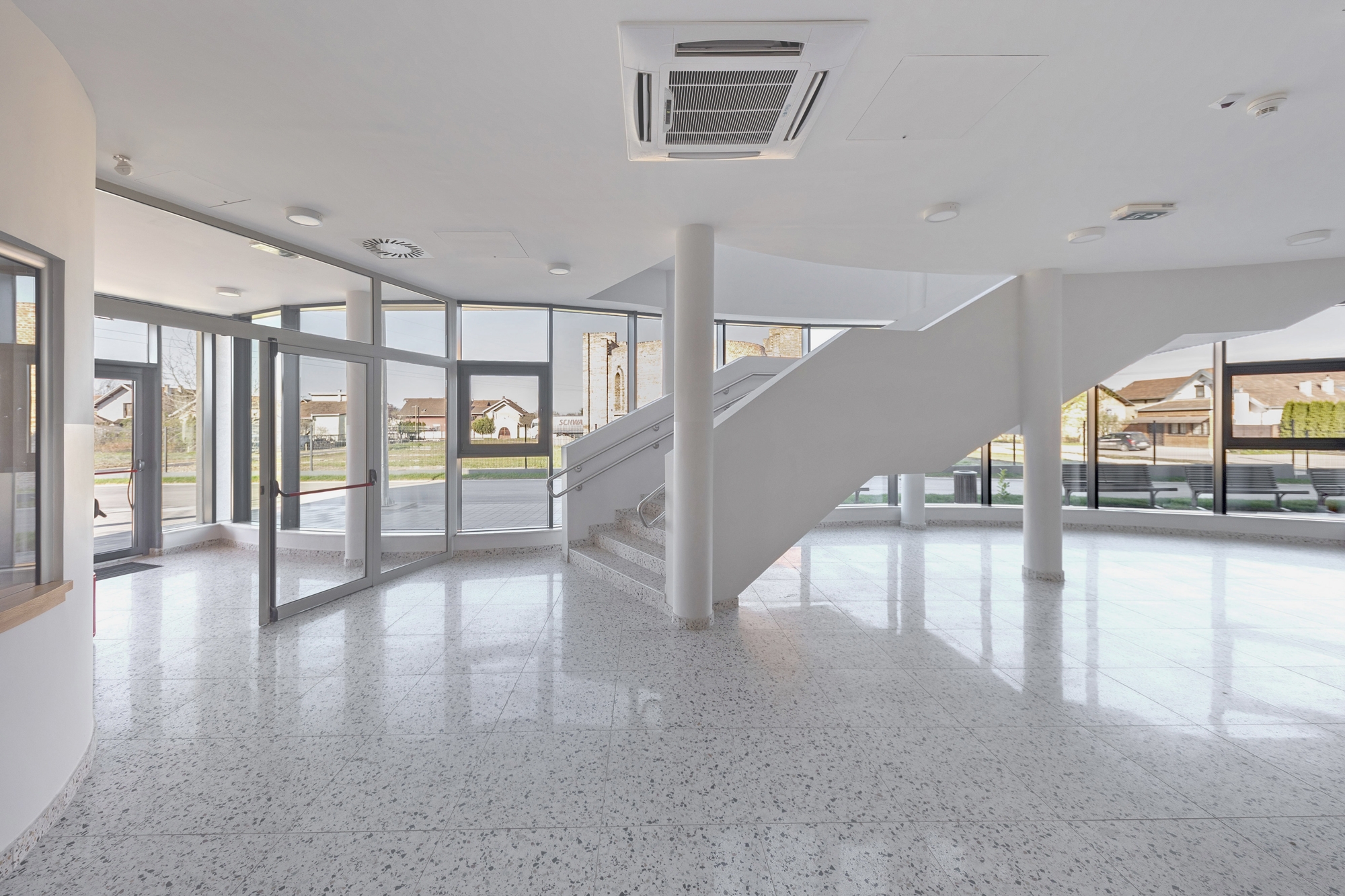 We aimed for the building to provoke curiosity while highlighting its important role in the local community. It features two contrasting shapes: a curved, transparent ground floor and a rectangular, folded first floor, each differing in shape and material. The lightweight materials of the ground floor enhance its levitation effect, retracted from the first floor for emphasis. The enclosed first floor has a roof that visually extends its shape, inspired by the area's terracotta gabled roofs, symbolically integrating the building into the contemporary landscape.