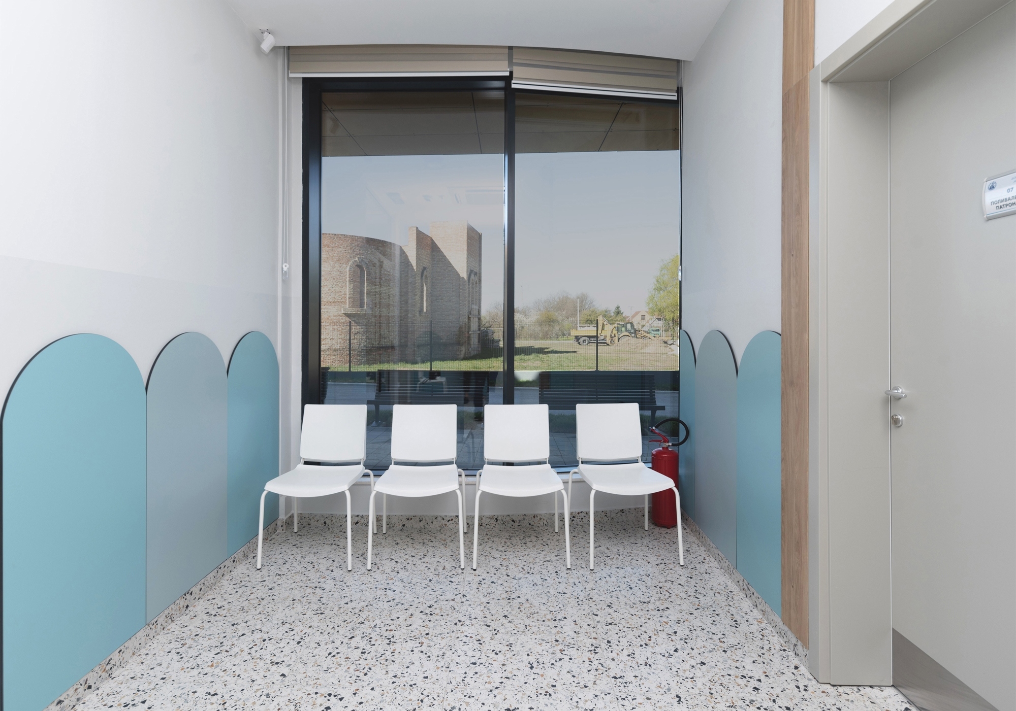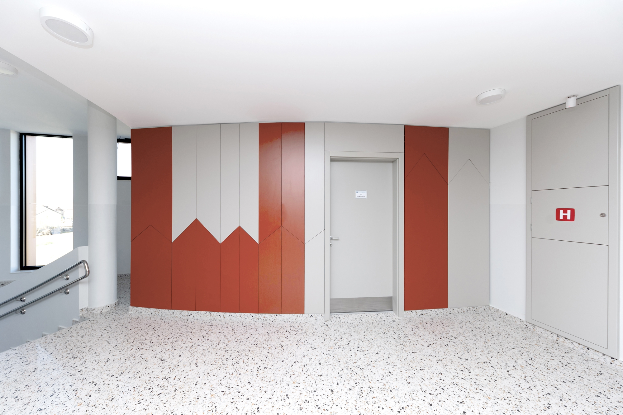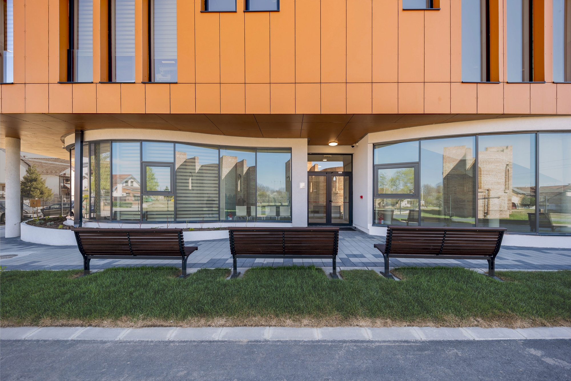 The area is characterized by single-family houses with terracotta gabled roofs, which inspired the building's concept. To create a contemporary feel, the ground floor features fluid, curved forms inspired by nature. The use of glass on the ground-floor facade enhances this lightness and promotes a sense of freedom upon entry, improving the user experience, particularly in a healthcare setting.
