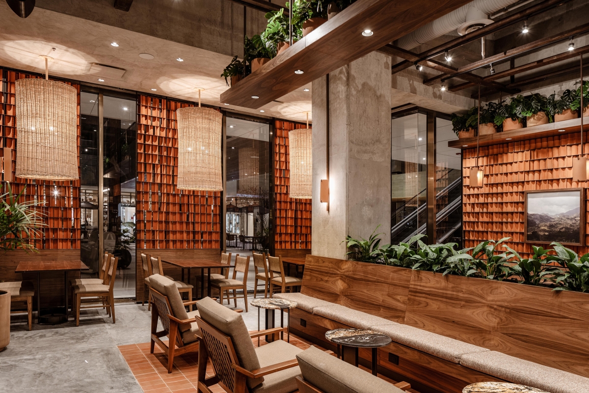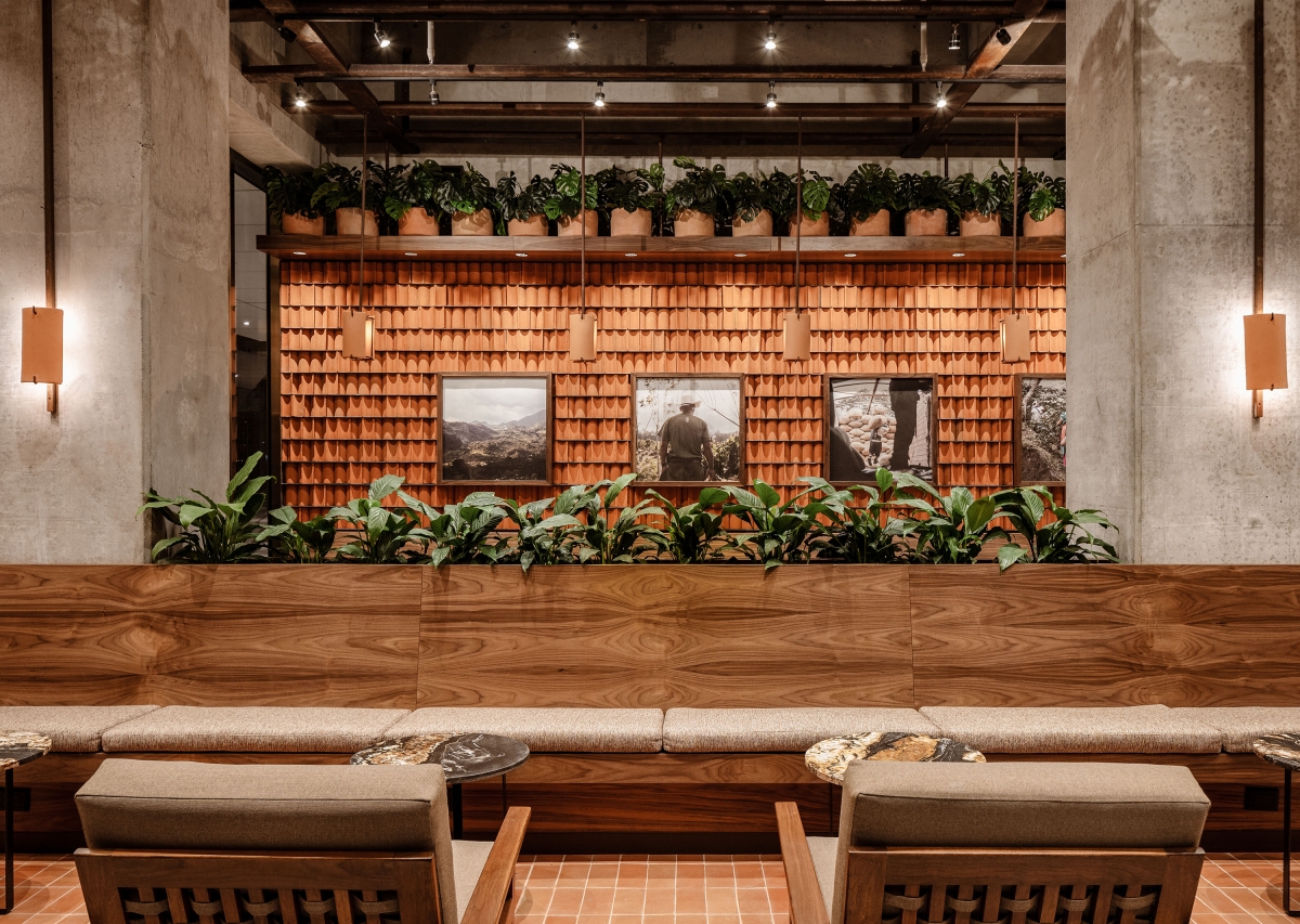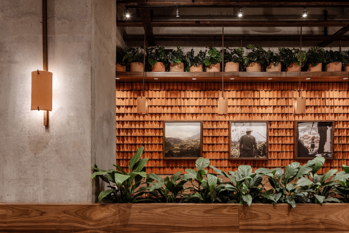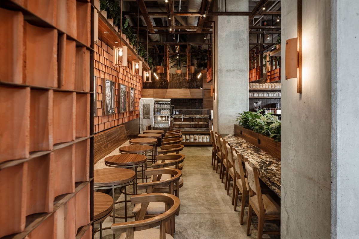 Using this clay tiles as part of the interior design on the walls, not only conveys their ways of life, but also offers a unique and warm texture that will function as an ambiance trademark for the brand. Needless to say, this clay-piece arrangements and lattice have a very powerful impact on the eye; their curvature and material properties help absorb and deflect sound waves to help with the acoustics. When the light is set against the texture, it acquires depth and its curved shadows resemble coffee beans, connecting the space to the product.
