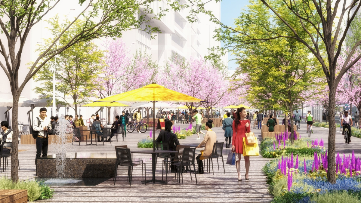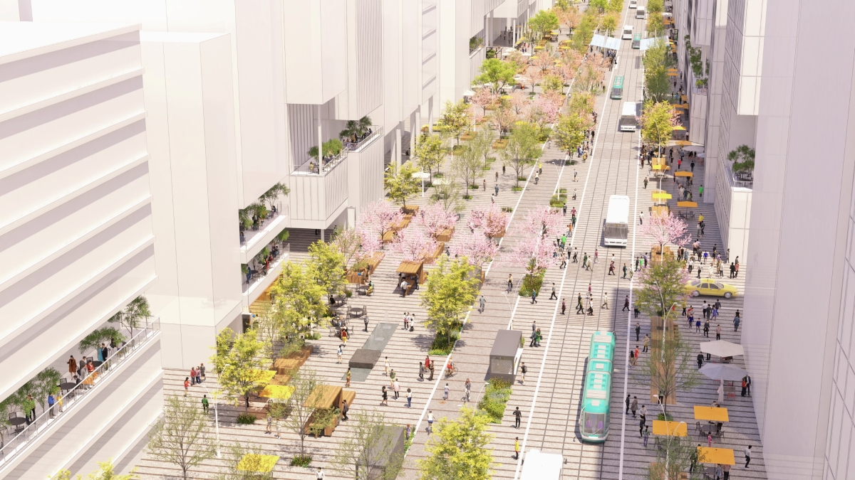 On the eve of the 75th anniversary of the atomic bombing, Hiroshima community leaders and the Kamihatchi Kiteru identified the Aioi District as a core renewal area. The International City of Peace envisions comprehensive transformation of the 40-meter-wide downtown corridor’s six automobiles and two streetcar lanes, narrow sidewalks, and limited urban canopy. Creating a human-centered urban district, the Aioi Street Transit Park is a mosaic of multi-generational and flexible open space. Using an urban gird to unify the street, the design combines a linear park with a transit mall. Surrounded by a tranquil open space, the streetcar lanes offer convenient access to public transit and connectivity to iconic neighborhoods. Buses share the lanes with micromobility integrate parks, museums, monuments, public art, businesses, and the train station. Community-driven parklets reflect a desire for weekday and night programming as well as weekend celebrations. Once a barrier to pedestrian safety, the Aioi has become an epicenter for social experiments in recent years, curating public realm with vibrant year-round activation.