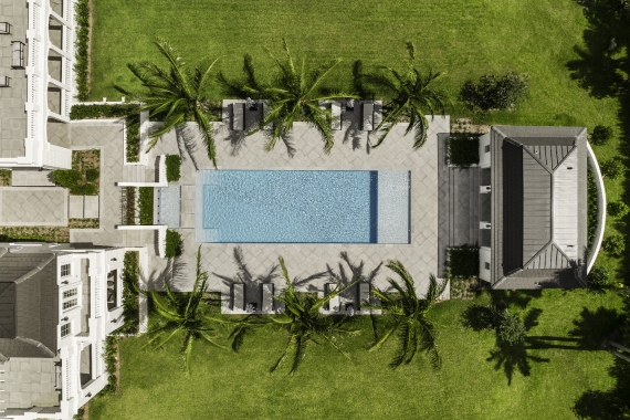 Hardscape design was achieved by placing the pool alongside from the residence to the rear cabana and placing symmetrical palms along side the pool length. The use of palms contributed to introduce the local plant materials yet creating symmetry in the design.