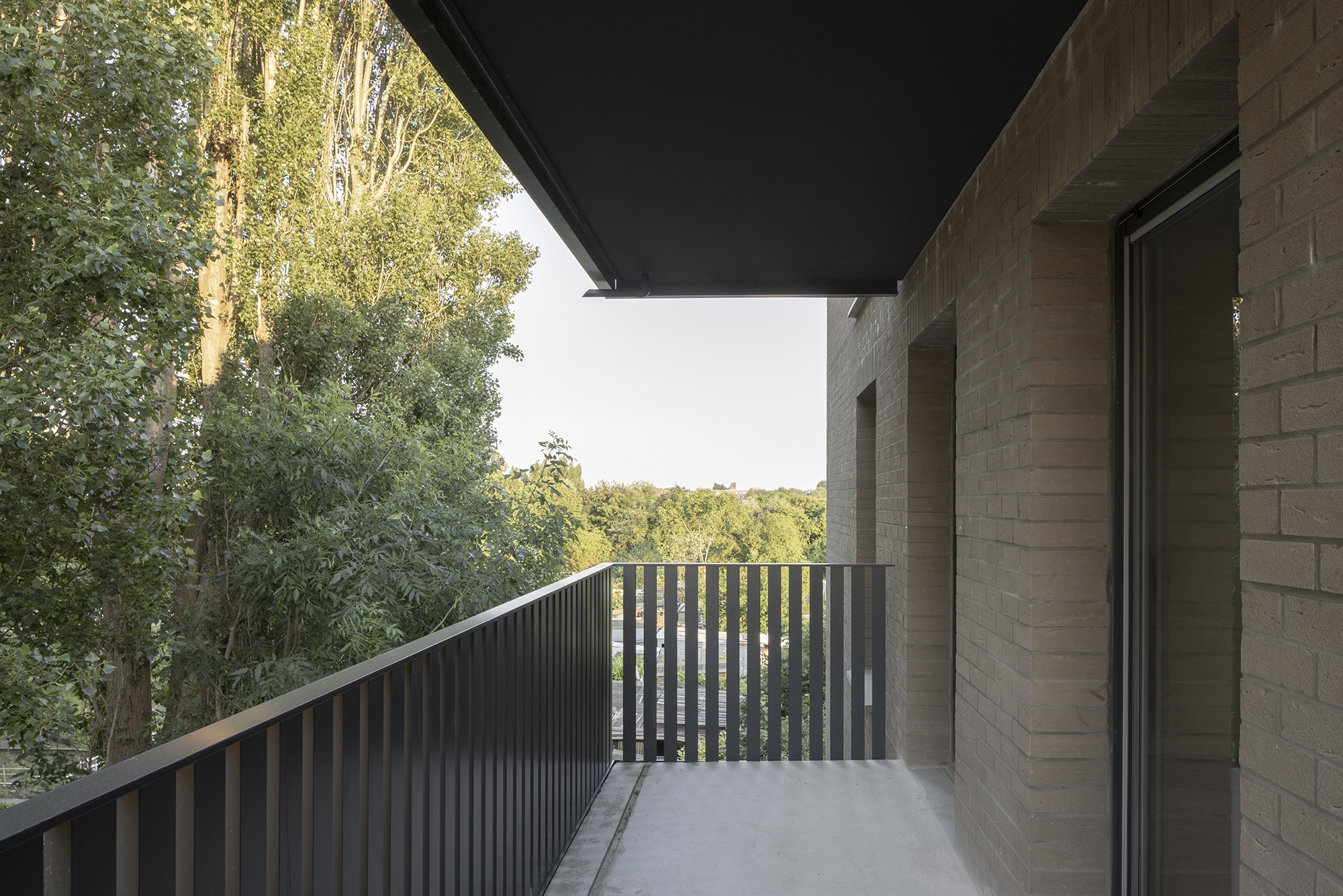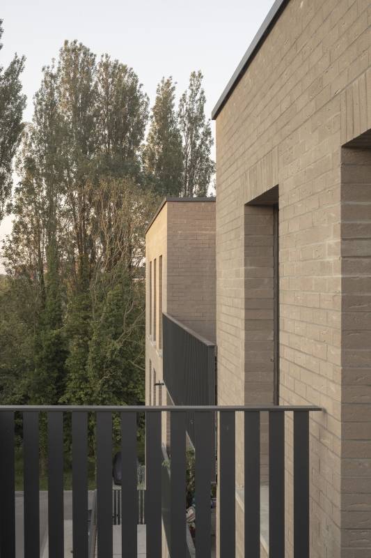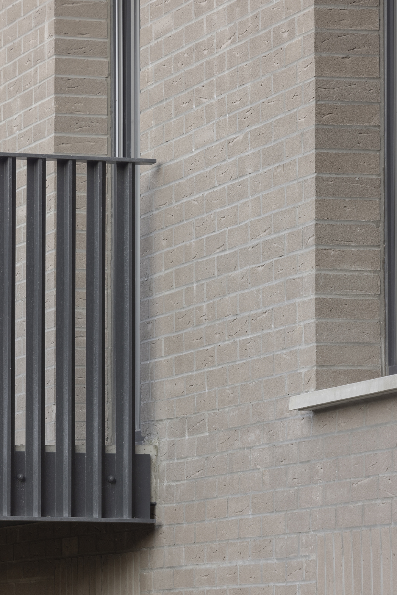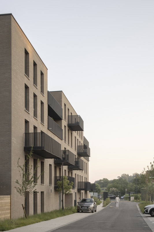 The load-bearing brick facades provide a qualitative and timeless appearance as well as controlled aging. The repetitive aspect of the openings is balanced by the random arrangement of concrete and steel balconies.
