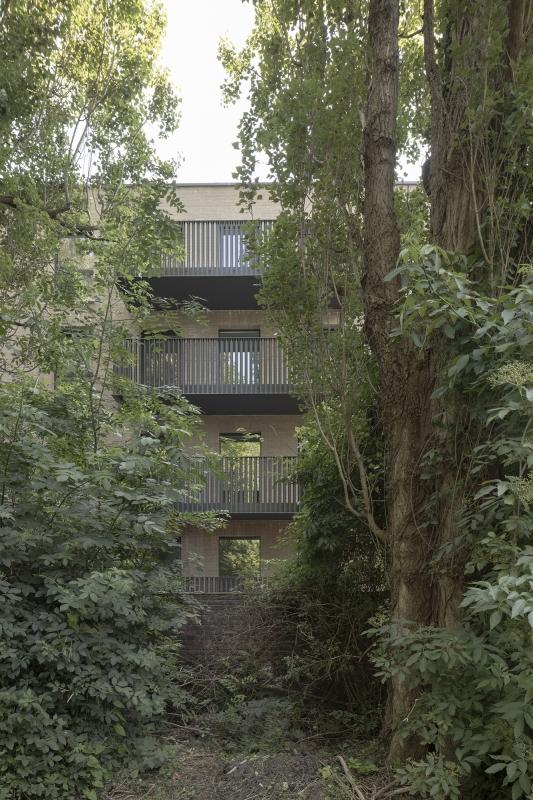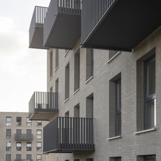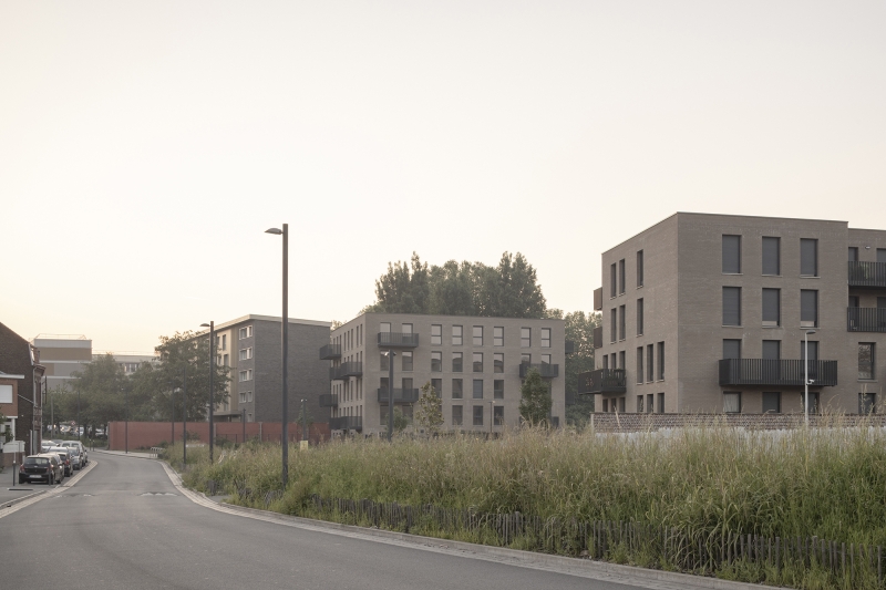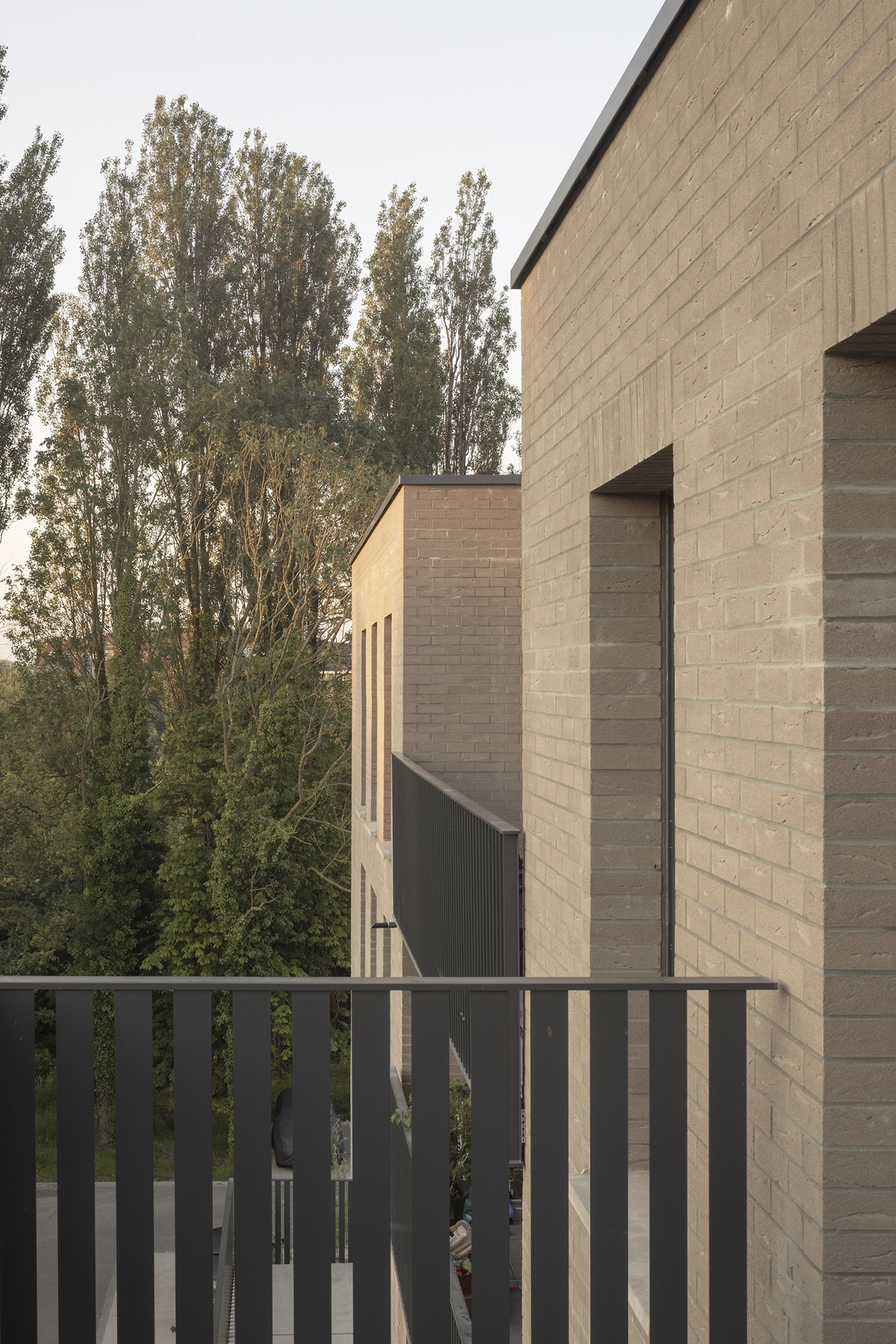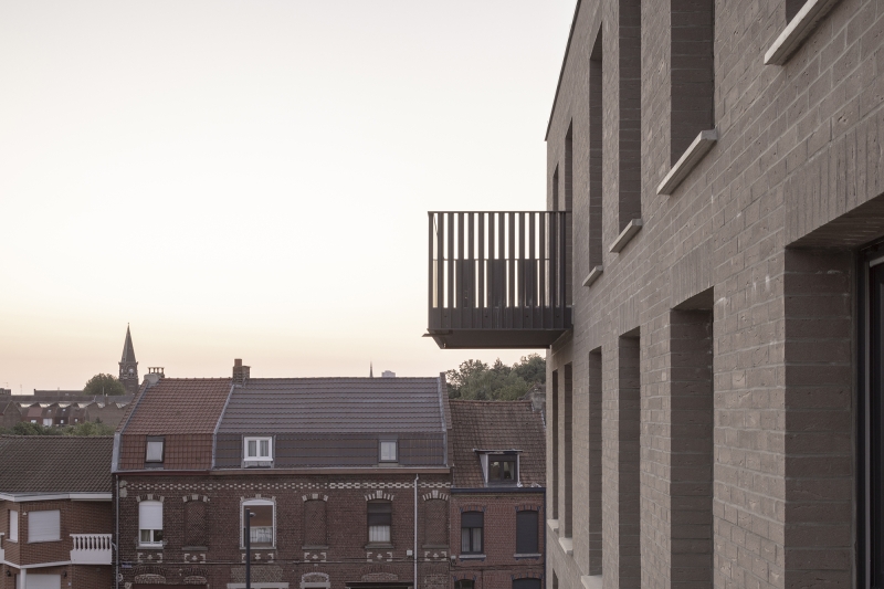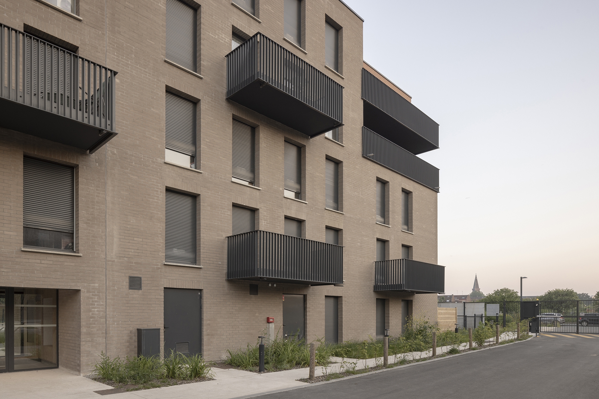 The load-bearing brick facades provide a qualitative and timeless appearance as well as controlled aging. The repetitive aspect of the openings is balanced by the random arrangement of concrete and steel balconies.