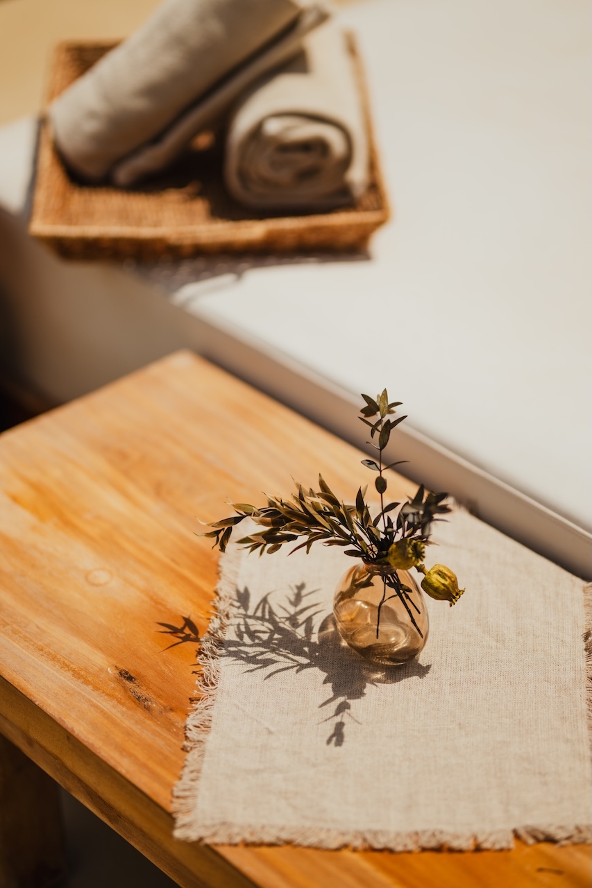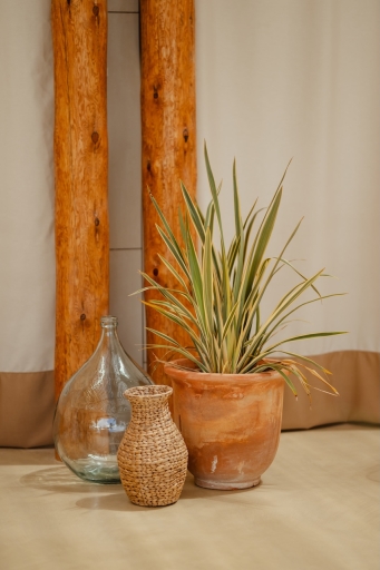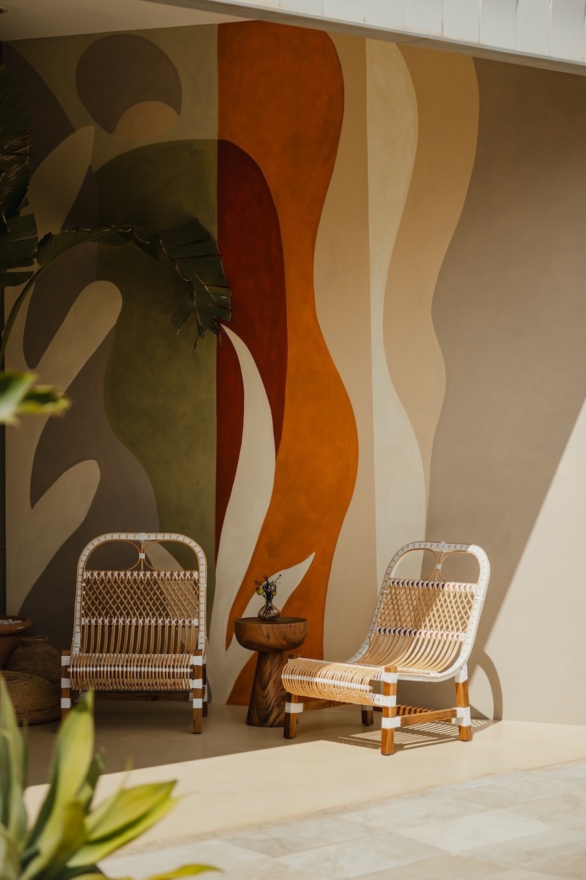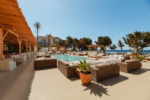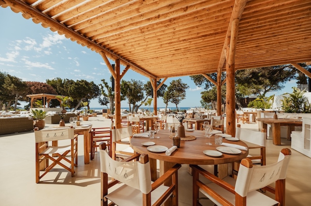 The design blends natural and modern elements to create a luxurious, inviting atmosphere. The outdoor dining area features wooden furniture and a pergola, offering shaded comfort with views of the beach and lush greenery. Light-colored materials and rustic wooden structures contribute to the beachside aesthetic, while seating areas with white-cushioned lounge spaces and natural wooden tables enhance the relaxed, sophisticated vibe. Personalized hand-painted Ibizencan tiles provide a striking and special touch to the restaurant, alongside traditional "hierbas de Ibiza" centerpieces for a true island experience. Three walls are adorned with hand-made paintings by renowned Spanish artist Curro Leyton, adding an artistic touch. Locally sourced terracotta pots further emphasize the artisanal feel, while curtains crafted from off-white Ibizencan linen contribute to the light, airy atmosphere. Elegant signage with sophisticated typography on wooden backdrops reinforces the brand’s identity, creating a seamless blend of nature and luxury—a perfect setting for relaxation and socializing.
