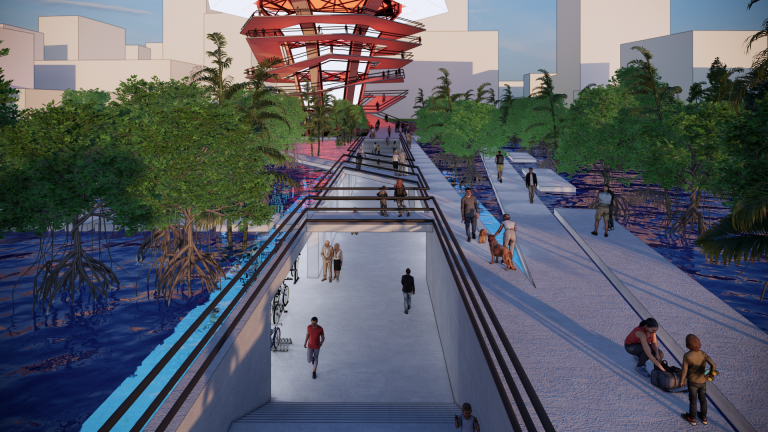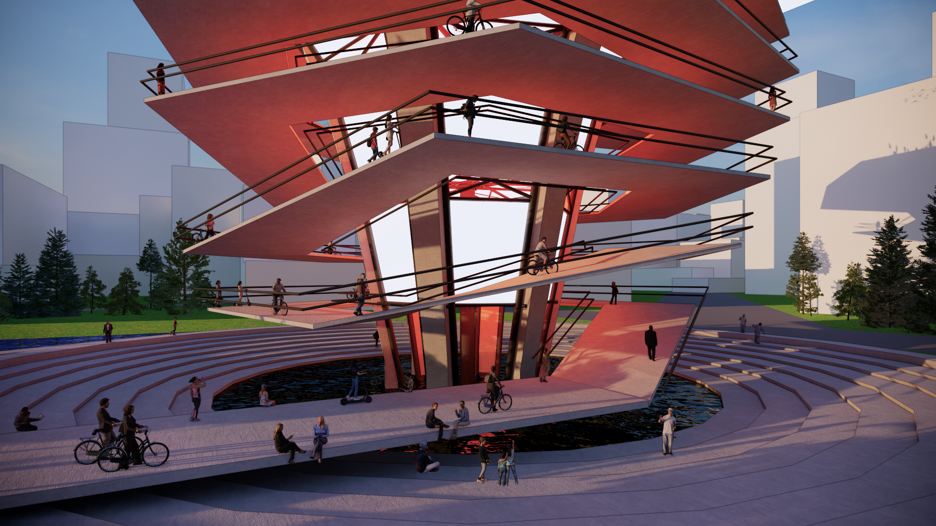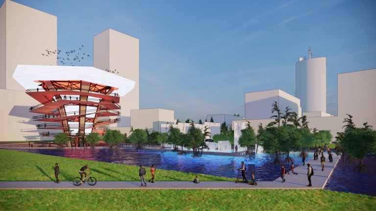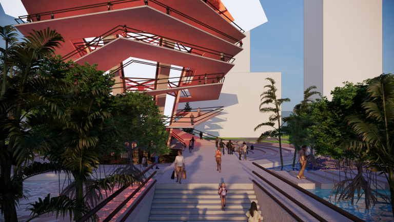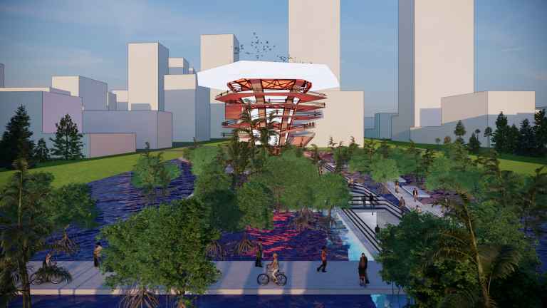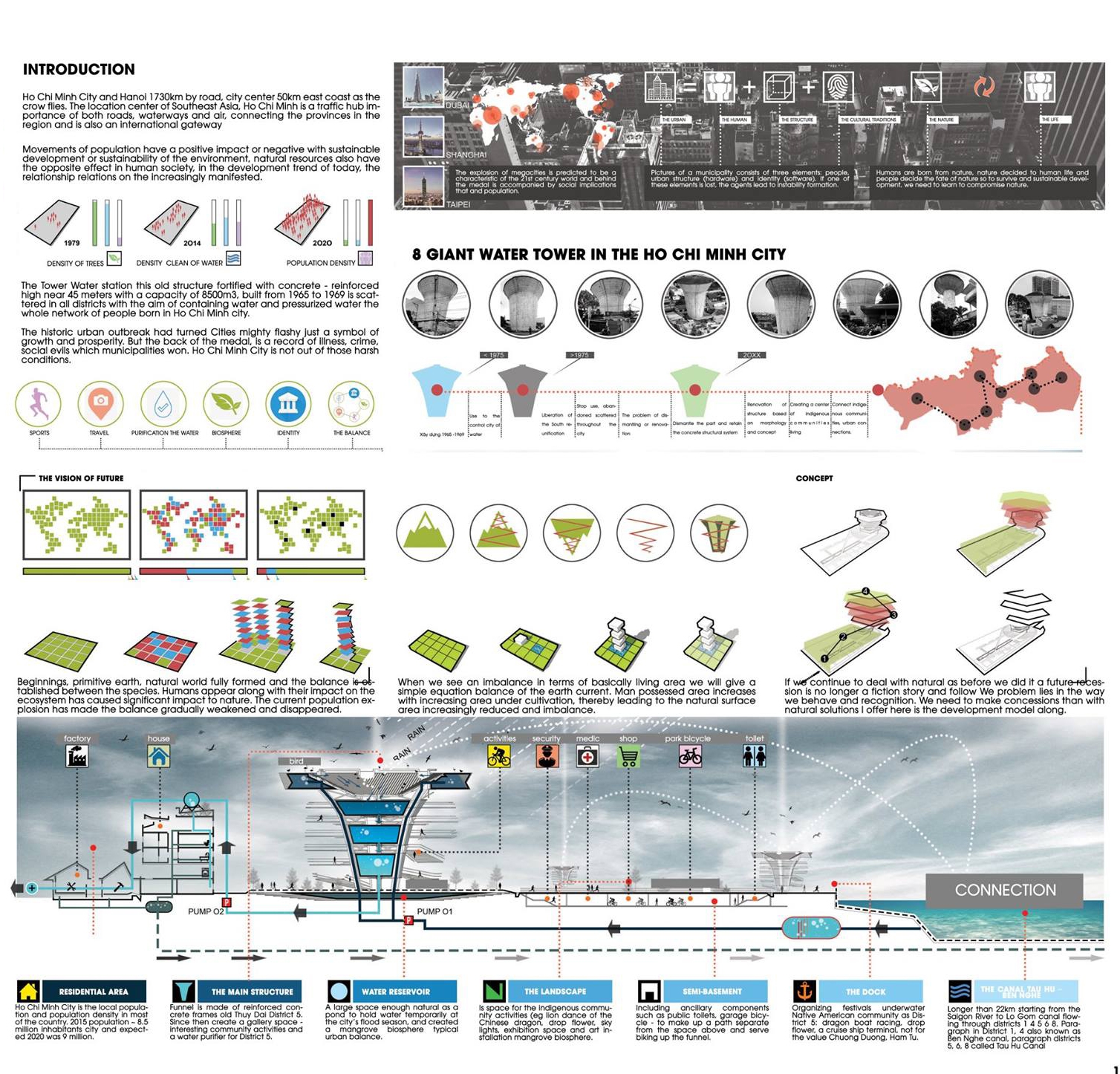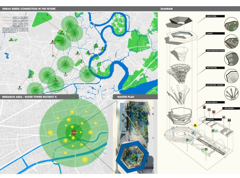 Reuse the main structure and the forgotten space beneath the abandoned Water Towers of Ho Chi Minh City, Vietnam in the 1969s. These water towers, in large numbers, are scattered throughout the city, with enormous demolition costs and the risk of pollution and significant energy consumption when dismantling them. “THE FUNNEL COLOUR” creates a solution for reusing these abandoned water towers, forming a series of recirculating water filtration systems along the Saigon River—the main river of the city—while also creating a new community space that connects people with each other and with nature, establishing a symbiotic and sustainable relationship.