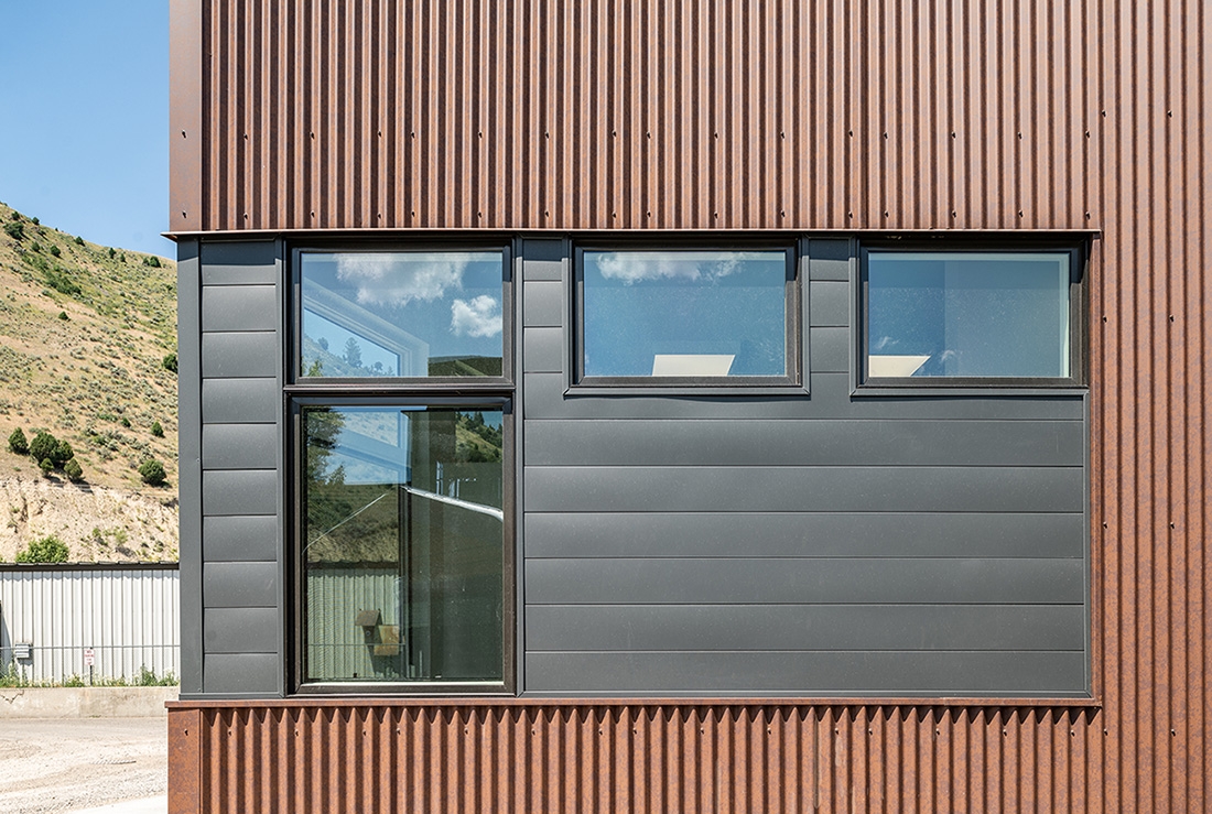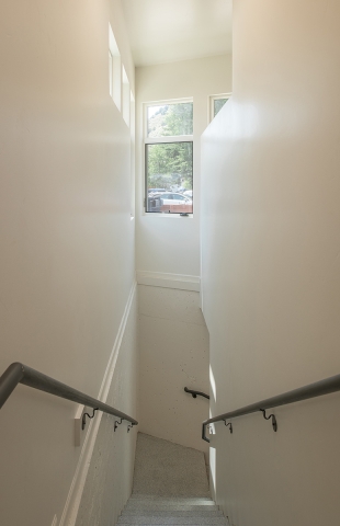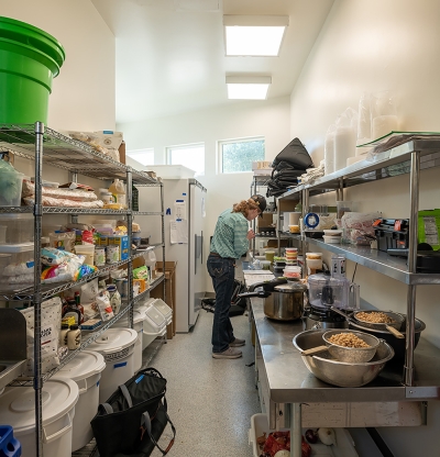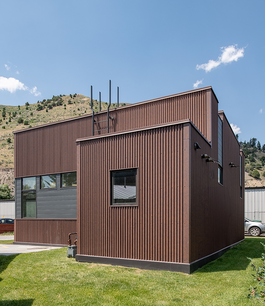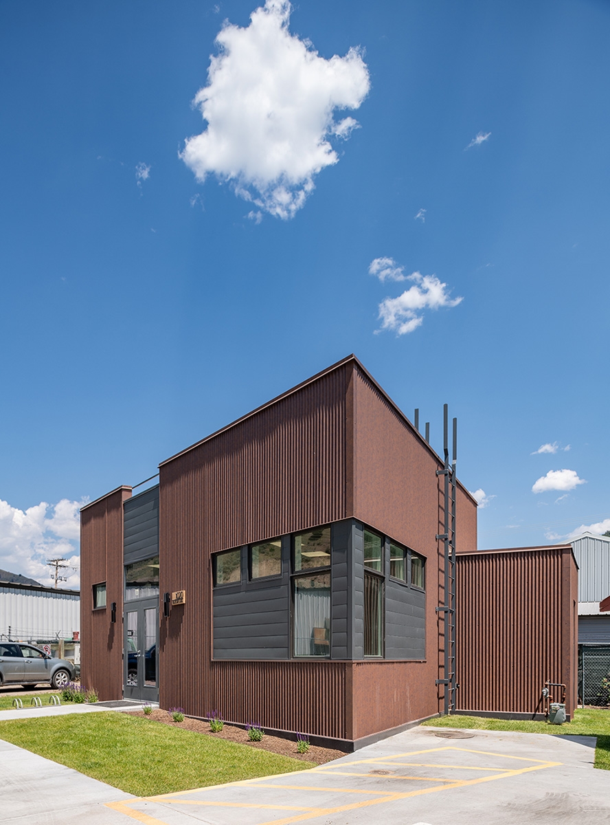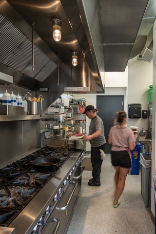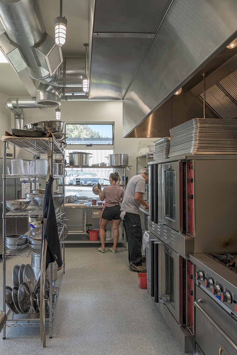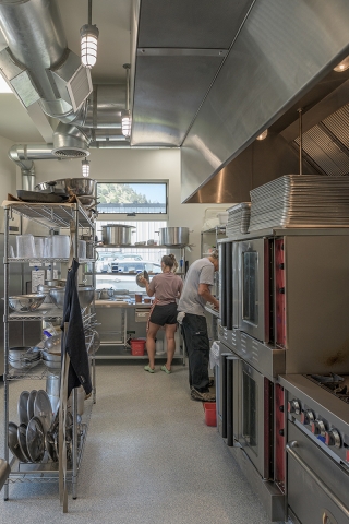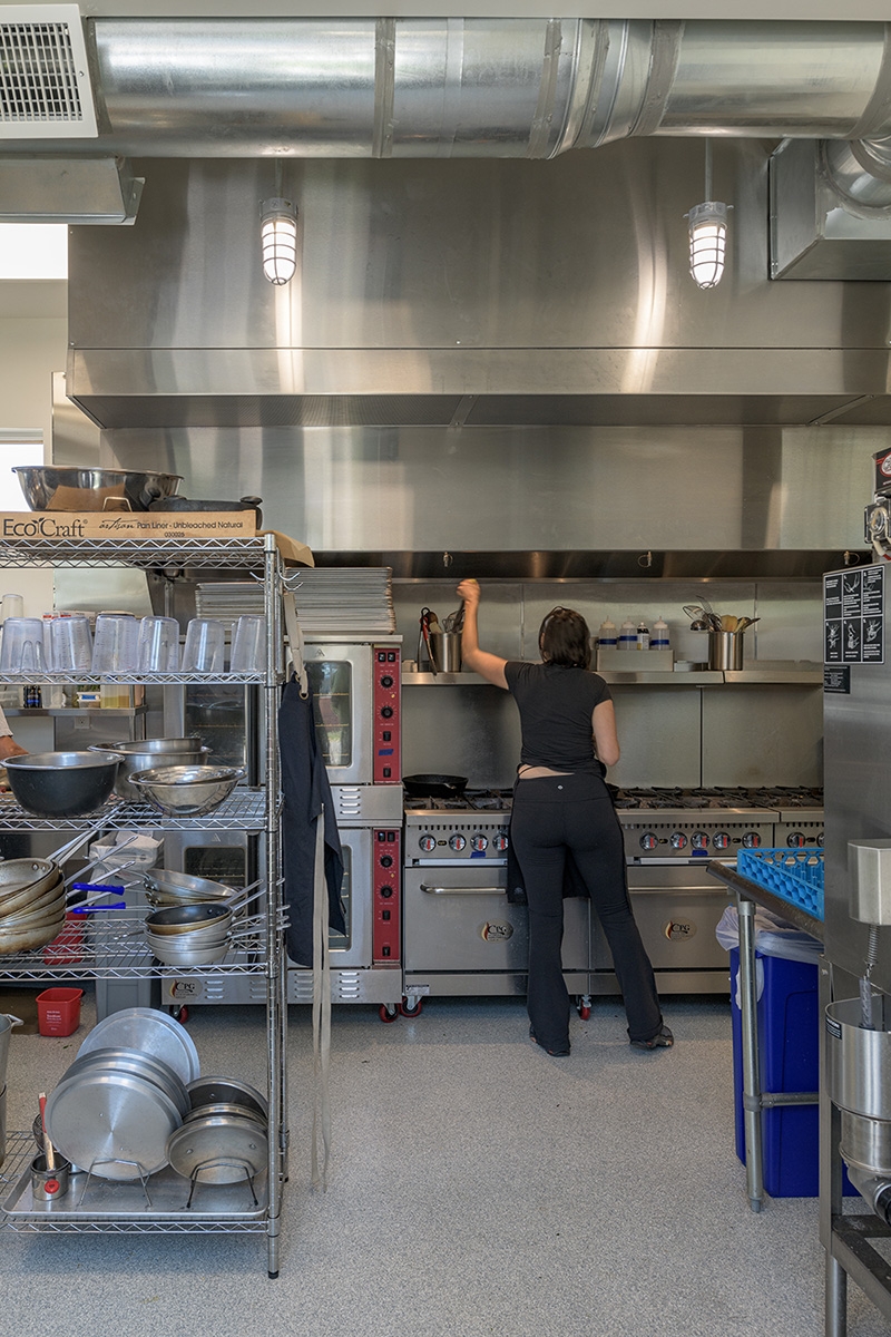 A 700 s.f. footprint was all that was available for this Commercial Kitchen built on a trapezoidal shaped site with an existing rental house. After careful site analysis, the building form needed to follow the shape of the setback lines in order to give the client maximum space in the kitchen. A full basement was included to create additional kitchen area. The main floor kitchen and basement kitchen are designed to be used together or separately in a semi-private way. The kitchens are used to prepare food for catering events, private parties, and in home private cooking. Stainless steel equipment, exposed spiral ductwork and industrial type light fixtures bring character to the Kitchen interior. The exterior design uses fenestration creatively to coordinate with the kitchen functions and bring in natural light, as well as the articulation of two different metal sidings to create interest and relief in the flat walls of the building. Parapets were stepped down over the windows to create rhythm in the trapezoidal box. And a lower roof over the restroom along with a ships ladder roof access work as design elements that enhance the simple form of the project.