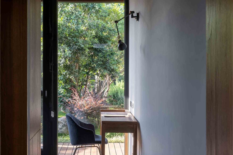 The overall design concept draws inspiration from a Chinese character, meaning "return," evoking a sense of warmth and continuity. This beautifully crafted space features a thoughtfully designed circulation layout that seamlessly connects the two households. In terms of aesthetics, the building's first-floor façade is adorned with striking black concrete, which elegantly breaks away from traditional plain concrete designs.