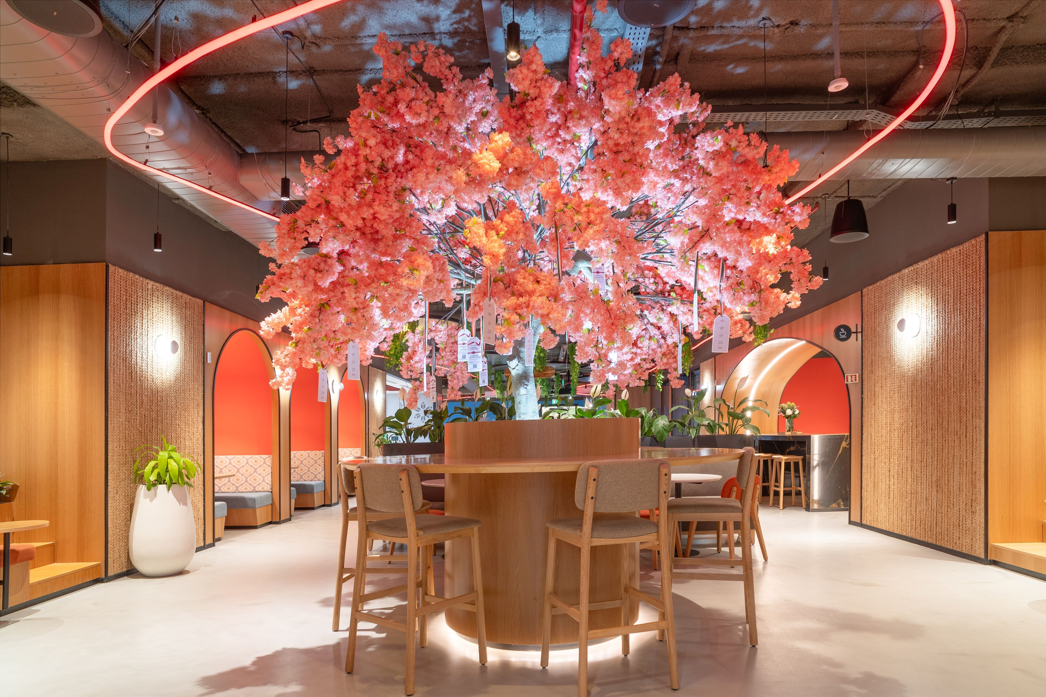 Designed for flexibility and energy, the space incorporates locally sourced materials like cane and wicker alongside Japanese aesthetics. Signature elements—neon strip lighting inspired by Tokyo, brass accents, and custom light fixtures—create a dynamic fusion of tradition and modernity.