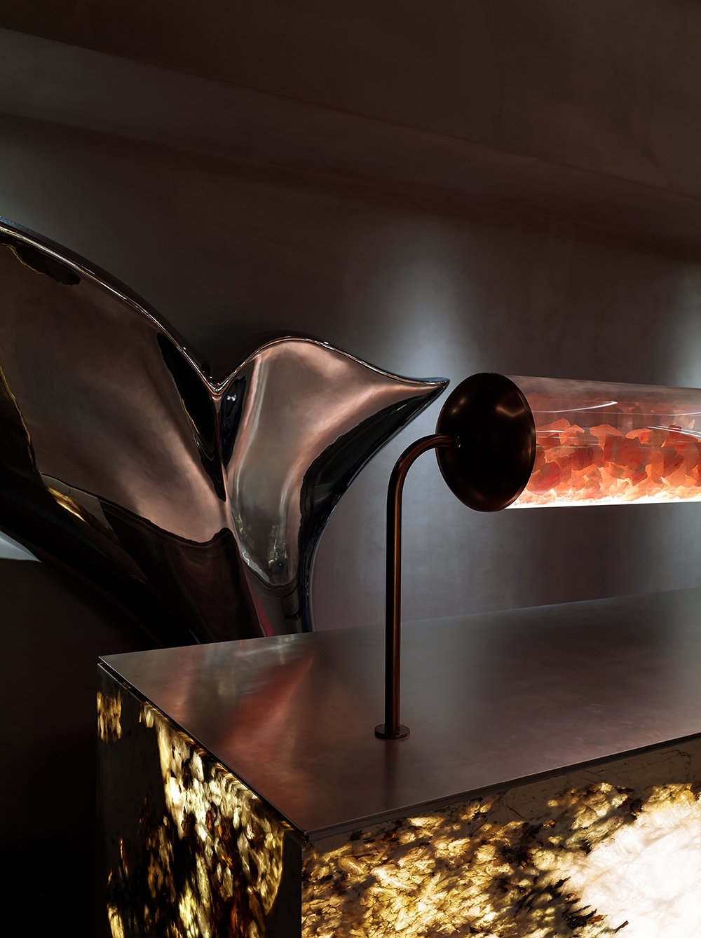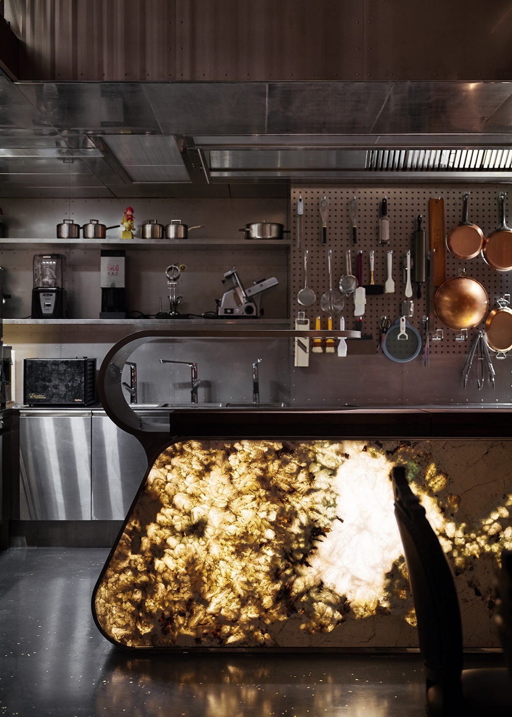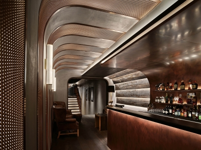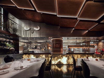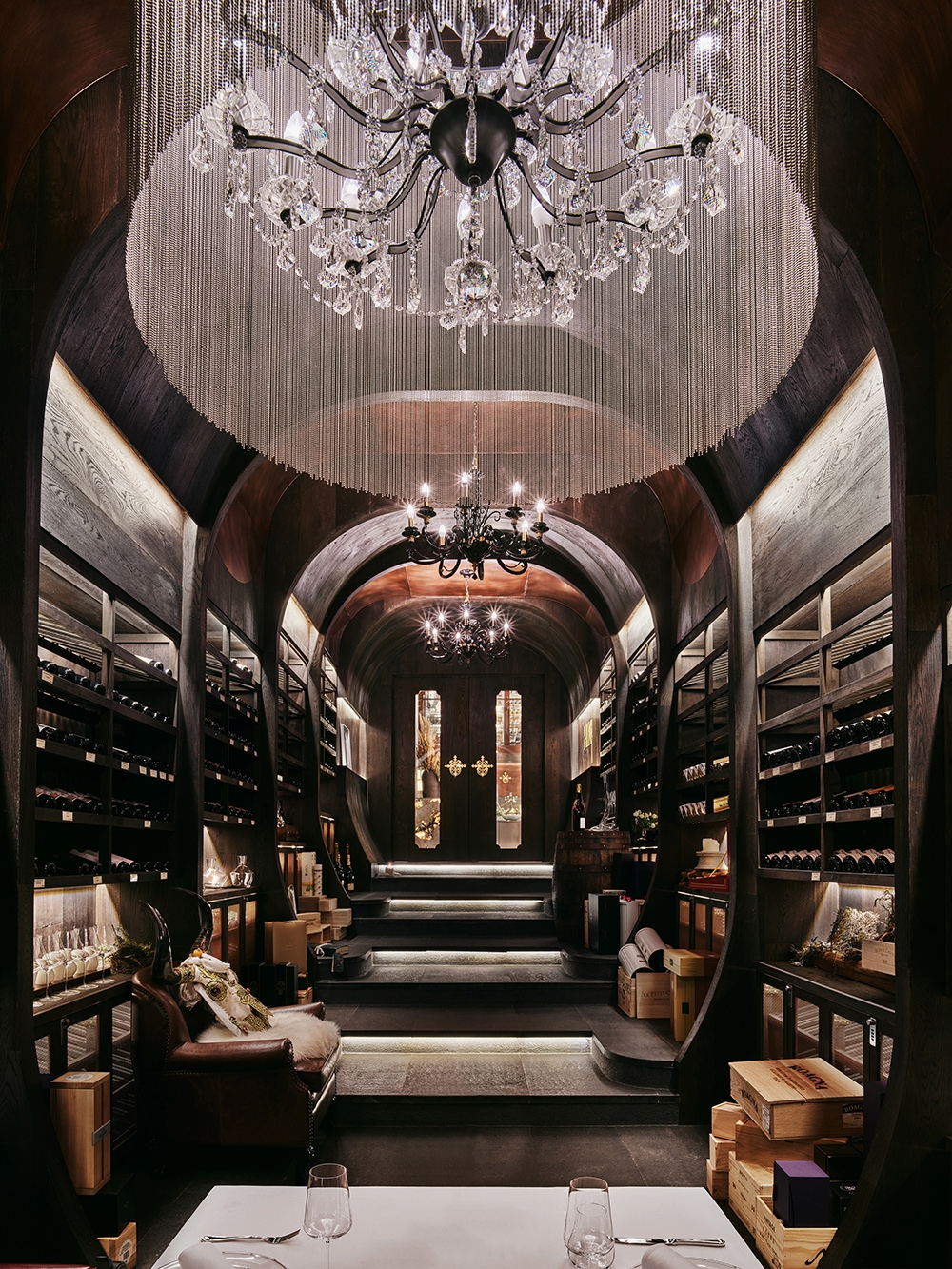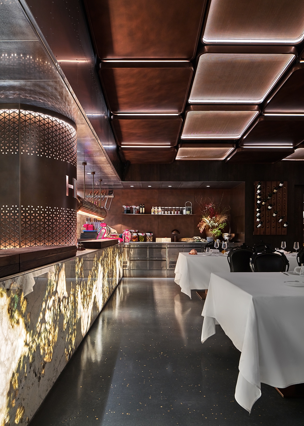 The preparation stations around the dining area are articulated with exquisite materials such as translucent stone, wood planks, perforated copper panels and stainless-steel surfaces. The satin terrazzo flooring, mixed with handcrafted copper chips, conveys a sense of individuality and craftsmanship that is also convenient to maintain. A pair of wooden doors towards the rear of the space unveil the decadent wine cellar. Adorned with crystal chandeliers and oak wine shelves, the celebrated gallery displays a rare collection of fine wines from around the world.