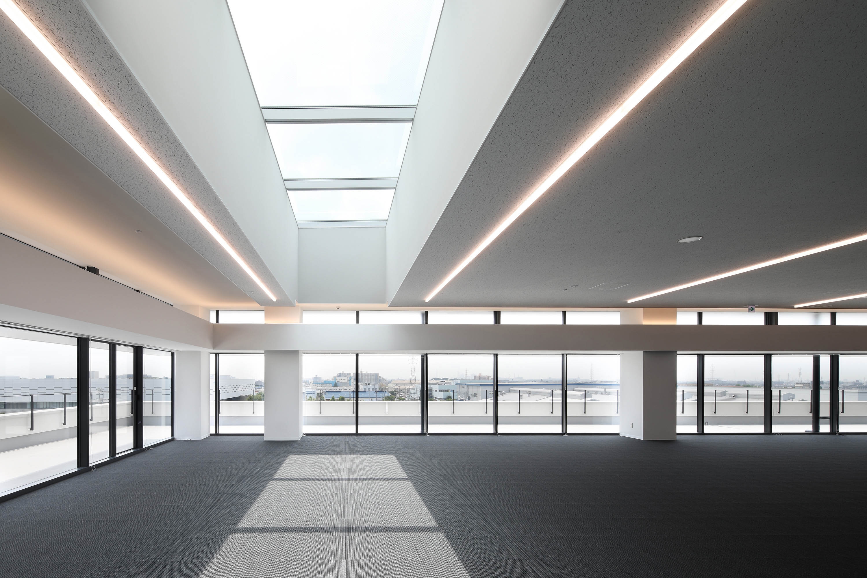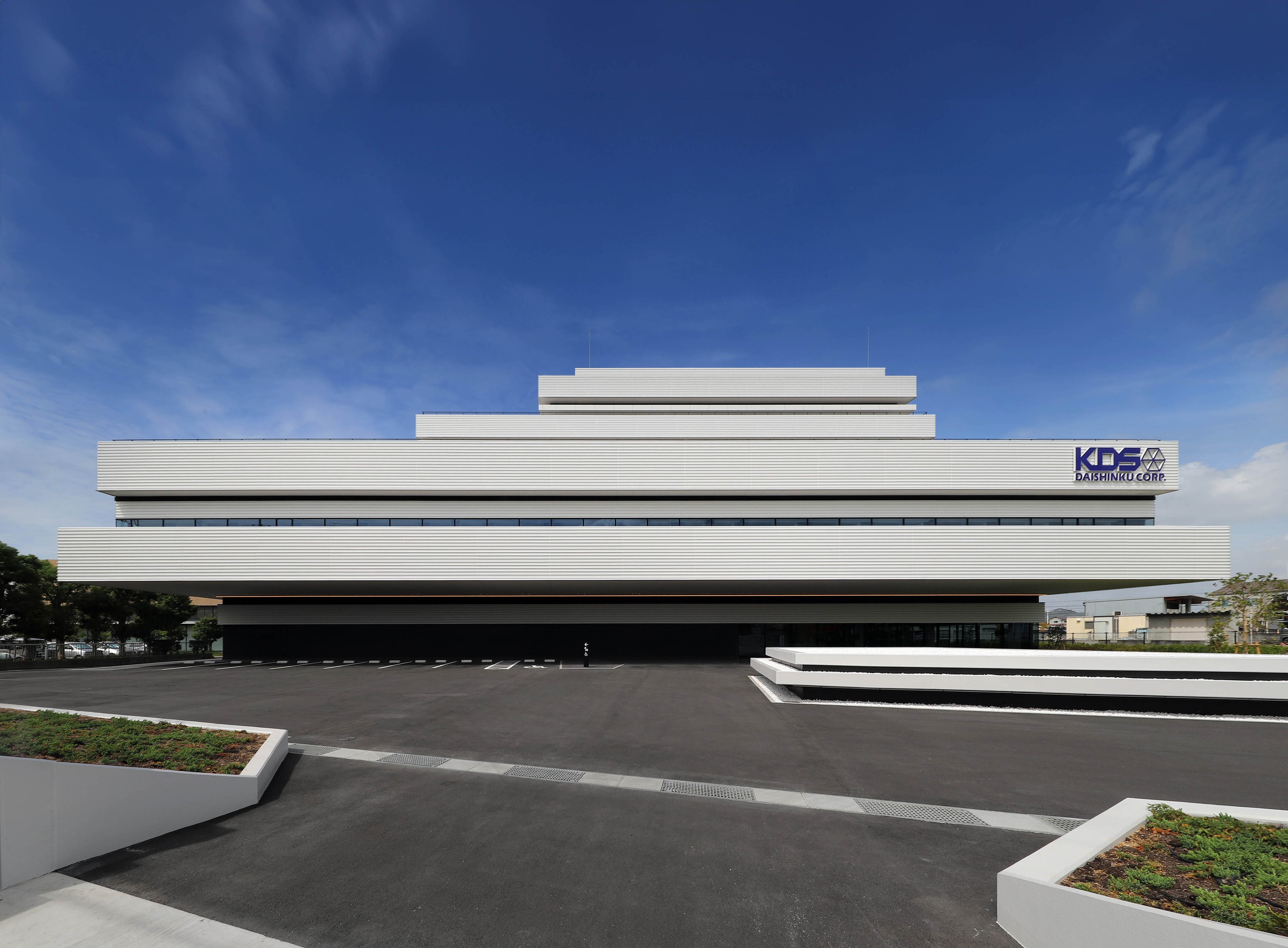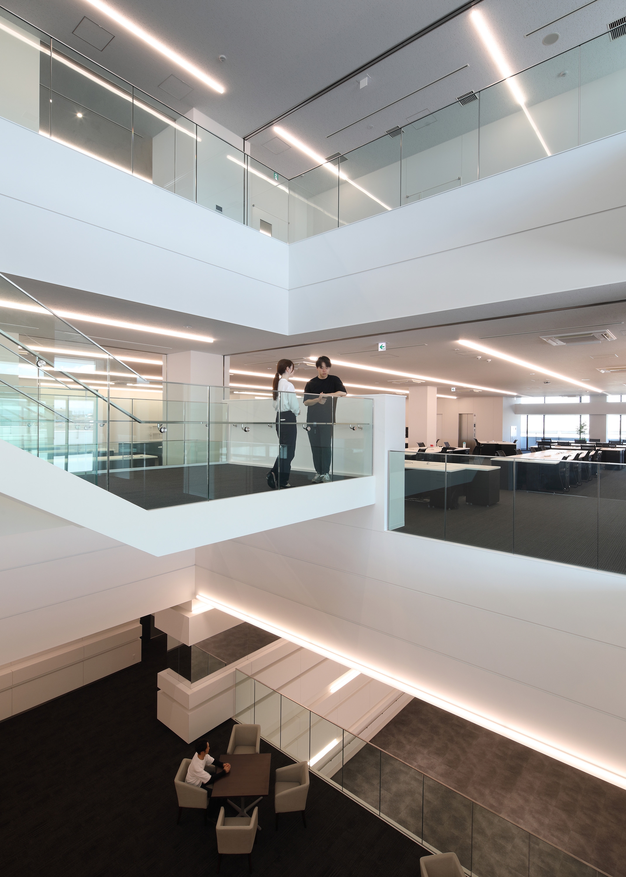 DAISHINKU CORP. is a leading Japanese manufacturer of quartz devices. This project creates a smart factory integrating headquarters and plant functions on a site. The exterior design, inspired by stacked crystal chips, features five layered rectangular volumes of different sizes, symbolizing DAISHINKU’s technological innovation and growth.?A crystal chip’s frequency characteristics depend on its thickness and angle. The architectural design emphasizes this by layering volumes of varying thicknesses, shaping a space that embodies the identity of DAISHINKU. This concept extends to the interior space. Each floor is organized around an atrium pierced through the center, with natural light from the skylight spreading across each layer. This stimulates encounters and communication among workers on different floors. The line lighting, based on unique angles, intricately combines to create a lighting environment that embodies the identity of DAISHINKU. This holistic design integrates architecture, interior, and lighting, reinforcing DAISHINKU’s commitment to innovation while providing a symbolic and immersive spatial experience.
