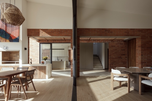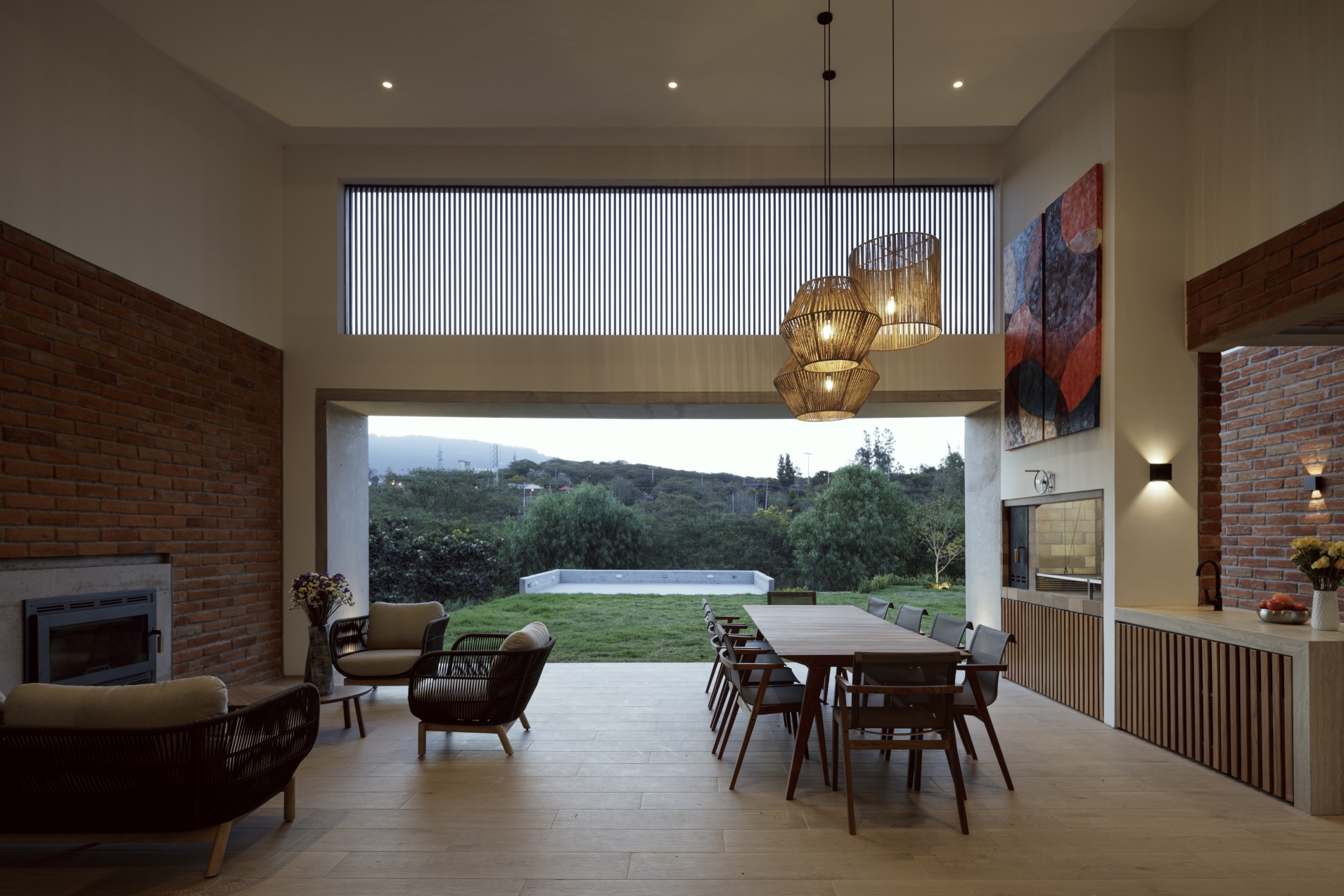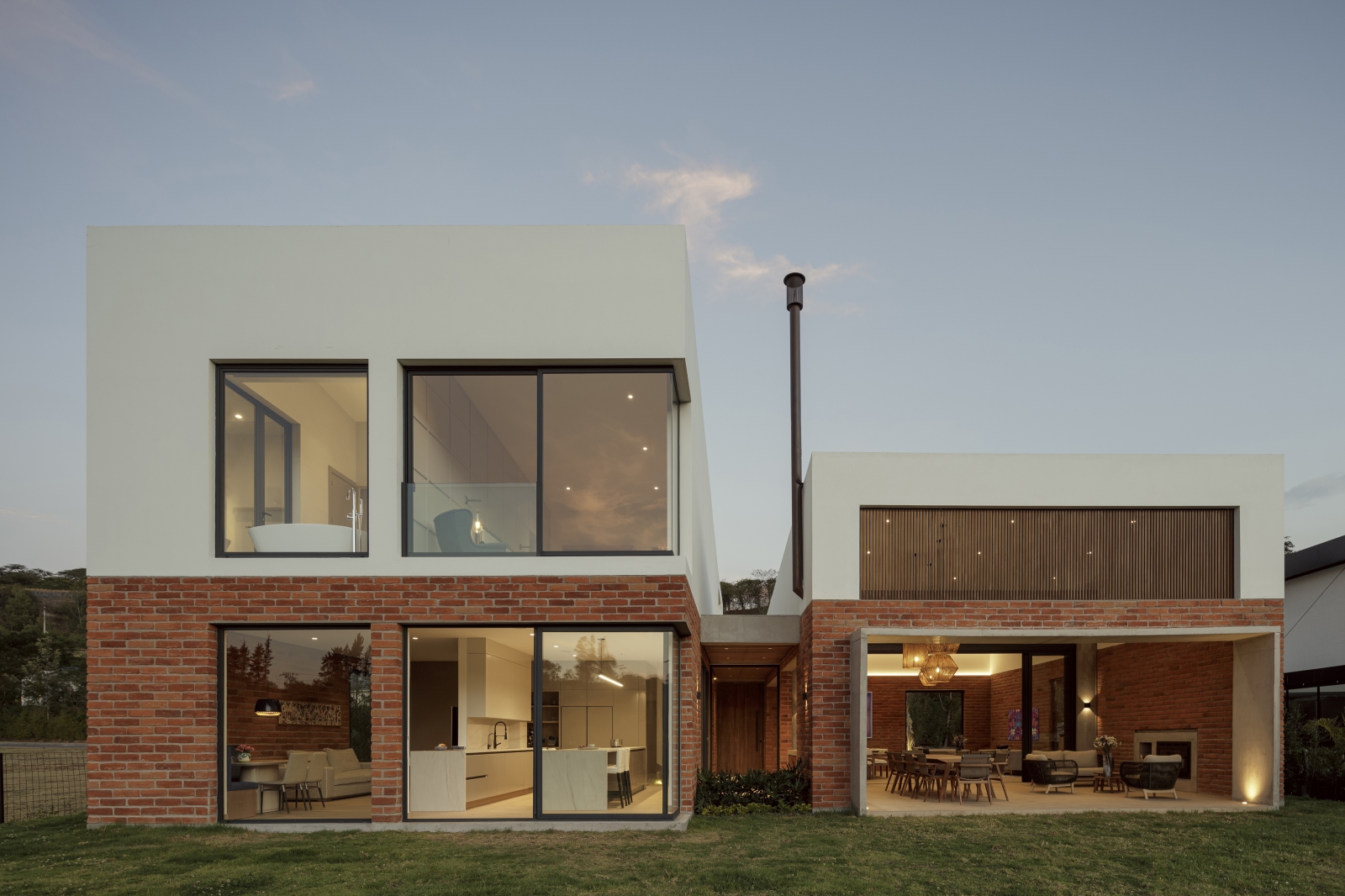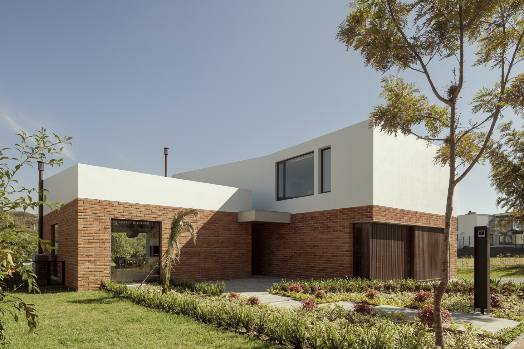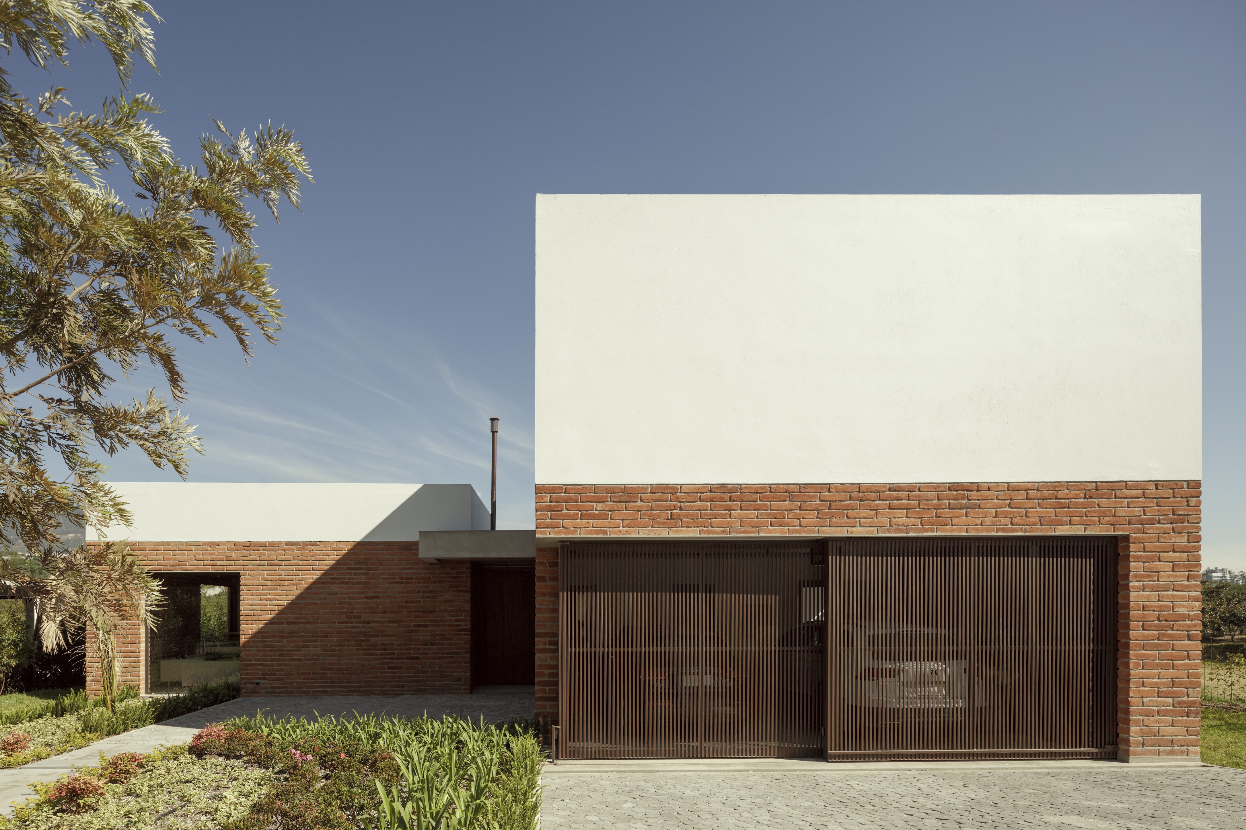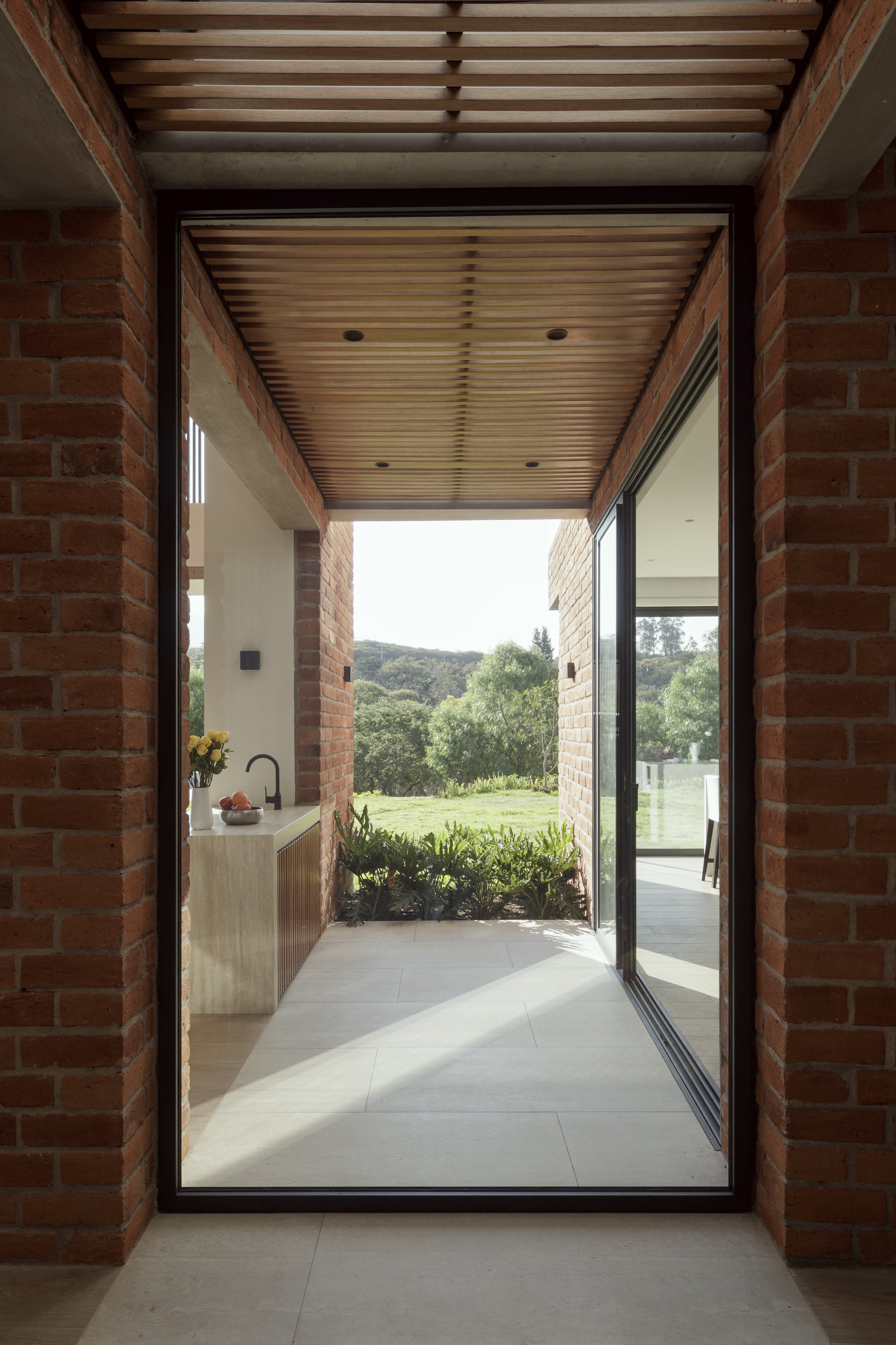 The home’s structural design is acutely informed by its location—oriented West to capture views of mountain vistas and harness the warmth of the afternoon sun. The brick materiality absorbs and radiates heat as temperatures lower, while white stucco helps reflect and mediate the intense sunlight. To temper the harsh equatorial rays, a tall vertical wooden screen was added to filter excess sun while preserving natural light.