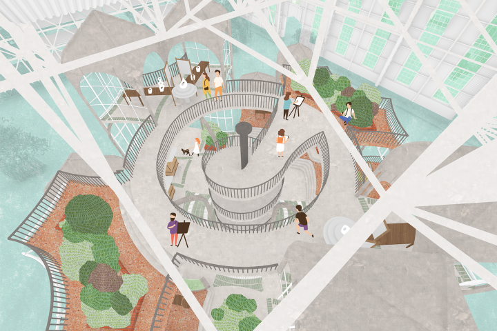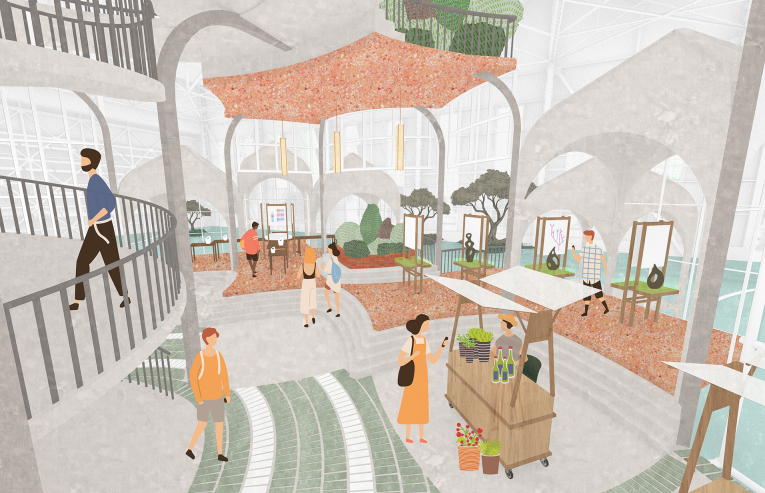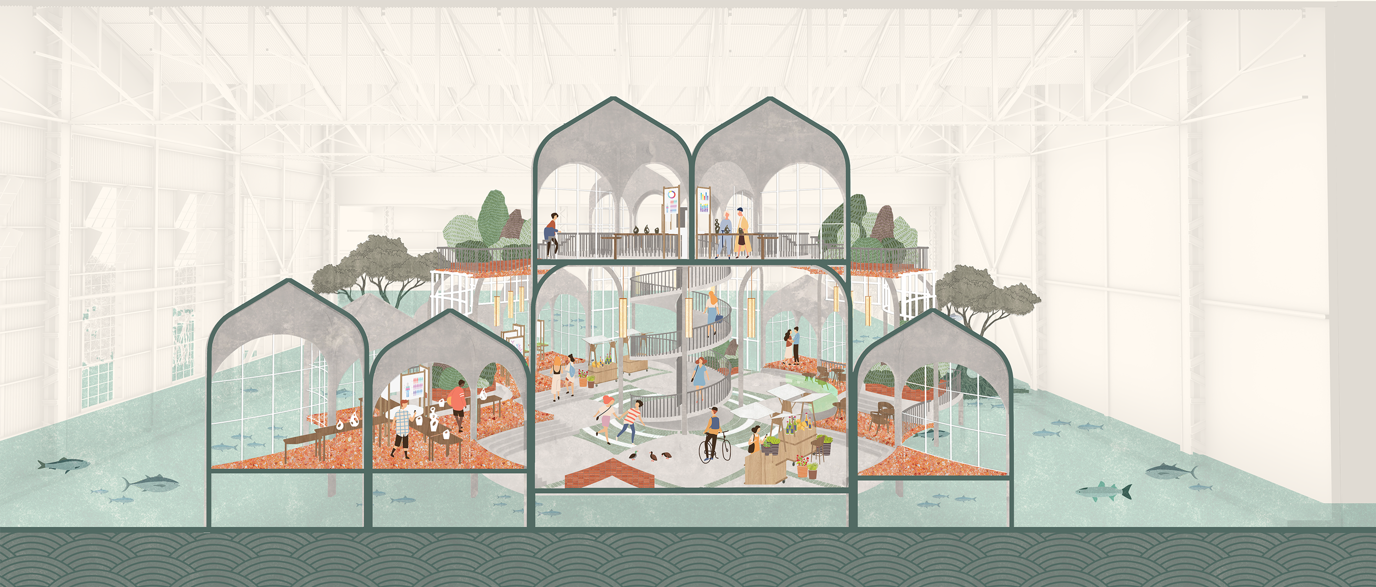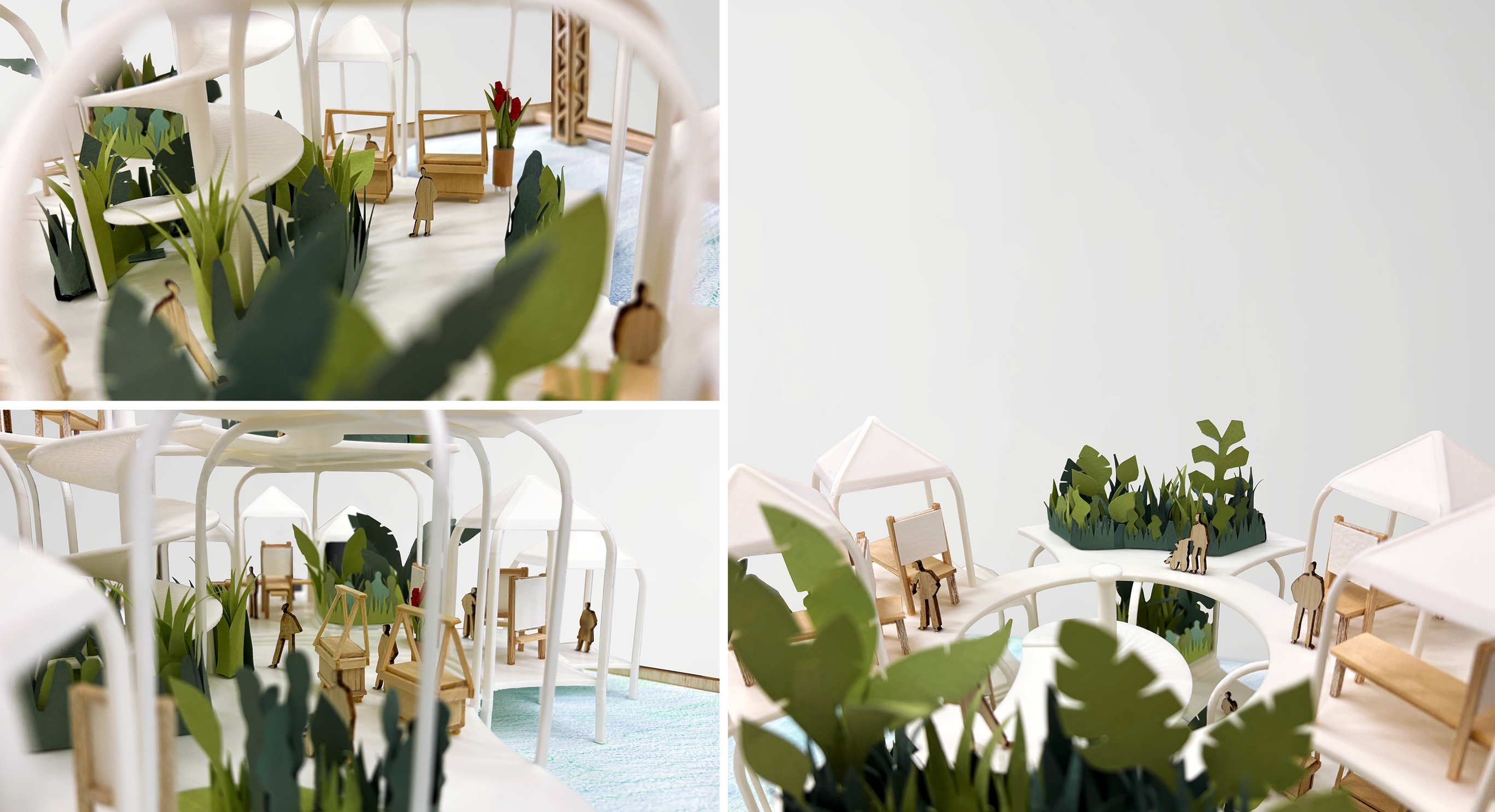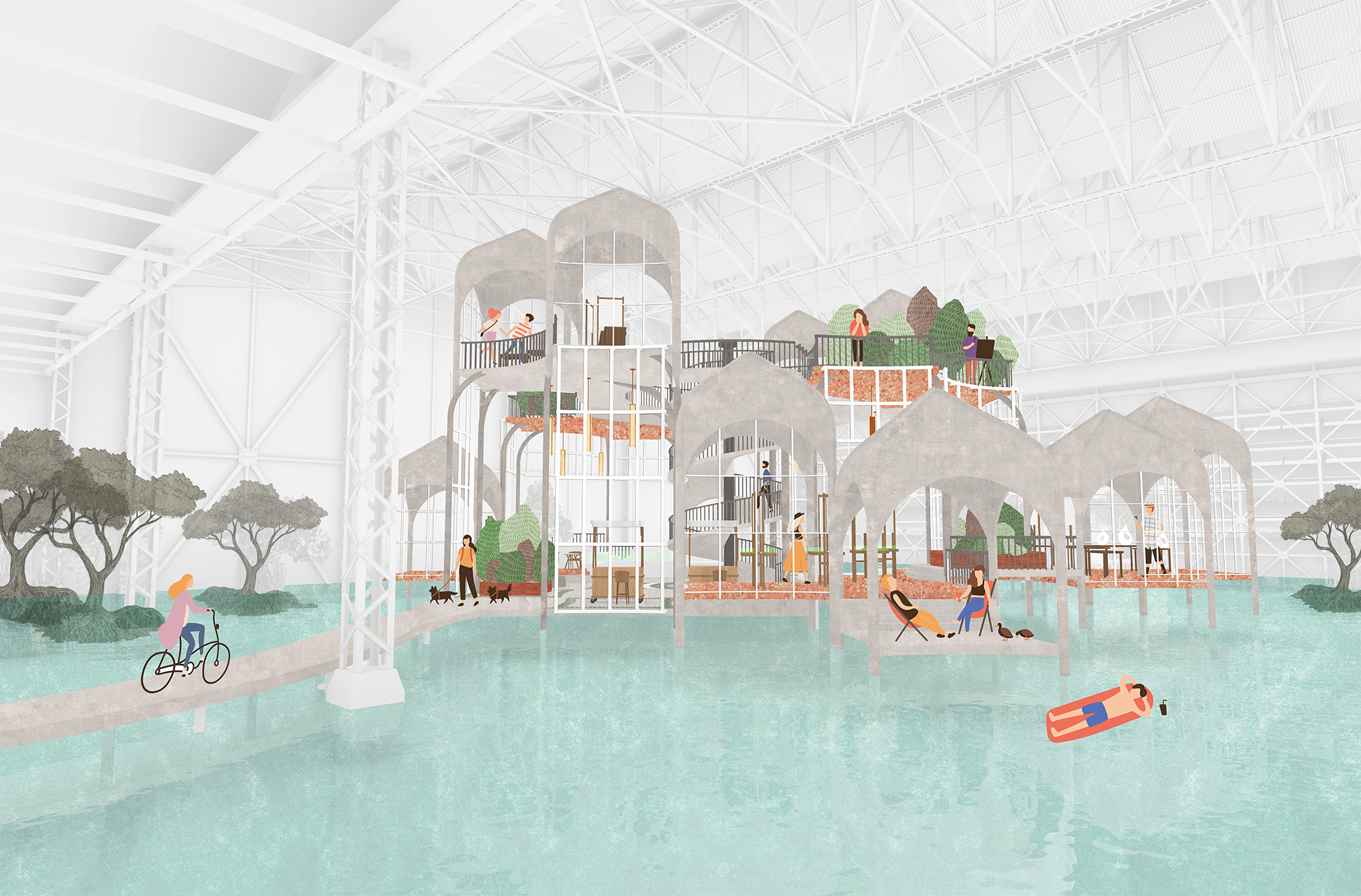 Inspired by the site’s history as a mangrove swamp, the design reinterprets the natural language of roots into architecture. Willowy structures rise like roots seeking the sky, forming dome-like enclosures that suggest both openness and shelter, while water gently floods the hangar- blurring boundaries between past and present.