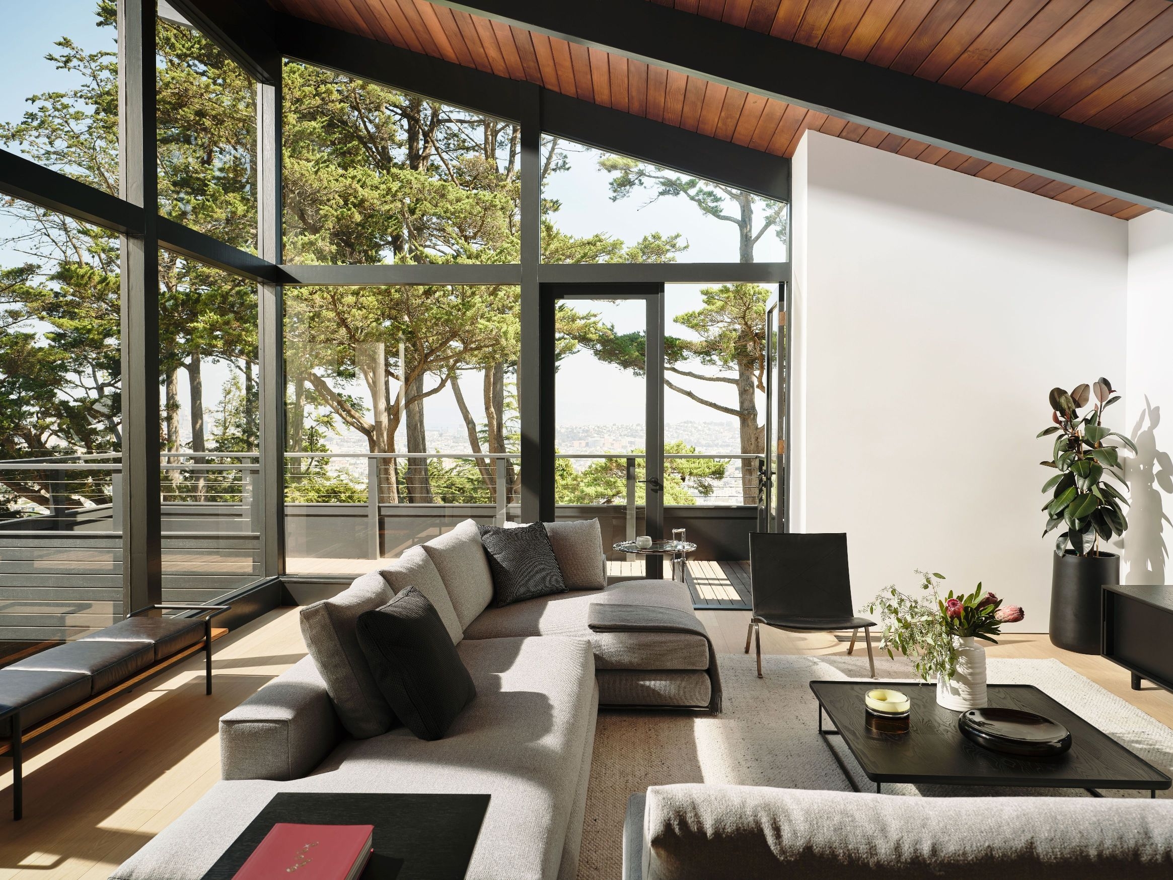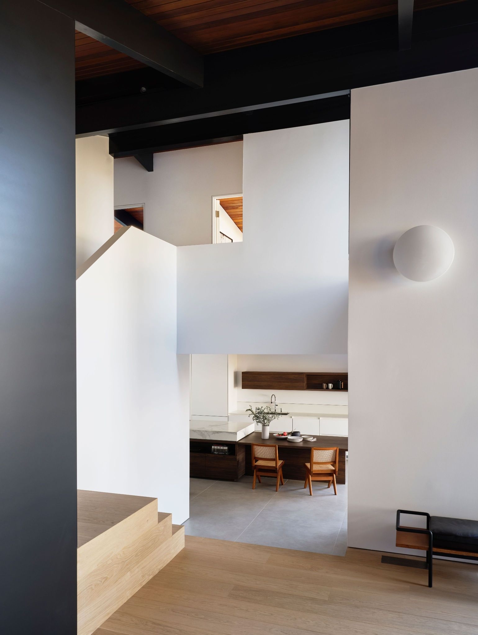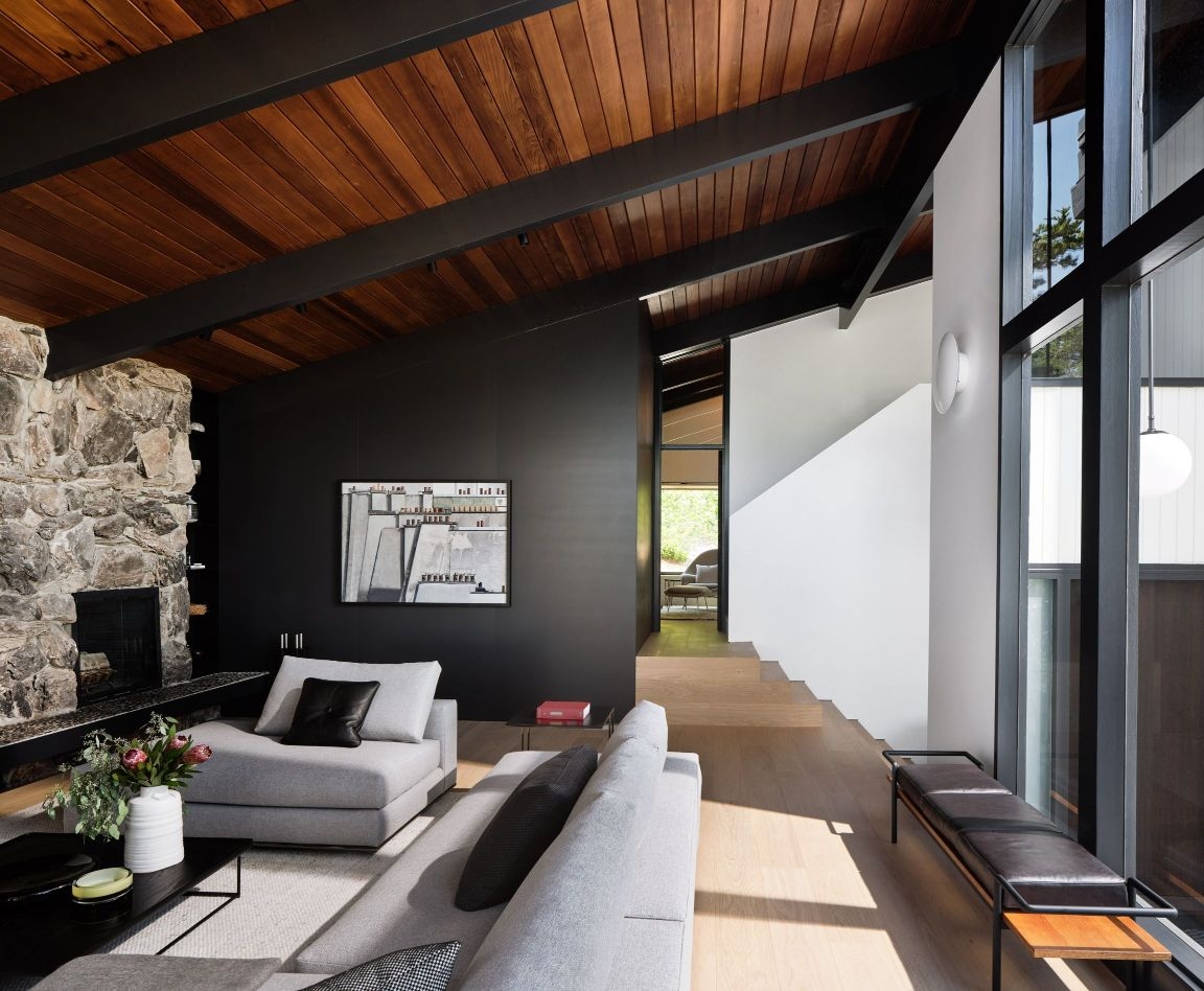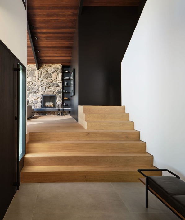 The Beacon House involves a comprehensive yet surgical renovation of a 1960s home. It had retained its midcentury modern components, but needed drastic updating. Surprising programmatic solutions were devised for requirements like a dedicated office—like switching the primary bedroom for an office, thus maximizing views the clients would actually use while awake—and removing hallways for a pinwheel plan. The entry’s stadium seating leads to the living room, using the compression of the foyer and then expansion of the double-height ceilings to create a Wright-inspired feeling of transformation.