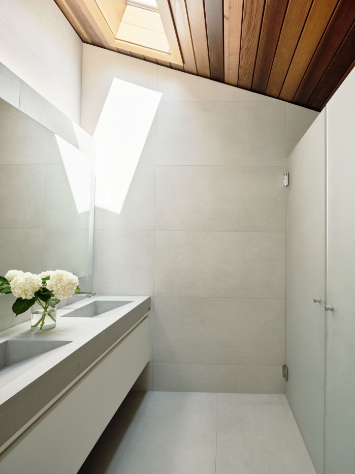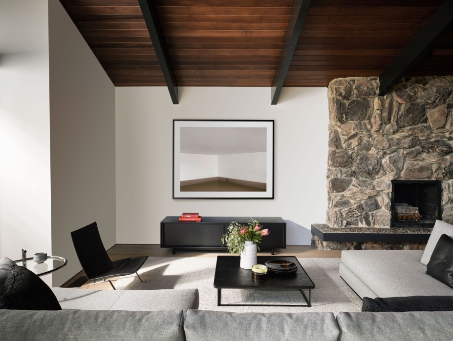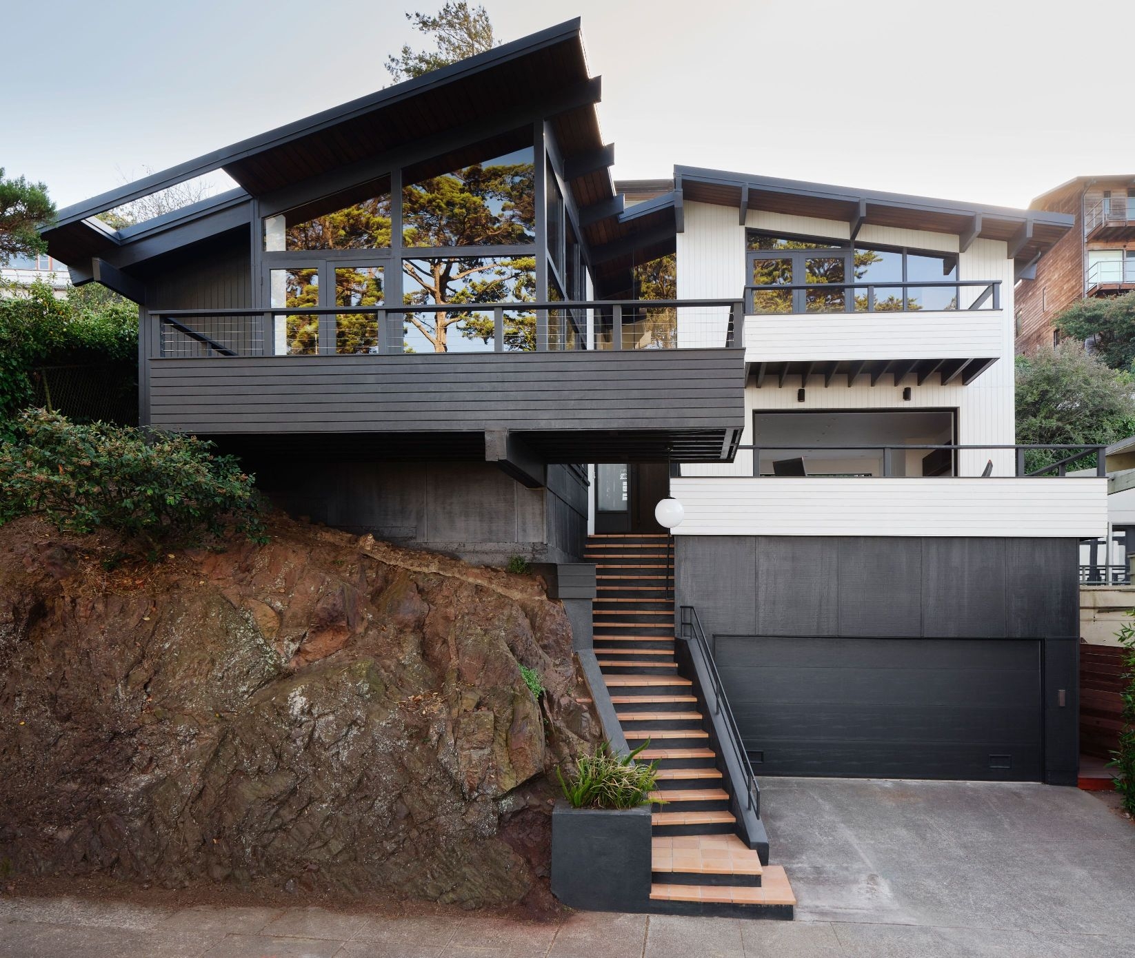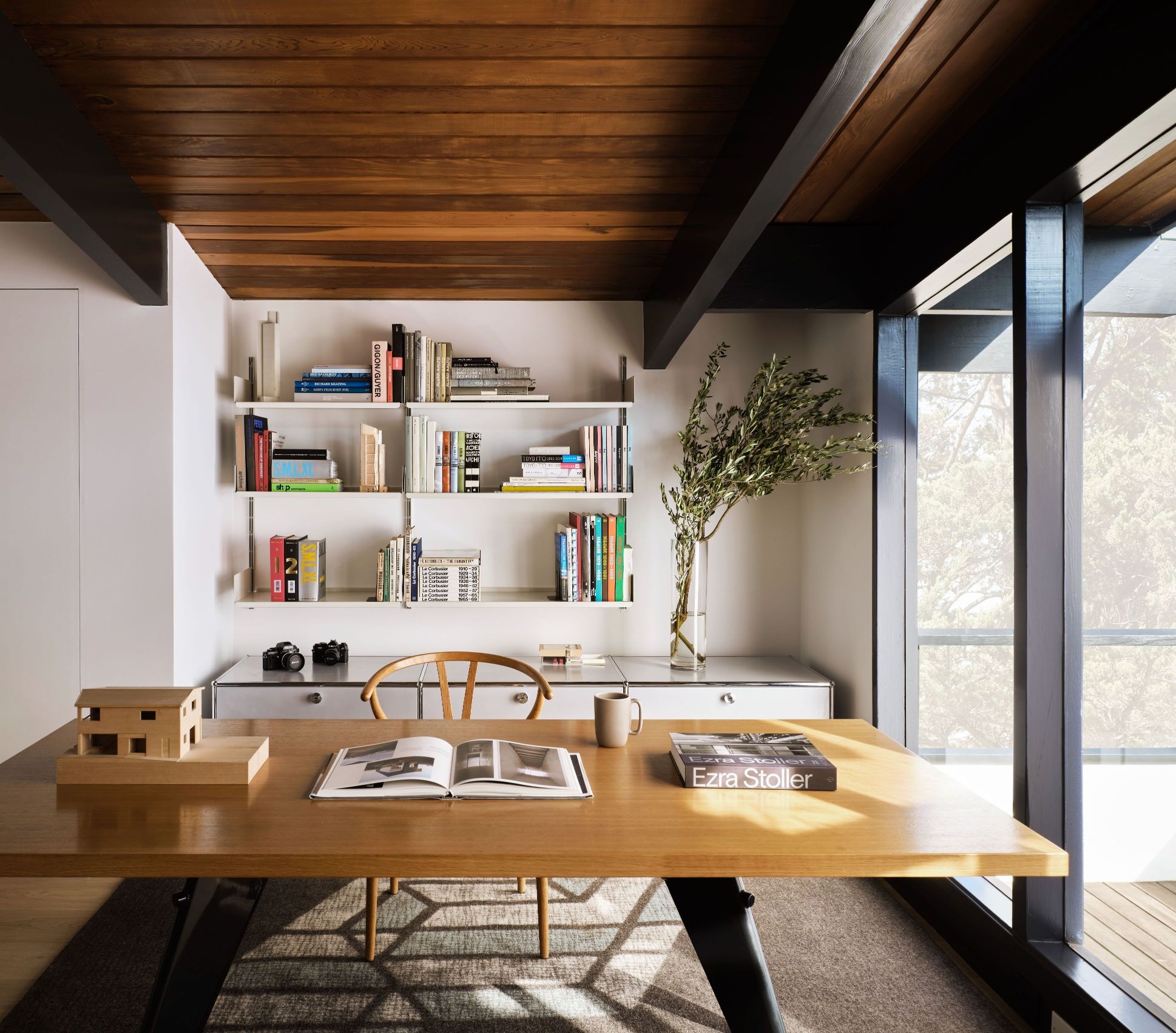 The Beacon House involves a comprehensive yet surgical renovation of a 1960s home. It had retained its midcentury modern components, but needed drastic updating. Surprising programmatic solutions were devised for requirements like a dedicated office—like switching the primary bedroom for an office, thus maximizing views the clients would actually use while awake—and removing hallways for a pinwheel plan. The entry’s stadium seating leads to the living room, using the compression of the foyer and then expansion of the double-height ceilings to create a Wright-inspired feeling of transformation.