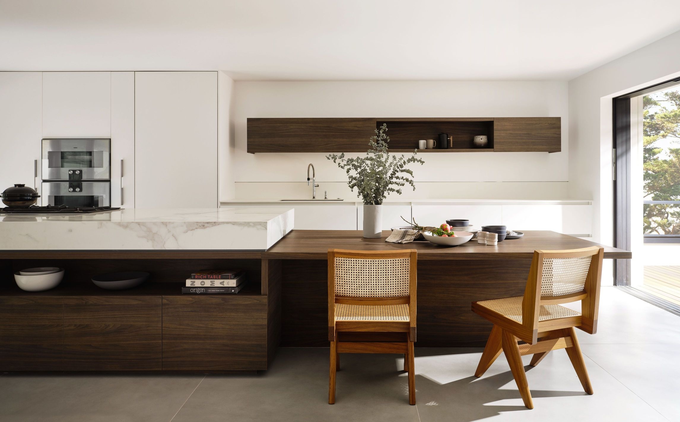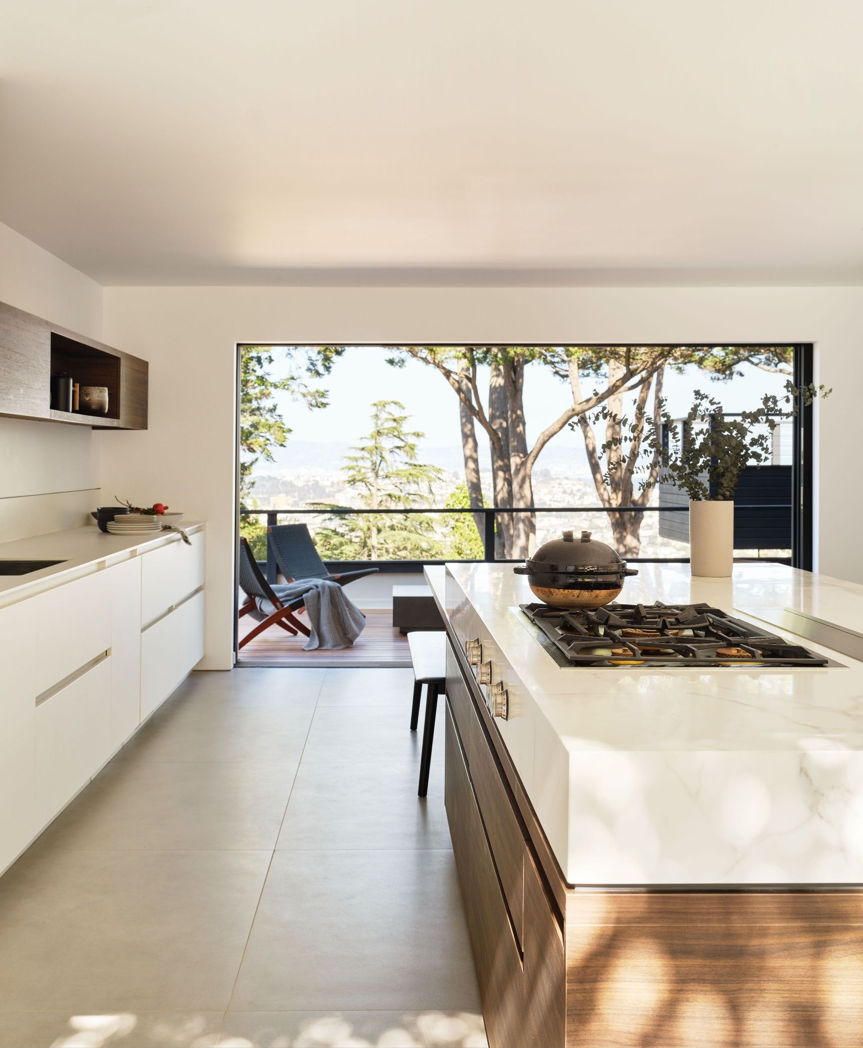 The architects exploded the original plan, opening up the connections between spaces, and forgoing a traditional dining room in favor of a kitchen island that works as a dining table. Another key move was transforming a set of French doors into a pocket sliding door that opens the space up to the deck, and is also reflected by another pocket sliding window door in the kitchen.