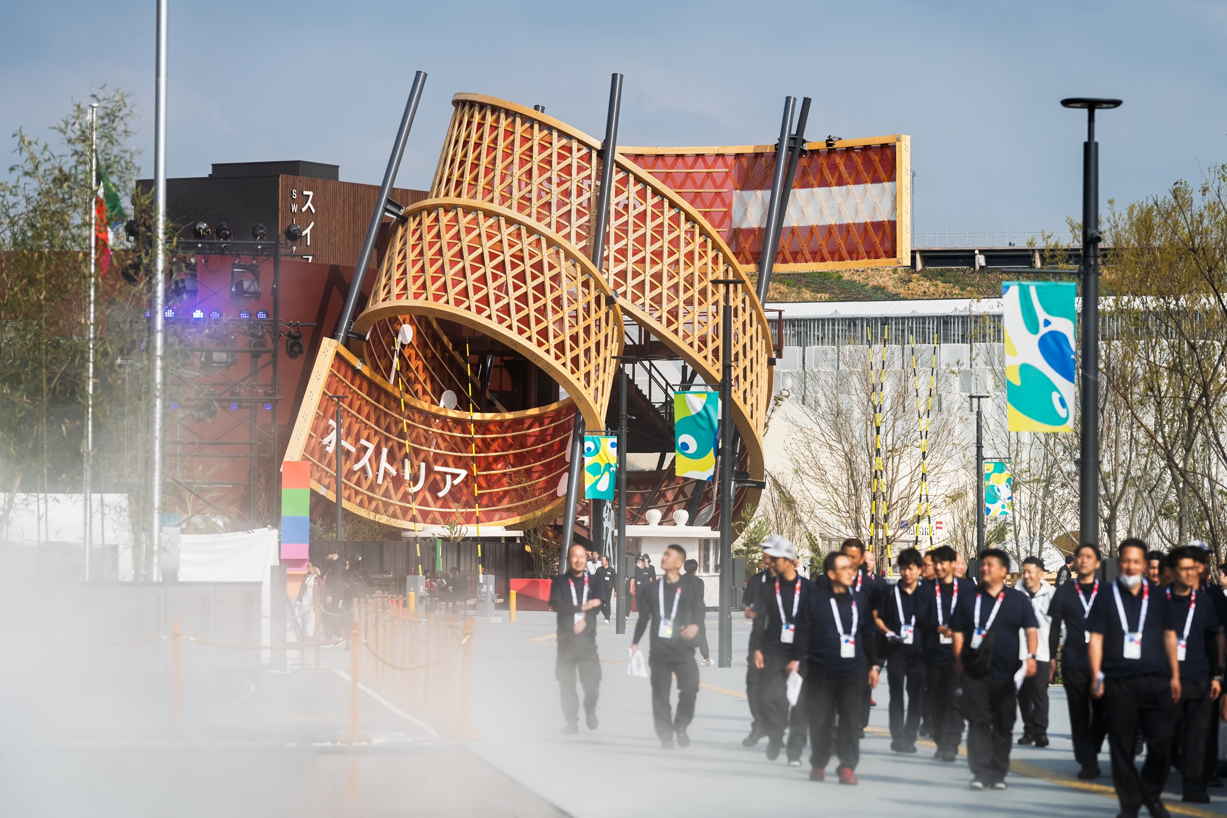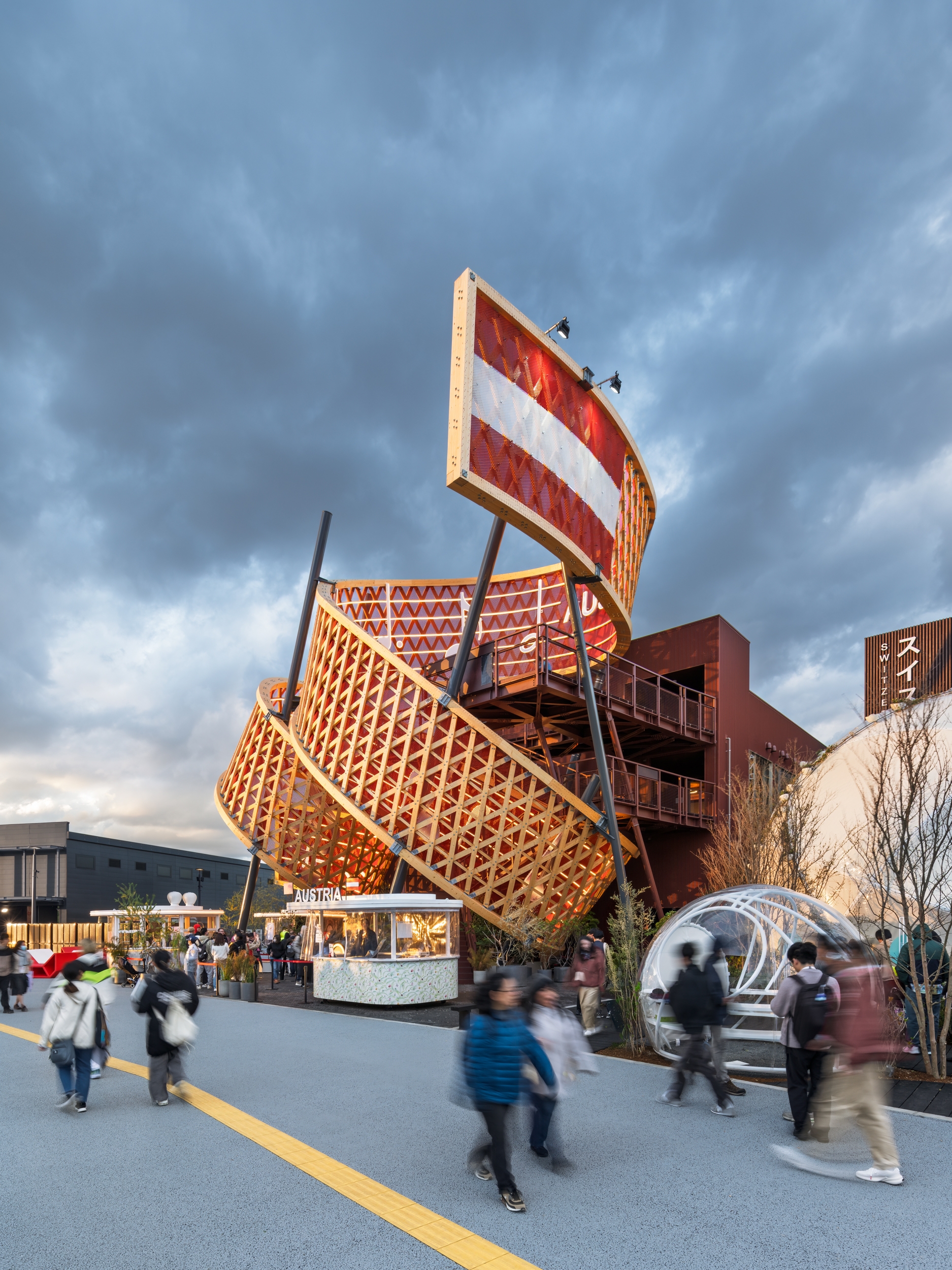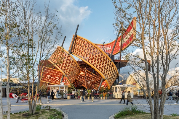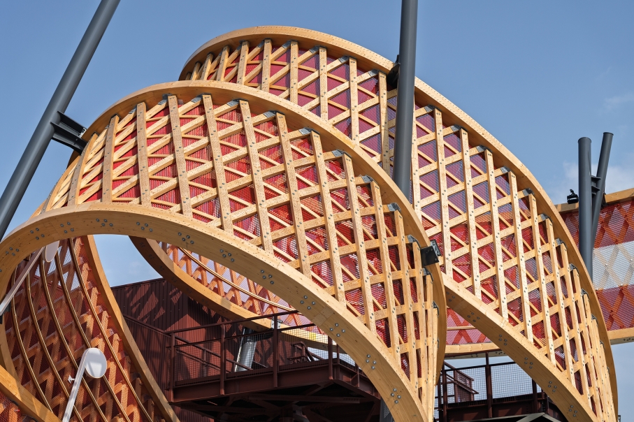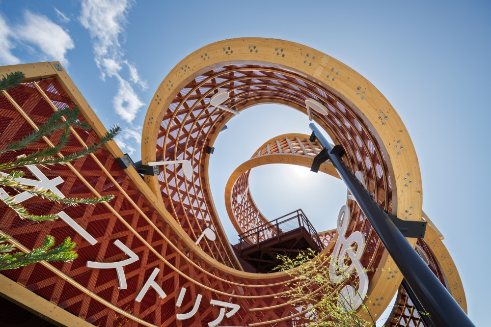 In the forecourt of the pavilion an iconic spiral sculpture rises dramatically into the air, serving as the visual centrepiece. The 91m-long, 4.3m-wide “ribbon” consists of an upper and a lower edge that are interlaced with 265 diagonal struts. The double-looped form is supported by 5 steel pylons and rises to a height of 16m. The inner surface is designed as a musical staff featuring the opening bars of Beethoven’s Ode to Joy. On the outside, the bare timber construction is on full display.
