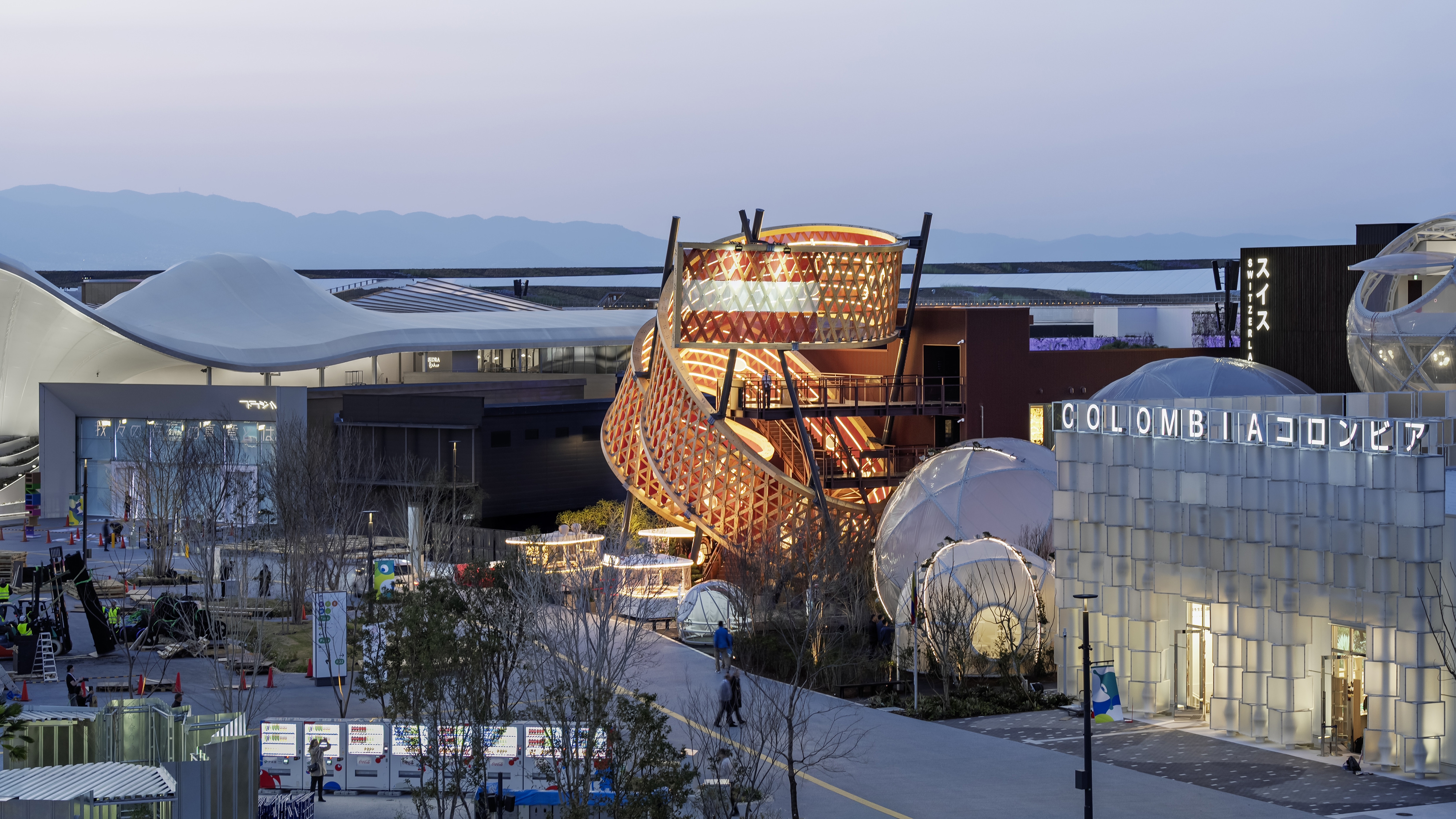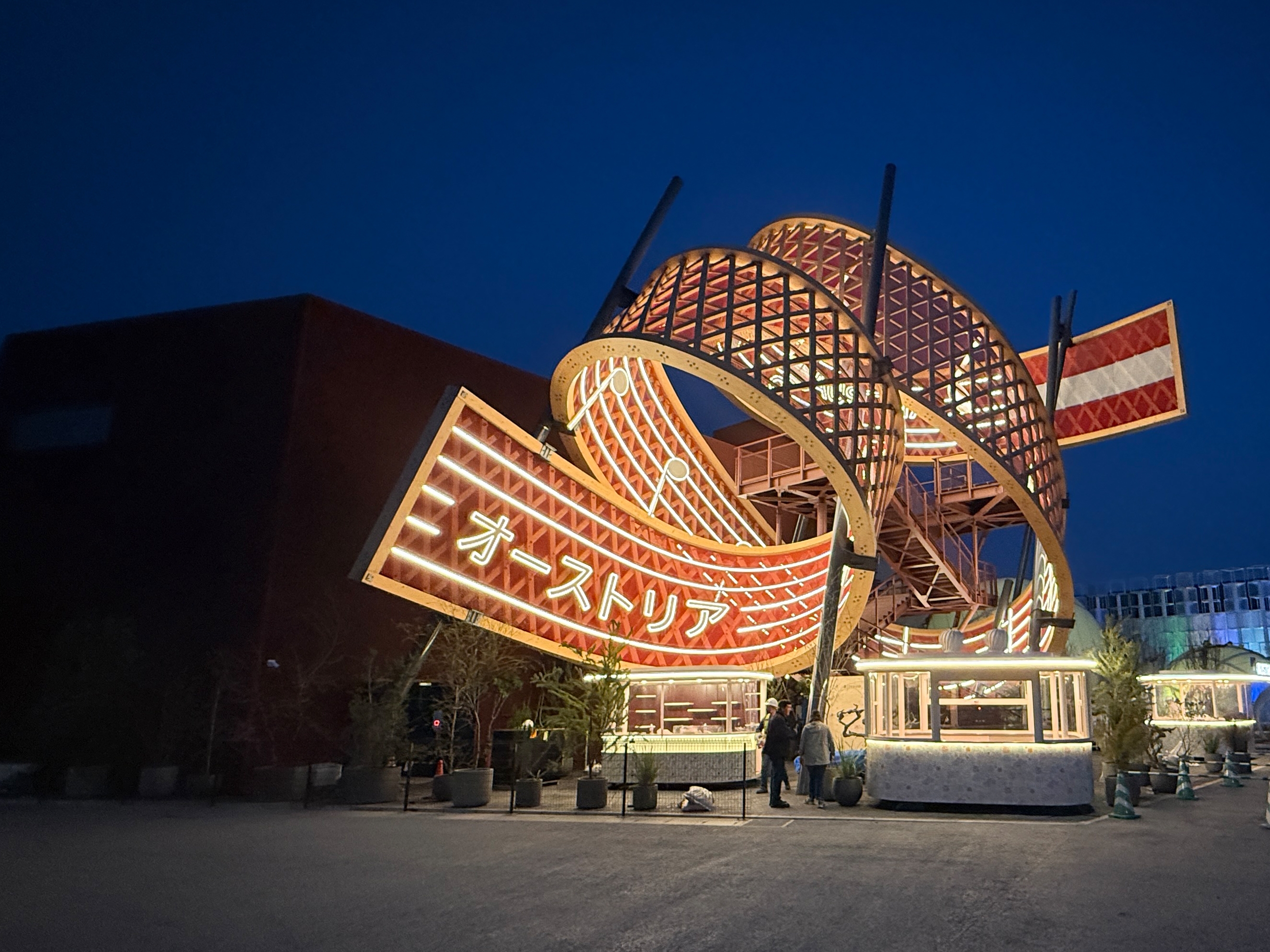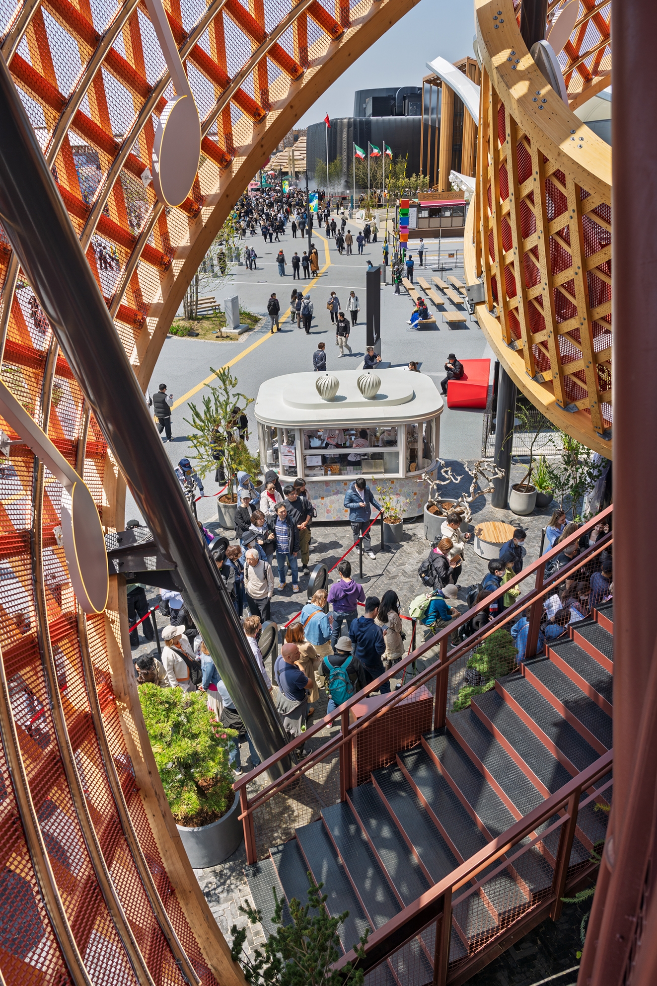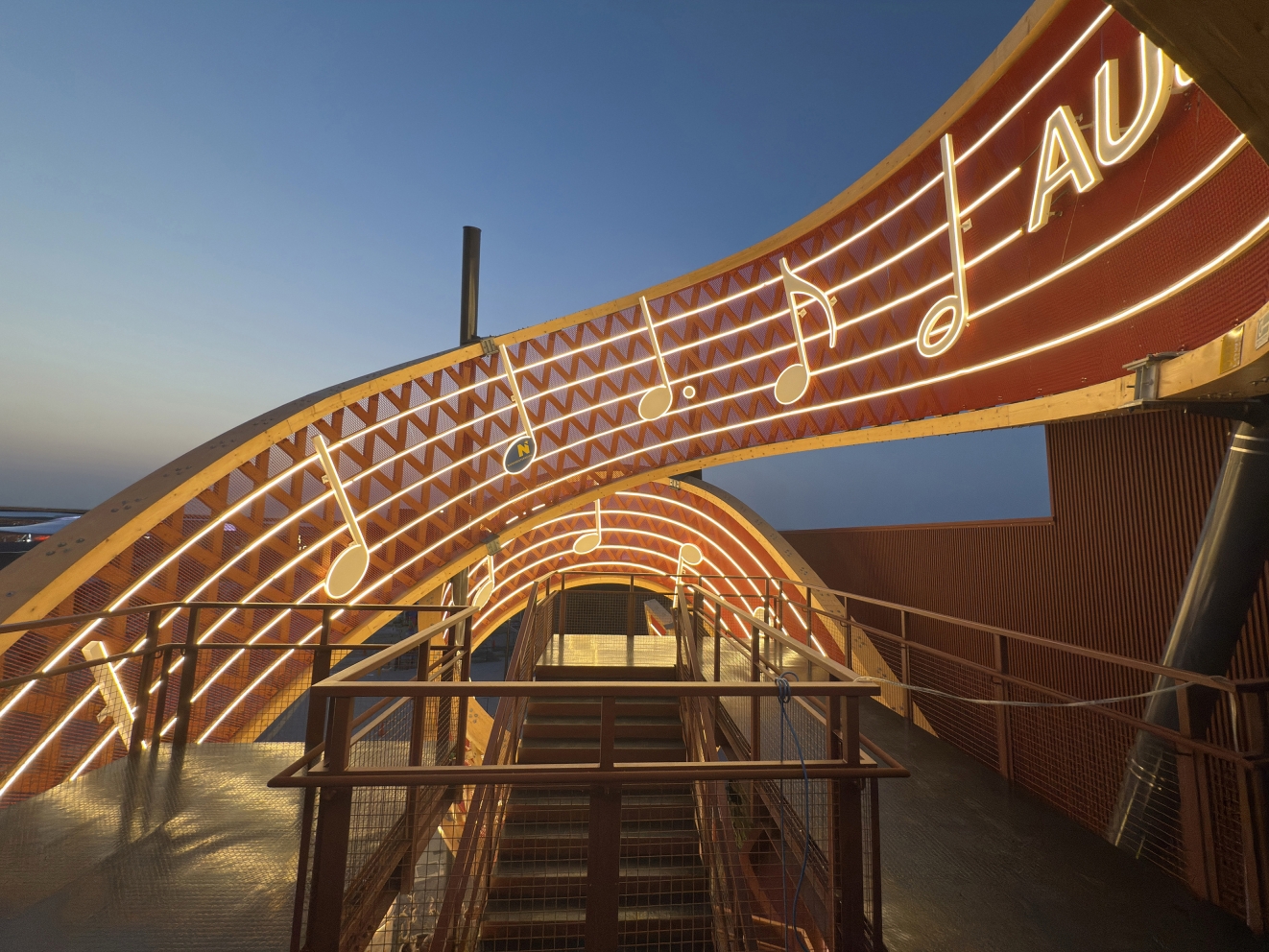 In the forecourt of the pavilion an iconic spiral sculpture rises dramatically into the air, serving as the visual centrepiece. The 91m-long, 4.3m-wide “ribbon” consists of an upper and a lower edge that are interlaced with 265 diagonal struts. The double-looped form is supported by 5 steel pylons and rises to a height of 16m. The inner surface is designed as a musical staff featuring the opening bars of Beethoven’s Ode to Joy. On the outside, the bare timber construction is on full display.
