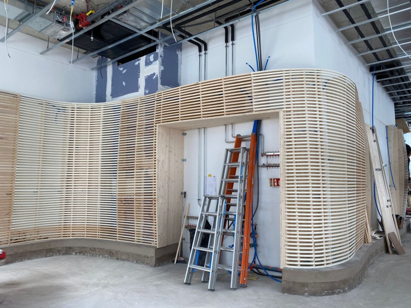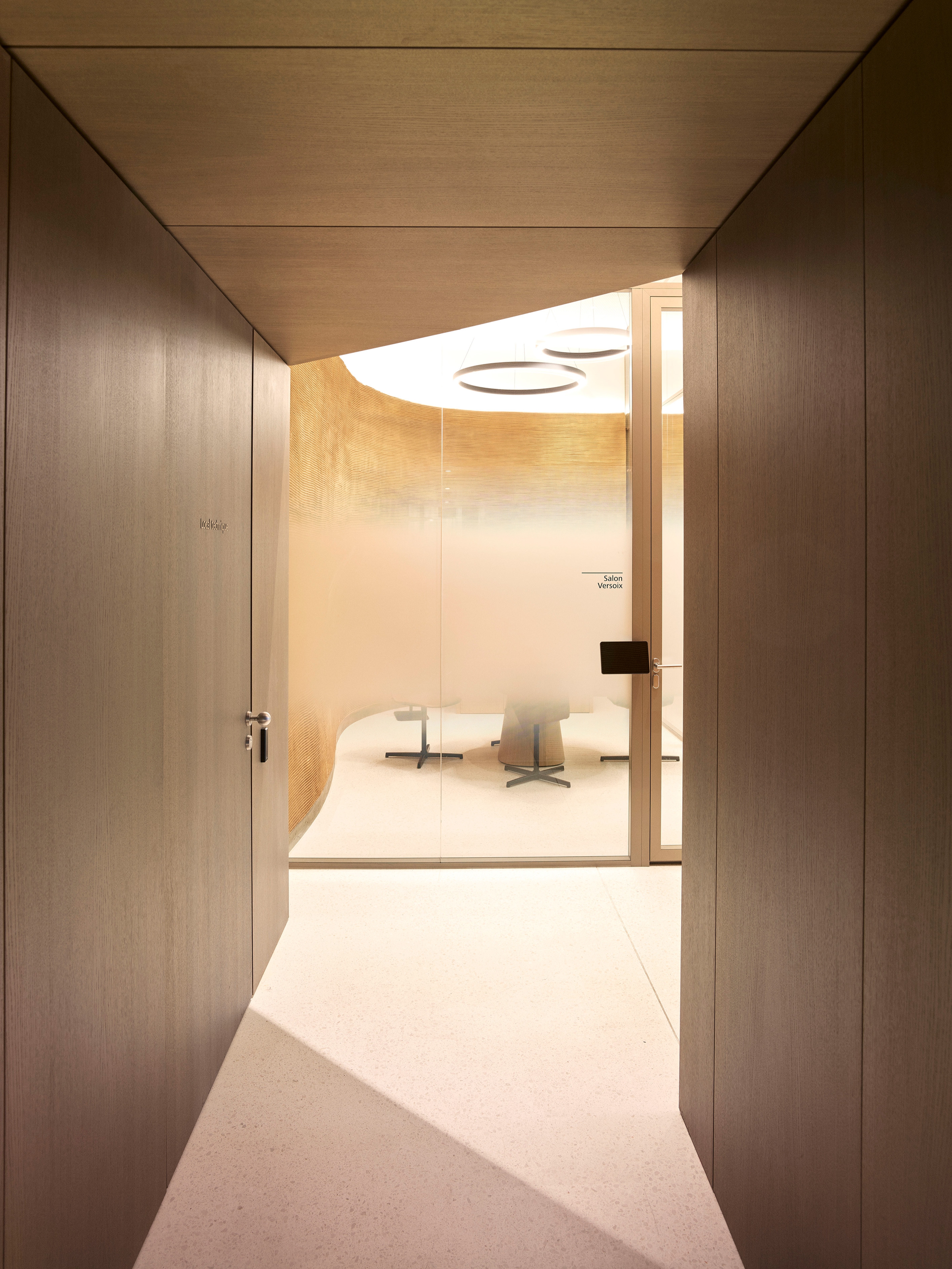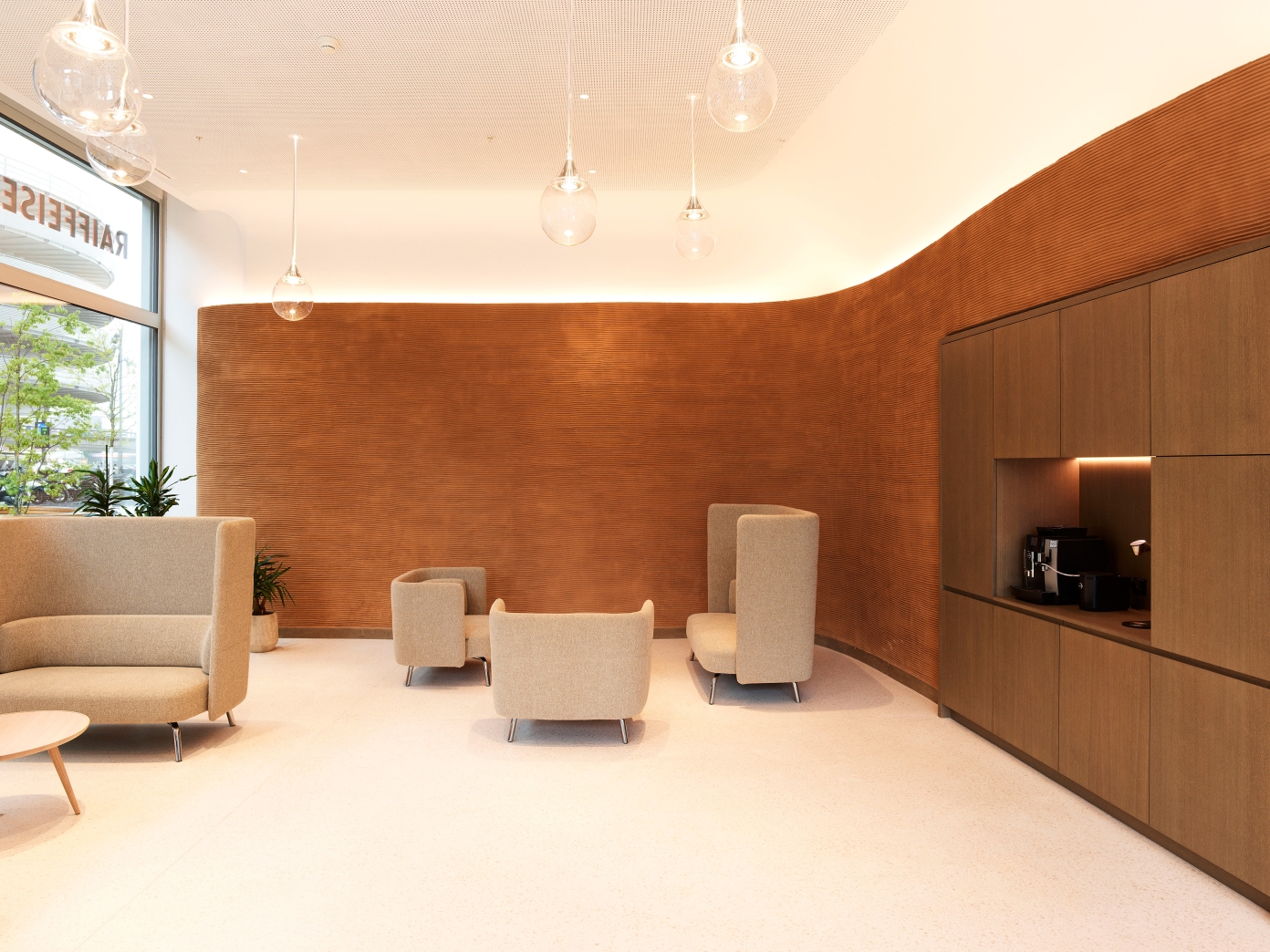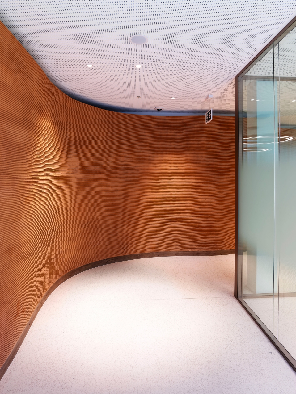 The architecture challenges the fortress-like image of banks, opting instead for openness and community. The wall connects reception, meeting rooms, offices, lounges, and a green zone. Naturally regulating humidity and sound, it fosters comfort and focus.